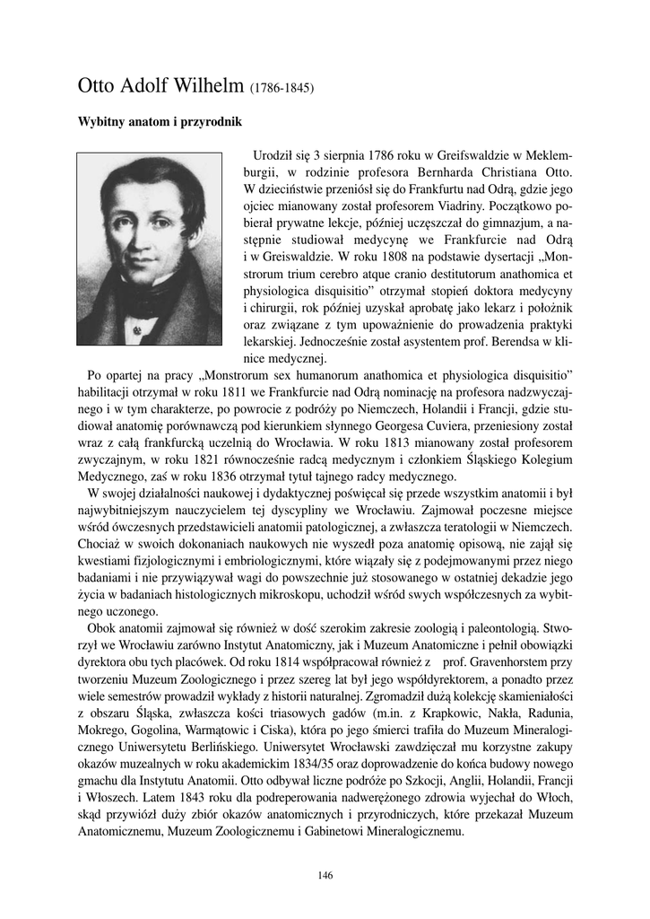 Otto Adolf Wilhelm (1786−1845) Wybitny anatom i przyrodnik Urodził się 3 sierpnia 1786 roku w Greifswaldzie w Meklem− burgii, w rodzinie profesora Bernharda Christiana Otto. W dzieciństwie przeniósł się do Frankfurtu nad Odrą, gdzie jego ojciec mianowany został profesorem Viadriny. Początkowo po− bierał prywatne lekcje, później uczęszczał do gimnazjum, a na− stępnie studiował medycynę we Frankfurcie nad Odrą i w Greiswaldzie. W roku 1808 na podstawie dysertacji „Mon− strorum trium cerebro atque cranio destitutorum anathomica et physiologica disquisitio” otrzymał stopień doktora medycyny i chirurgii, rok później uzyskał aprobatę jako lekarz i położnik oraz związane z tym upoważnienie do prowadzenia praktyki lekarskiej. Jednocześnie został asystentem prof. Berendsa w kli− nice medycznej. Po opartej na pracy „Monstrorum sex humanorum anathomica et physiologica disquisitio” habilitacji otrzymał w roku 1811 we Frankfurcie nad Odrą nominację na profesora nadzwyczaj− nego i w tym charakterze, po powrocie z podróży po Niemczech, Holandii i Francji, gdzie stu− diował anatomię porównawczą pod kierunkiem słynnego Georgesa Cuviera, przeniesiony został wraz z całą frankfurcką uczelnią do Wrocławia. W roku 1813 mianowany został profesorem zwyczajnym, w roku 1821 równocześnie radcą medycznym i członkiem Śląskiego Kolegium Medycznego, zaś w roku 1836 otrzymał tytuł tajnego radcy medycznego. W swojej działalności naukowej i dydaktycznej poświęcał się przede wszystkim anatomii i był najwybitniejszym nauczycielem tej dyscypliny we Wrocławiu. Zajmował poczesne miejsce wśród ówczesnych przedstawicieli anatomii patologicznej, a zwłaszcza teratologii w Niemczech. Chociaż w swoich dokonaniach naukowych nie wyszedł poza anatomię opisową, nie zajął się kwestiami fizjologicznymi i embriologicznymi, które wiązały się z podejmowanymi przez niego badaniami i nie przywiązywał wagi do powszechnie już stosowanego w ostatniej dekadzie jego życia w badaniach histologicznych mikroskopu, uchodził wśród swych współczesnych za wybit− nego uczonego. Obok anatomii zajmował się również w dość szerokim zakresie zoologią i paleontologią. Stwo− rzył we Wrocławiu zarówno Instytut Anatomiczny, jak i Muzeum Anatomiczne i pełnił obowiązki dyrektora obu tych placówek. Od roku 1814 współpracował również z prof. Gravenhorstem przy tworzeniu Muzeum Zoologicznego i przez szereg lat był jego współdyrektorem, a ponadto przez wiele semestrów prowadził wykłady z historii naturalnej. Zgromadził dużą kolekcję skamieniałości z obszaru Śląska, zwłaszcza kości triasowych gadów (m.in. z Krapkowic, Nakła, Radunia, Mokrego, Gogolina, Warmątowic i Ciska), która po jego śmierci trafiła do Muzeum Mineralogi− cznego Uniwersytetu Berlińskiego. Uniwersytet Wrocławski zawdzięczał mu korzystne zakupy okazów muzealnych w roku akademickim 1834/35 oraz doprowadzenie do końca budowy nowego gmachu dla Instytutu Anatomii. Otto odbywał liczne podróże po Szkocji, Anglii, Holandii, Francji i Włoszech. Latem 1843 roku dla podreperowania nadwerężonego zdrowia wyjechał do Włoch, skąd przywiózł duży zbiór okazów anatomicznych i przyrodniczych, które przekazał Muzeum Anatomicznemu, Muzeum Zoologicznemu i Gabinetowi Mineralogicznemu. 146 Był członkiem wielu towarzystw naukowych, a w lutym 1820 roku przyjęty został w poczet Leopoldyńsko−Karolińskiej Akademii Przyrodników (Matrikel No. 1166), przybierając przy− domek „Poli”. W październiku 1843 w uznaniu zasług odznaczony został Czerwonym Orłem III Kl. z wstęgą. W roku 1844 pojawiły się u niego pierwsze objawy ciężkiej choroby wątroby, w wyniku której zmarł we Wrocławiu 14 stycznia 1845 roku. Na jego cześć paleontolodzy nadali nazwy kilku skamieniałościom, m.in. Hermann von Meyer triasowej rybie nadał nazwę Cenchrodus ottoi, zaś Hans Bruno Geinitz kredowemu małżowi nazwę Cardium ottoi. Ważniejsze prace: 1813 – Handbuch der pathologische Anatomie des Menschen und der Thiere. Breslau. 1816 – Seltene Beobachtungen zur Anatomie, Physiologie und Pathologie gehörig. Breslau. 1820 – Über eine neue Roche (Propterygia hyposticta) und eine gleichfalls neue Molluske (Diphyllida lineata). Nova Acta Phys. Med. Nat. Cur. 10. 1821 – Conspectus animalium quorundam maritimorum nondum editorum pars prior. Vratisla− viae. 1823 – Beschreibung einiger neuen Mollusken und Zoophyten. Nova Acta Phys. Med. Nat. Cur. 11. 1824 – Neue seltene Beobachtungen zur Anatomie, Physiologie und Pathologie gehörig. Berlin. 1825 – Über eine neue Affenart, den Cercopithecus leucoprymnus. Nova Acta Phys. Med. Nat. Cur. 12. 1825 – Über eine neue Antilopenart, die Antilope suturosa. Ibid. 1826 – De animalium quorundam, per hiemem dormientium, vasis cephalis et aure interna. Ibid. 13. 1826 – Beschreibung einiger neuen, in den Jahre 1818 und 1819 im mittelländischen Meere gefundenen Crustaceen. Ibid. 1826 – Über die Vivera hermaphrodita Pallas oder die Platyschista Pallasii mihi. Ibid. 1826 – Verzeichniss der anatomische Präparatensammlungen des Königliche Anatomie−Institut zu Breslau. Breslau. 1826 – Über die Gehörorgane des Lepidoleprus trachyrhynchus und caelorrhynchus. Zeitschrift für Physiologie 2, 1. 1827 – Über ein Rudiment vom Becken bei eine Forellenart. Ibid. 2, 2. 1830 – Erster Nachtrag zu der Verzeichniss der anatomische Präparatensammlungen des Königliche Anatomie−Institut zu Breslau. Breslau. 1830 – Lehrbuch der pathologische Anatomie des Menschen und der Thiere. 1 Bd. Berlin. 1832 – Einige Bemerkungen über die Cholera im lebenden und todten Körper. Magazin für Heilkunde 36. 1833 – Zweiter Nachtrag zu der Verzeichniss der anatomische Präparatensammlungen des Köni− gliche Anatomie−Institut zu Breslau. Breslau. 1834 – Bericht über die Versammlung deutscher Naturforscher z