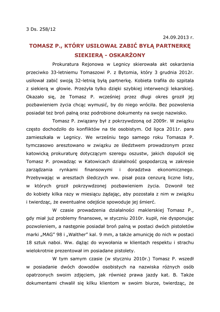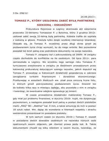 3 Ds. 258/12 24.09.2013 r. TOMASZ P., KTÓRY USIŁOWAŁ ZABIĆ BYŁĄ PARTNERKĘ SIEKIERĄ - OSKARŻONY Prokuratura Rejonowa w Legnicy skierowała akt oskarżenia przeciwko 33-letniemu Tomaszowi P. z Bytomia, który 3 grudnia 2012r. usiłował zabić swoją 32-letnią byłą partnerkę. Kobieta trafiła do szpitala z siekierą w głowie. Przeżyła tylko dzięki szybkiej interwencji lekarskiej. Okazało się, że Tomasz P. wcześniej przez długi okres groził jej pozbawieniem życia chcąc wymusić, by do niego wróciła. Bez pozwolenia posiadał też broń palną oraz podrobione dokumenty na swoje nazwisko. Tomasz P. związany był z pokrzywdzoną od 2009r. W związku często dochodziło do konfliktów na tle osobistym. Od lipca 2011r. para zamieszkała w Legnicy. We wrześniu tego samego roku Tomasza P. tymczasowo aresztowano w związku ze śledztwem prowadzonym przez katowicką prokuraturę dotyczącym szeregu oszustw, jakich dopuścił się Tomasz P. prowadząc w Katowicach działalność gospodarczą w zakresie zarządzania rynkami finansowymi i doradztwa ekonomicznego. Przebywając w aresztach śledczych ww. pisał poza cenzurą liczne listy, w których groził pokrzywdzonej pozbawieniem życia. Dzwonił też do kobiety kilka razy w miesiącu żądając, aby pozostała z nim w związku i twierdząc, że ewentualne odejście spowoduje jej śmierć. W czasie prowadzenia działalności maklerskiej Tomasz P., gdy miał już problemy finansowe, w styczniu 2010r. kupił, nie dysponując pozwoleniem, a następnie posiadał broń palną w postaci dwóch pistoletów marki „MAG” 98 i „Walther” kal. 9 mm, a także amunicję do nich w postaci 18 sztuk naboi. Ww. dążąc do wywołania w klientach respektu i strachu wielokrotnie prezentował im posiadane pistolety. W tym samym czasie (w styczniu 2010r.) Tomasz P. wszedł w posiadanie dwóch dowodów osobistych na nazwiska różnych osób opatrzonych swoim zdjęciem, jak również prawa jazdy kat. B. Także dokumentami chwalił się kilku klientom w swoim biurze, twierdząc, że 2 na ich podstawie może kwaterować się na fałszywe dane, jak również, że dzięki nim nikt go nie znajdzie. Co istotne, katowicka prokuratura przed zatrzymaniem ww. 21 września 2011r. ustaliła, że przygotowywał się on do ucieczki zagranicę niszcząc dokumentację księgową firmy. W dniu 23 listopada 2012r. Sąd Okręgowy w Katowicach, po skierowaniu przeciwko Tomaszowi P. aktu oskarżenia o wielomilionowe oszustwa na szkodę ponad stu osób, uchylił mu areszt. Mężczyzna tego samego dnia pojechał do pokrzywdzonej, do Legnicy. Tam przez wiele dni, nie dopuszczając sprzeciwu i stosując przemoc psychiczną w postaci szantażu i zastraszania starał się ją przekonać, aby nadal byli razem. Ww. groził kobiecie samobójstwem, a także pozbawieniem jej życia. Przykładał jej nóż do brzucha i szyi. Kobieta sparaliżowana strachem nie powiadamiała organów ścigania. 26 listopada 2012r. oskarżony wywiózł pokrzywdzoną w okolice zamku Grodziec, gdzie zabrał ze sobą plecak ze sznurem i siekierą. Tam wymógł na kobiecie obietnicę ponownego bycia razem. Po powrocie do domu pokrzywdzona ukryła się przed oskarżonym. Ten jednak dzwonił do niej grożąc pozbawieniem życia. W dniu 3 grudnia 2012r. pokrzywdzona pojechała do pracy. Około godz. 8:00 Tomasz P. zadzwonił do niej pytając o wspólną przyszłość, a po kilku minutach przyszedł do biura. Pod pretekstem przekazania kluczy wyprosił kobietę do sekretariatu. Po krótkiej rozmowie wyciągnął z plecaka siekierę i zadał nią pokrzywdzonej kilka ciosów w głowę i ręce, którymi się osłaniała. Zauważyły to pracownice wychodzące z windy. Zdezorientowany napastnik zadał kobiecie ostatni cios wbijając siekierę w głowę, po czym uciekł. Pokrzywdzona trafiła do szpitala, gdzie podjęto skuteczne działania lecznicze ratującej jej życie. Tomasza P. zatrzymano 4 grudnia ub.r. w okolicach miejscowości Blachownia koło Częstochowy. Ww. nie stawiał oporu. Został tymczasowo aresztowany. 3 Kobieta doznała obrażeń w postaci m.in. rany rąbanej głowy ze złamaniem intensywnego krwotocznym, kości mózgoczaszki krwotoku i uszkodzeniem mózgowia, zewnętrznego skutkującego wstrząsem niedowidzenia połowiczego, a także ran rąbanych przedramienia lewego oraz obu rąk z uszkodzeniem kości, mięśni i ścięgien. Obrażenia spowodowały u pokrzywdzonej ciężką chorobę nieuleczalną i długotrwałą oraz chorobę realnie zagrażającą życiu. Tomasz P. przesłuchany w charakterze podejrzanego przyznał się jedynie do posiadania fałszywych dokumentów. W zakresie usiłowania zabójstwa nie przyznając się do winy stwierdził, iż nie pamięta okoliczności zdarzenia. Zaprzeczył też, jakoby kiedykolwiek posiadał broń palną. Odnośnie gróźb karalnych nie złożył żadnych wyjaśnień. W psychicznego związku z wątpliwościami, Tomasza P. poddano co do stanu 4-tygodniowej zdrowia obserwacji psychiatrycznej. Lekarze stwierdzili, że ww. był poczytalny. Wskazali jednak, że oskarżony ma osobowość psychopatyczną, albowiem występuje u niego skłonność do oszukiwania, manipulacji, płytkość uczuć, powierzchowny urok, brak poczucia winy, brak empatii, instrumentalne traktowanie innych osób oraz reaktywność na domniemane lekceważenie, zniewagę, czy zdradę. Nadto u Tomasza P. rozpoznano symulację zaburzeń psychicznych po zdarzeniu. Biegli wykluczyli w zakresie usiłowania zabójstwa działanie w afekcie oraz zaburzenia emocjonalnych związanych ze stresem, czy też zaburzenia psychiczne związane z zastosowaniem leków psychotropowych. Tomasz P. ma wyższe wykształcenie, jest inżynierem informatykiem. Nie był dotąd karany sądownie. Za zbrodnię usiłowania zabójstwa oraz pozostałe czyny grozi mu kara od 8 do 15 lat, 25 lat lub nawet dożywotniego pozbawienia wolności.