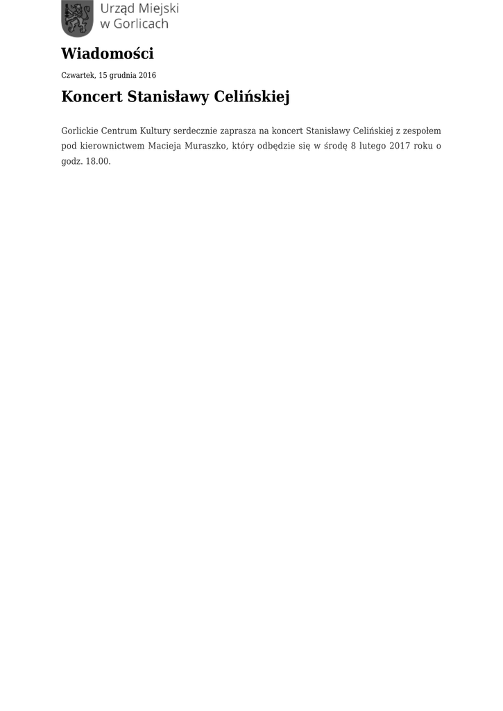 Wiadomości Czwartek, 15 grudnia 2016 Koncert Stanisławy Celińskiej Gorlickie Centrum Kultury serdecznie zaprasza na koncert Stanisławy Celińskiej z zespołem pod kierownictwem Macieja Muraszko, który odbędzie się w środę 8 lutego 2017 roku o godz. 18.00. Stanisława Celińska jest przede wszystkim znana jako znakomita, wszechstronna aktorka występująca zarówno na deskach teatralnych, jak i przed kamerą. Ale jest również wspaniałą piosenkarką, która wykonując „Atramentową rumbę” czy też utwory z albumu „Nowa Warszawa” zaskakuje i ujmuje swoim przejmującym głosem. W 1969 roku ukończyła PWST w Warszawie pod kierunkiem Ryszardy Hanin. Przez lata kariery związana była niemal wyłącznie z warszawskimi teatrami: Współczesnym, Na Woli, Ateneum, Nowym, Dramatycznym, Studio, Kwadrat i Współczesnym. Obecnie pracuje na deskach Teatru Nowego w Warszawie. W dekadzie lat 70-tych była jedną z najzdolniejszych i najpiękniejszych gwiazd polskiego kina. Grała w filmach m.in.: Krzysztofa Zanussiego, Stanisława Barei, Jerzego Antczaka, Janusza Majewskiego, Andrzeja Kostenki, Wojciecha Marczewskiego, Piotra Szulkina, Barbary Sass, Andrzeja Barańskiego, Kazimierza Kutza. Za tragikomiczną rolę Izy Gęsiareczki w „Spisie cudzołożnic” Jerzego Stuhra otrzymała nagrodę na FPFF w Gdyni (1994). Statuetkę Polskiej Nagrody Filmowej, jak również nagrodę na FF w Szanghaju otrzymała w 2001 roku za rolę w komedii „Pieniądze to nie wszystko” Juliusza Machulskiego. W 1986 roku została odznaczona Srebrnym Krzyżem Zasługi, w 1995 roku – uhonorowano ją nagrodą „Prometeusza” za ogół twórczości estradowej, w 2001 – nagrodą Teatru Polskiego Radia „Wielki Splendor” za kreacje radiowe, a w 2002 otrzymała statuetkę Feliksa Warszawskiego oraz nagrodę im. Aleksandra Zelwerowicza za rolę w „Oczyszczonych” Sarah Kane w reżyserii Krzysztofa Warlikowskiego. Wybitną twórczość komediową Celińskiej doceniono na VIII Festiwalu Dobrego Humoru w Gdańsku, przyznając jej statuetkę Melonika w 2007 roku. „Atramentowa…” to płyta Stanisławy Celińskiej wydana w 2015 roku. Aktorka odgrywa swoją kolejną wspaniałą rolę – pieśniarki, która wie o czym śpiewa i wie jak przyciągnąć słuchacza wykorzystując pełną paletę barw i emocji. Album w czerwcu 2015 r. stał się Złotą Płytą, po paru kolejnych tygodniach Platynową, na dzień dzisiejszy sprzedaż osiągnęła 60.000 egzemplarzy i album uzyskał status podwójnej Płyty Platynowej. Maciej Muraszko – wszechstronny muzyk, kompozytor, aranżer i producent, absolwent Akademii Muzycznej w Poznaniu. Ma w swoim dorobku współpracę z wieloma artystami, m.in. z Marylą Rodowicz, Zbigniewem Górnym, Ryszardem Rynkowskim, Mieczysławem Szcześniakiem, Maciejem Maleńczukiem, Zbigniewem Wodeckim, Rudi Schubertem, Piotrem Gąsowskim, Krzesimirem Dębskim, Kevinem Davisem oraz Nippi Noyą. Ponadto współpracował z Orkiestrą Polskiego Radia i Telewizji w Poznaniu, Państwową Filharmonią w Poznaniu oraz Filharmonią Narodową w Warszawie. Za muzykę do filmu Wiesława Saniewskiego „Bezmiar Sprawiedliwości” otrzymał nagrodę publiczności „Jańcio Wodnik” na XIV Ogólnopolskim Festiwalu Sztuki Filmowej „Prowincjonalia 2007”. Jest producentem muzycznym m.in. wszystkich płyt wydanych wspólnie przez Macieja Maleńczuka i zespół Psychodancing, a także płyty „Cudowny świat” dedykowanej wspaniałemu polskiemu kardiochirurgowi Zbigniewowi Relidze. Autorzy fotografii: Marcin Banasik, Piotr Grzybowski Źródło: Gorlickie Centrum Kultury