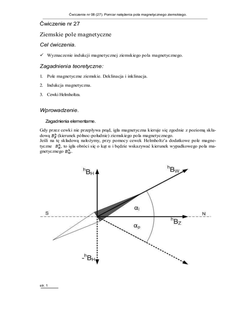 Ćwiczenie nr 08 (27). Pomiar natężenia pola magnetycznego ziemskiego. Ćwiczenie nr 27 Ziemskie pole magnetyczne Cel ćwiczenia. Wyznaczenie indukcji magnetycznej ziemskiego pola magnetycznego. Zagadnienia teoretyczne: 1. Pole magnetyczne ziemskie. Deklinacja i inklinacja. 2. Indukcja magnetyczna. 3. Cewki Helmholtza. Wprowadzenie. Zagadnienia elementarne. Gdy przez cewki nie przepływa prąd, igła magnetyczna kieruje się zgodnie z poziomą składową (kierunek północ-południe) ziemskiego pola magnetycznego. Jeśli na tę składową nałożymy, przy pomocy cewek Helmholtz’a dodatkowe pole magnetyczne , to igła obróci się o kąt α i będzie wskazywać kierunek wypadkowego pola magnetycznego . str. 1 Ćwiczenie nr 08 (27). Pomiar natężenia pola magnetycznego ziemskiego. W szczególnym przypadku, gdy oś cewek jest prostopadłą do kierunku północ-południe, otrzymujemy zależność: lub = tg α (2) Jeśli powyższa zależność jest funkcją liniową: = f(tg α) to jest nachyleniem tej prostej i można ją wyznaczyć metodą najmniejszych kwadratów. Indukcję magnetyczną pary cewek Helmholtza wyznacza się sporządzając jej wykres w funkcji natężenia prądu elektrycznego IH przepływającego przez nie. = f(IH) = K∙IH (3) gdzie K jest współczynnikiem kalibracji (nachylenie prostej wyznaczonej, np., metodą najmniejszych kwadratów). Wzór (3) przyjmuje więc postać: K∙IH = tg α ↓ ↓ ↓ y a x (4) Przebieg ćwiczenia Wyposażenie potrzebne do przeprowadzenia ćwiczenia: para cewek Helmholtza zasilacz uniwersalny opornica suwakowa 100Ω; 1,8A teslomierz cyfrowy z sondą Halla multimetr cyfrowy igła magnetyczna deklinacyjno- inklinacyjna przewody Cewki Helmholtza połączone są szeregowo i przez opornicę podłączone są do zasilacza prądu stałego oraz uniwersalnego multimetru cyfrowego. Sondę Halla umieszczamy w osi cewek, tak aby jej koniec znajdował się pośrodku układu Helmholtza. Zmieniając wartość prądu IH w zakresie 0 ÷ 1,3A z krokiem ~ 0,2A zmierzyć indukcję (mT). Pomiary zapisać w Tabeli 1. str. 2 Ćwiczenie nr 08 (27). Pomiar natężenia pola magnetycznego ziemskiego. Tabela 1. Zależność indukcji magnetycznej od natężenia prądu I H cewek Helmholtza. IH [mA] [mT] 2. W tej części wyznaczamy zależność kąta odchylenia α igły magnetycznej od kierunku północ-południe w funkcji natężenia prądu płynącego przez cewki Helmholtza. Usuwamy sondę Halla, a w jej miejsce wstawiamy igłę magnetyczną, tak zmieniając położenie pary cewek, aby ich oś była dokładnie prostopadłą do kierunku północ-południe (oczywiście IH = 0). Następnie ustawiamy prąd IH na poziomie ~ 30mA (Regulacja U ≈ 1V, regulacja I ≈ 0,5A) zmieniając w odpowiedni sposób położenie suwaka opornicy. Wychylenie igły magnetycznej przy zmianie kierunku prądu powinno być jednakowe ( αl = αp ). Jeśli tak nie jest, lekko zmienić położenie układu Helmholtza. Zmieniając natężenie prądu w zakresie 10 ÷ 60 mA z krokiem ~ 5mA zmierzyć odchylenie igły magnetycznej α. Wyniki zapisać w Tabeli 2. i uzupełnić o stosowne obliczenia. Tabela 2. IH [mA] 10 15 20 25 30 35 40 45 50 55 α[ ] 0 tg α =K∙IH [μT] 3. Na koniec, podczas gdy przez cewki nie płynie prąd, okno z podziałką obrócić do płaszczyzny pionowej tak, aby igła magnetyczna wskazywała teraz kąt inklinacji υ 1. Należy upewnić się, że oś obrotu jest prostopadłą do kierunku północ-południe. Aby otrzymać υ 2, należy magnetometr obrócić o 1800 wokół pionu. str. 3 Ćwiczenie nr 08 (27). Pomiar natężenia pola magnetycznego ziemskiego. Zmierzony kąt inklinacji wstawiamy do związku: Pełna indykcja magnetyczna BZ wynosi: Opracowanie wyników 1. Na podstawie Tabeli1. Wykonaj wykres zależności . 2. Metodą najmniejszych kwadratów (regresja liniowa) wyznacz współczynnik kalibracji K układu cewek Helmholtza. 3. Uzupełnij Tabelę 2. o obliczenia i wykonaj na jej podstawie wykres zależności K∙IH = f(tg α). 4. W oparciu o dane z pkt. 3. Wyznacz metodą regresji liniowej składową poziomą indukcji magnetycznej ziemskiego pola magnetycznego. 5. Ze wzoru (5) wyznacz składową . 6. Ostatecznie ze wzoru (6) oblicz całkowitą indukcję BZ ziemskiego pola magnetycznego. str. 4 Ćwiczenie nr 08 (27). Pomiar natężenia pola magnetycznego ziemskiego. Ćw.8. (27). Pomiar natężenia pola magnetycznego ziemskiego Protokół pomiarowy Ćw. 27. Rok akadem: Kierunek: Laboratorium z fizyki Temat: Pomiar natężenia pola magnetycznego ziemskiego Imię i Nazwisko: Grupa: Ocena Data Zaliczenia Podpis L S K Tabela 1. Zależność indukcji magnetycznej od natężenia prądu IH cewek Helmholtza. IH [mA] [mT] Tabela 2. IH [mA] α [ 0] tg α =K∙IH [μT] str. 5 10 15 20 25 30 35 40 45 50 55