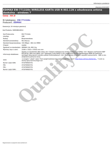 Informacje o produkcie Utworzono 02-03-2017 EDIMAX EW-7711UAn WIRELESS KARTA USB N 802.11N z wbudowana antena dookolna - windows 7 Cena : 64 zł Nr katalogowy : EW-7711UAn Producent : EDIMAX Gwarancja: 24 miesiące gwarancji Kod Producenta: EW-7711UAn Interfejs: USB Rodzaj: Bezprzewodowa Standard przewodowy: Nie dotyczy Standard bezprzewodowy: 150 (Mbps) - 802.11n MIMO Chipset: realtek Zgodność ze standardem: IEEE802.11b, 802.11g C Kod Produktu: SIEEDIBKU0014 15(W) x 15(S) x 155(G) mm mm Informacje dodatkowe: Zgodny ze standardem 802.11b/g <br> Zawiera wielojęzyczny kreator konfiguracji EZMax <br> Wspiera szyfrowanie WEP 64/128 bit, WPA oraz WPA2 <br> Obsługuje Turbo Mode w celu zwiększenia wydajnościObsługuje WMM dla spełnienia wymagań dotyczących transferu plików multimedialnych <br> Wyposażony w antene o wysokim wzmocnieniu - 3dBi w celu zwiększenia pokrycia siecią www: <a target="_blank" style="font-weight:bold;text-decoration:underline;" href="http://www.edimax.pl/pl/produ... ">Link na stronę opisu technicznego</a> Numer części EAN: 4710700925751 P/N: 4710700925751 ua lit P/N:: 4710700925751 4710700925751 Q Numer części EAN:: yP Wymiary (wys x szer): Wygenerowano w programie www.oscGold.com