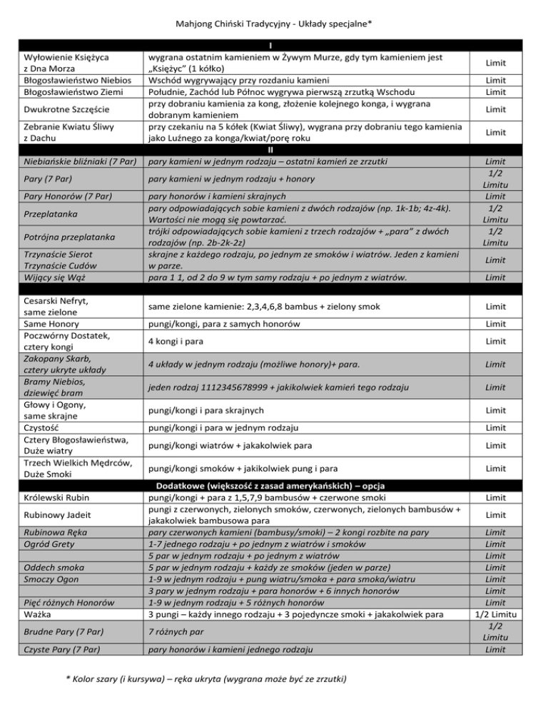 Mahjong Chiński Tradycyjny - Układy specjalne* I Wyłowienie