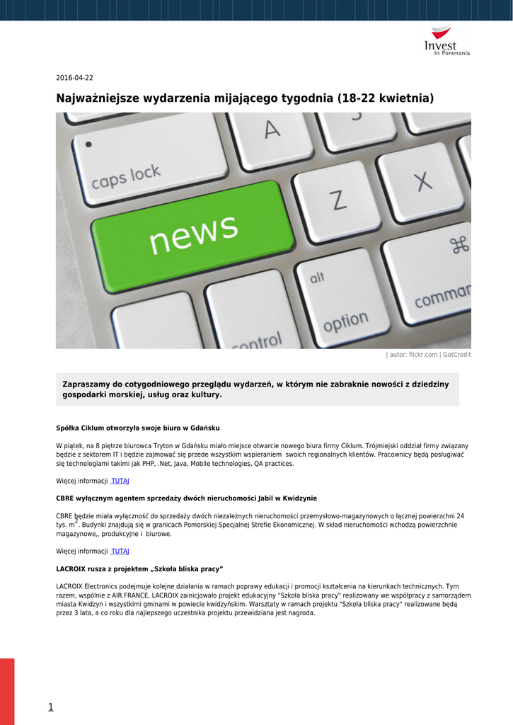 2016-04-22 Najważniejsze wydarzenia mijającego tygodnia (18-22 kwietnia) | autor: flickr.com | GotCredit Zapraszamy do cotygodniowego przeglądu wydarzeń, w którym nie zabraknie nowości z dziedziny gospodarki morskiej, usług oraz kultury. Spółka Ciklum otworzyła swoje biuro w Gdańsku W piątek, na 8 piętrze biurowca Tryton w Gdańsku miało miejsce otwarcie nowego biura firmy Ciklum. Trójmiejski oddział firmy związany będzie z sektorem IT i będzie zajmować się przede wszystkim wspieraniem swoich regionalnych klientów. Pracownicy będą posługiwać się technologiami takimi jak PHP, .Net, Java, Mobile technologies, QA practices. Więcej informacji TUTAJ CBRE wyłącznym agentem sprzedaży dwóch nieruchomości Jabil w Kwidzynie CBRE będzie miała wyłączność do sprzedaży dwóch niezależnych nieruchomości przemysłowo-magazynowych o łącznej powierzchni 24 2 tys. m . Budynki znajdują się w granicach Pomorskiej Specjalnej Strefie Ekonomicznej. W skład nieruchomości wchodzą powierzchnie magazynowe,, produkcyjne i biurowe. Więcej informacji TUTAJ LACROIX rusza z projektem „Szkoła bliska pracy” LACROIX Electronics podejmuje kolejne działania w ramach poprawy edukacji i promocji kształcenia na kierunkach technicznych. Tym razem, wspólnie z AIR FRANCE, LACROIX zainicjowało projekt edukacyjny "Szkoła bliska pracy" realizowany we współpracy z samorządem miasta Kwidzyn i wszystkimi gminami w powiecie kwidzyńskim. Warsztaty w ramach projektu "Szkoła bliska pracy" realizowane będą przez 3 lata, a co roku dla najlepszego uczestnika projektu przewidziana jest nagroda. 1 Więcej informacji TUTAJ Europejskie Centrum Solidarności najlepszym muzeum Europy We wtorek, 19 kwietnia w Strasburgu Gdański ECS jako pierwsze muzeum w Polsce otrzymał Nagrodę Muzealną Europy. W tegorocznej edycji konkursu wzięło udział 49 muzeów. W ścisłym finale znalazły się trzy placówki. Dotychczas laureatami nagrody zostały takie placówki jak MUCEM w Marsylii, Francja (2015), the Baksi Museum w Turcji (2014) czy Museum of Liverpool w Wielkiej Brytanii (2013). Więcej informacji TUTAJ OT Logistics rozpoczyna prace przy budowie terminalu agro w Gdańsku Ma to być największy na południowym Bałtyku terminal do przeładunku towarów rolnych należący do OT Logistics, ma być największych tego typu terminalem na południowym Bałtyku. Rozpoczęcie jego działalności przewiduje się w roku 2018. Spółka planuje osiągać 1 mld euro przychodów rocznie oraz obsługiwać 50% przeładunków towarów rolnych na Morzu Bałtyckim. Więcej informacji TUTAJ 2