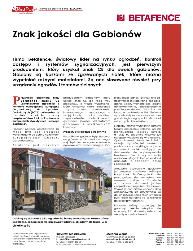 Informacja prasowa z dnia 22.04.2009 r public relations Znak jakości dla Gabionów Firma Betafence, światowy lider na rynku ogrodzeń, kontroli dostępu i systemów sygnalizacyjnych, jest pierwszym producentem, który uzyskał znak CE dla swoich gabionów. Gabiony są koszami ze zgrzewanych siatek, które moŜna wypełniać róŜnymi materiałami. Są one stosowane równieŜ przy urządzaniu ogrodów i terenów zielonych. P rzyznając gabionom firmy Betafence znaku CE (oznakowania zgodności z normami europejskimi) Europejska Organizacja ds. Aprobat Technicznych (EOTA) potwierdza, Ŝe produkt spełnia normy bezpieczeństwa i jakości opisane w europejskich dyrektywach „nowego podejścia”. Produkty noszące oznakowanie CE mogą być bez przeszkód wprowadzane do obrotu na rynkach Europejskiego Obszaru Gospodarczego. Betafence jest pierwszym producentem gabionów, który uzyskał znak CE dla tego typu produktów. To waŜne wyróŜnienie, które umoŜliwia firmie Betafence zajęci e pozycji producenta innowacyjnego i znaczącego w swojej branŜy, a takŜe umoŜliwia zapew nienie dodatkow ych gwarancji jakości instalatorom gabionów i uŜytkow nikom końcowym. Produkty ekologiczne i kreatywne Początkowo gabiony były stosowane głównie w infrastrukturze drogowej i hydrotechnice jako konstrukcje oporowe oraz przeciwerozyjne. Ga- biony mają jednak równieŜ inne zastosowania: są stosowane jako ogrodzenie, ściany wolnostojące, ekrany dźwiękochłonne, zabezpieczenia przeciwpowodziowe, okładziny dla fasad, w architekturze itd. Gabiony są bardzo uŜyteczne z ekonomicznego i ekologicznego punktu dla robót związanych z infrastrukturą. Gabiony moŜna wypełniać róŜnymi typami materiałów zaleŜnie od ich planowanego sposobu uŜycia, a takŜe by zapewnić moŜliwie jak najlepsze wtopienie się w otoczenie. Oprócz kamieni, piasku, ziemi i Ŝwiru, stosuje się równieŜ materiały pochodzące z recyklingu, odporne na mróz i nacisk, nadające się doskonale do w ykonyw ania f u n d a m e n t ów i w y p e ł ni e ni a gabionów. Mogą to być na przykład granulaty z odpadów, beton z odzysku itd. Znaczenie ekologiczne gabionów jest związane z obsiewem roślinnym koszy. I tak, niektóre gatunki roślin przyczyniają się korzystnie do usuwania pyłów. - Zapylenie atmosfery stanowi jedno z największych zagroŜeń dla zdrowia. Wywołuje ono cięŜkie choroby dróg oddechowych lub przyczyniają się do ich rozwoju. Liście roślin wyłapują pyły, które następne są spłukiwane do gleby przez deszcze. Ponadto gabiony w naturę akcenty w rośliny sprawiają, Ŝe pięknie wtapiają się lub stanowią estetyczne centrach miast. Gabiony są stosowane jako ogrodzenie, ściany wolnostojące, ekrany dźwiękochłonne, zabezpieczenia przeciwpowodziowe, okładziny dla fasad, w architekturze itd Szanowni Państwo, w przypadku pytań prosimy o kontakt z panem Krzysztofem Kieszkowskim. Chętnie pomoŜemy zdobyć potrzebne materiały. Krzysztof Kieszkowski Melania Wojas Project Manager [email protected] tel kom: +48 509 818 001 Communication Specialist [email protected] tel kom: +48 518 619 230 ul. 11 Listopada 79, 05-091 Warszawa-Ząbki Warszawa-Ząbki Katowice Gdańsk Poznań Wrocław Lublin tel: 0 22 781 40 51 tel: 0 32 750 86 43 tel: 0 58 741 90 28 tel: 0 61 623 18 44 tel: 0 71 722 08 57 tel: 0 81 463 41 96