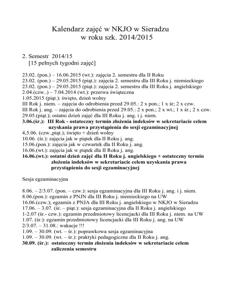 Kalendarz zajęć w NKJO w Sieradzu w roku szk. 2014/2015 2. Semestr 2014/15 [15 pełnych tygodni zajęć] 23.02. (pon.) – 16.06.2015 (wt.): zajęcia 2. semestru dla II Roku 23.02. (pon.) – 29.05.2015 (piąt.): zajęcia 2. semestru dla III Roku j. niemieckiego 23.02. (pon.) – 29.05.2015 (piąt.): zajęcia 2. semestru dla III Roku j. angielskiego 2.04.(czw..) – 7.04.2014 (wt.): przerwa świąteczna 1.05.2015 (piąt.): święto, dzień wolny III Rok j. niem. – zajęcia do odrobienia przed 29.05.: 2 x pon.; 1 x śr; 2 x czw. III Rok j. ang. – zajęcia do odrobienia przed 29.05.: 2 x pon.; 2 x wt.; 1 x śr.; 2 x czw. 29.05.(piąt.); ostatni dzień zajęć dla III Roku j. ang. i j. niem. 3.06.(śr.): III Rok - ostateczny termin złożenia indeksów w sekretariacie celem uzyskania prawa przystąpienia do sesji egzaminacyjnej 4,5.06. (czw.,piąt.); święto + dzień wolny 10.06. (śr.): zajęcia jak w piątek dla II Roku j. ang. 15.06.(pon.): zajęcia jak w czwartek dla II Roku j. ang. 16.06.(wt.): zajęcia jak w piątek dla II Roku j. ang. 16.06.(wt.): ostatni dzień zajęć dla II Roku j. angielskiego + ostateczny termin złożenia indeksów w sekretariacie celem uzyskania prawa przystąpienia do sesji egzaminacyjnej Sesja egzaminacyjna 8.06. – 2/3.07. (pon. – czw.): sesja egzaminacyjna dla III Roku j. ang. i j. niem. 8.06.(pon.): egzamin z PNJN dla III Roku j. niemieckiego na UW 16.06.(czw.); egzamin z PNJA dla III Roku j. angielskiego w NKJO w Sieradzu 17.06. – 3.07. (śr. – piąt.): sesja egzaminacyjna dla II Roku j. angielskiego 1-2.07 (śr.- czw.): egzamin przedmiotowy licencjacki dla III Roku j. niem. na UW 1.07. (śr.): egzamin przedmiotowy licencjacki dla III Roku j. ang. na UW 2/3.07. – 31.08.: wakacje !!! 1.09. – 30.09. (wt. – śr.): poprawkowa sesja egzaminacyjna 1.09. – 30.09. (wt. – śr.): praktyki pedagogiczne dla II Roku j. ang. 30.09. (śr.): ostateczny termin złożenia indeksów w sekretariacie celem zaliczenia semestru
