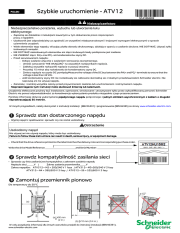 Szybkie uruchomienie - ATV12 POLSKI S1A1094202 Niebezpiczeństwo Niebezpieczeństwo porażenia, enia, wybuchu lub utworzenia łuku elektrycznego • Zapoznaj sie dokładnie z instukcjami zawartymi w tym dokumencie przez rozpoczęciem pracy z napędem • Użytkownik jest odpowiedzialny za zgodność ze wszystkimi międzynarodowymi i krojowymi wymogami elektrycznymi w sprawie uziemnienia urządzeń. • Wiele elementów tego napędu, wliczając liczając plytkę obwodu drukowanego, działają w oparciu o zasilanie sieciowe. NIE DOTYKAĆ. Używać tylko izolowanych narzędzi. • NIE DOTYKAĆ nieizolowanych elementów ani złącz śrubowych kiedy podłączone jest zasilanie • NIE ZWIERAĆ złącz PA/+ oraz PC/- ani kondensatorów ensatorów szyny DC. • Przed serwisowaniem napędu: - Odłącz zasilanie włącznie z zasilaniem sterowania zewnętrzenego. - Umieść oznaczenie “NIE WŁĄCZAĆ” na wszystkich rozłącznikach napięcia. - Zablokuj wszystkie rozłączniki napięcia w pozycji otwartej. - Poczekaj 15 minut aby rozładowały sie konsdensatory szyny DC. - Zmierz napięcie na szynie DC pomiędzyMeasure pomiędzyMea the voltage of the DC bus between the PA/+ and d PC/- terminals to ensure that the voltage is less than 42 Vdc. - Jeśli kondensatory szyny DC nie rozładowały sie całkowicie skontaktuj sie z lokalnym przedstawicielem Schneider electric. Nie naprawiaj ani nie używaj napędu. • Zainstaluj i zamknij wszystkie osłony przed przywróceniem zasilania lub uruchomieniem i zatrzymaniem napędu. Nieprzestrzeganie tych instrukcji może m oże skutkować śmiercią lub kalectwem. Urządzenia elektryczne powinny być instalowane, operowane, serwisowane i utrzymywane tylko przez wykwalifikowany personel. Schneider Sc Electric nie ponosi odpowiedzialności za konsekwencje wykorzystania produktu niezgodnie niezgodnie z jego przeznaczeniem. Poniższe informacje dotyczą wykorzystania pojedynczego napędu połączonego z jednym silnikiem asynchronicznym z kablem o długości nieprzekraczającej 50 metrów. W innych przypadkach, należy skorzystać z instrukcji instalacji (BBV46391) i programowania (BBV46385) ze strony www.schneider-electric.com. 1 Sprawdz stan dostarczonego napędu • Wyjmij napęd z opaklowania i sprawdz czy nie został uszkodzony. uszkodzony Ostrzeżenie Uszkodzony napęd Nie używaj ani nie używaj napędu, który może byc uszkodzony. Fail Failure to follow these in structions can res result in death death , seriou seriou s in jury, or equi equ ipm ent dam dam age. • Check that the drive reference printed on the label matches the delivery note and corresponding purchase order. Write the drive Model Reference: 2 and Serial Number: Sprawdz kompatybilność zasilania sieci • Sprawdz czy linia zasilania jest kompatybilna z zakresem zasialnia napedu Napięcie sieci V / Zakres zaslania przemiennika V Zakres napędów: ATV312•••• M2 = 200/240 V 1 faza / ATV312•••• M3=200/240 V 3 fazy ATV312 •••• N4 = 380/500 V 3 fazy / ATV312•••• S6 = 525/600 V 3 fazy 3 8B0917121134 Zamontuj przemiennik pionowo (a) Dla temperatury do 50 °C (a) (a) (a) (a) 50 mm (2 in.) (b) 10 mm (0.4 in.) W celu pozyskania informacji dla innych warunków przejdź do instrukcji instalacji (BBV46391). ( www.schneider-electric.com 1/4 S1A10942 - 02/2012 4 Podłącz przewody zasilania 5 • Podłącz przemiennik do uziemnienia. • Sprawdz zakres wyłącznika lub bezpiecznika. • Sprawdz czy napięcia silnika jest kompatybilne z przemiennikiem. Napięcie silnika V. Podłącz przewody sterujące i wybierz konfiguracje [Konfiguracja REMOTE ] 5.1 (Sterowanie przez zewnętrzne) • Podłącz przemiennik do silnika. • Podłącz przemiennik do zasilania. or / COM +5v AI 1 • Podłącz odniesienie prędkości: prędkości : Do: 6 + 7 + 8 + 9.1 Do: 6 + 7 + 8 + 9.1 Do: 6 + 7 + 8 + 9.1 Do: 6 + 7 + 8 + 9.2 ATV12eeeeF1 2.2 KΩ / • Podłącz sterowanie: sterowanie: Sterowanie 2-przewodowe: Parametr tCC = 2C ATV12eeeeM2 LI1:w przód LIx: w tył / ATV 12 +24 V LI1 LIx ATV12eeeeM3 Sterowanie 3-przewodowe: Parametr tCC = 3C LI1: stop LI2: przód LIx: tył 0,8...1,2 N.m 7.1...10.6 lb.in ATV 12 +24 V LI1 LI2 LIx 200 / 240V [Konfiguracja LOCAL] . 6 • • • • 5. (Sterowanie przez 2 wewnętrzne odniesienie). Włącz zasialanie przemiennika Upewnij sie ze wejścia logiczne są nie aktywne (see Li1, Li2, Lix ). Włącz zasilanie. Na przemienniku wyświetla sie bFr przy pierwszym uruchomieniu. Przy kolejnym uruchomieniu wyświetla sie rdY .':: 7 Ustaw parametry silnika • Odnieś sie do tabliczki znamionowej silnika aby ustawić dane parametry. Menu Code bFr COnF'::> FULL'::> '::drC[Motor control menu] nPr nCr COnF'::> FULL'::> FLt-'::> tHt-':: [Motor thermal protection menu] www.schneider-electric.com ItH Description Factory setting [Standard motor frequency]: Standardowa częstotliwość silnika (Hz) [Rated mot. power]: Znamionowa moc silnika [Rated mot. current]: Znamionowe natęzenie silnika (A) [Motor thermal current]: Prąd termiczny silnika (A) 2/4 Customer setting 50.0 drive rating drive rating drive rating S1A56146 - 05/2013 8 Ustaw podstawowe parametry Menu Code ACC COnF [CONFIGURATION] dEC LSP HSP 9 Description Factory setting [Acceleration]: Czas przyspieszania (s) [Deceleration]: Czas hamowania (s) [Low speed]: Częstotliwośc dla minimalnej wartości referencyjnej (Hz) [High speed]: Motor frequency at maximum reference (Hz) Customer setting 3.0 3.0 0.0 50.0 Ustaw wybrane sterowanie Menu COnF'::> FULL'::> Ctl[Control menu] COnF'::> FULL'::> ':: I_0[Input Output menu] Code Description 5.1 [REMOTE configuration] 5 .2 [LOCAL configuration] Fr1':: [Reference channel1]: Odniesienie prędkości Al1 AlU1 tCC [Type of control]: Sterowanie 2C: Sterowanie 2-przewodowe 3C: Sterowanie 3-przewodowe _ 9.1 [Konfiguracja REMOTE] (Ustawienia fabryczne) Ustawienia fabryczne parametrów: Fr1'::= AI1 tCC'::= 2C Customer Setting 9.2 [Konfiguracja LOCAL] Ustawienia fabryczne parametró