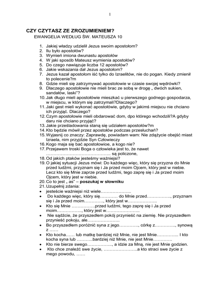 1 CZY CZYTASZ ZE ZROZUMIENIEM? EWANGELIA WEDŁUG ŚW. MATEUSZA 10 Jakiej władzy udzielił Jezus swoim apostołom? Ilu było apostołów? Wymień imiona dwunastu apostołów W jaki sposób Mateusz wymienia apostołów? Do czego nawiązuje liczba 12 apostołów? Jakie wskazania dał Jezus apostołom? Jezus kazał apostołom iść tylko do Izraelitów, nie do pogan. Kiedy zmienił to polecenie?m 8. Gdzie mieli się zatrzymywać apostołowie w czasie swojej wędrówki? 9. Dlaczego apostołowie nie mieli brac ze sobą w drogę „ dwóch sukien, sandałów, laski”? 10. Jak długo mieli apostołówie mieszkać u pierwszego godnego gospodarza, w miejscu, w którym się zatrzymali?Dlaczego? 11. Jaki gest mieli wykonać apostołówie, gdyby w jakimś miejscu nie chciano ich przyjąć. Dlaczego? 12. Czym apostołowie mieli obdarować dom, dpo którego wchodzili?A gdyby daru nie chciano przyjąć? 13. Jakie prześladowania staną się udziałem apostołów?m 14. Kto będzie mówił przez apostołów podczas przesłuchań? 15. Wyjasnij co znaczy: Zaprawdę, powiadam wam: Nie zdążycie obejść miast Izraela, nim przyjdzie Syn Człowieczy 16. Kogo maja się bać apostołowioe, a kogo nie? 17. Przejawem troski Boga o człowieka jest to, że nawet …………………………………….. są policzone, 18. Od jakich ptaków jesteśmy ważniejsi? 19. O jakiej sytuacji Jezus mówi: Do każdego więc, który się przyzna do Mnie przed ludźmi, przyznam się i Ja przed moim Ojcem, który jest w niebie. Lecz kto się Mnie zaprze przed ludźmi, tego zaprę się i Ja przed moim Ojcem, który jest w niebie. 20. Co to jest „ as” – poszukaj w słowniku 21. Uzupełnij zdania: jesteście ważniejsi niż wiele………………... Do każdego więc, który się………… do Mnie przed……………., przyznam się i Ja przed moim…………., który jest w……………….. Kto się Mnie …………….przed ludźmi, tego zaprę się i Ja przed moim…………….., który jest w………………….. Nie sądźcie, że przyszedłem pokój przynieść na ziemię. Nie przyszedłem przynieść pokoju, ale…………………. Bo przyszedłem poróżnić syna z jego…………., córkę z………….., synową z …… Kto kocha…… lub matkę bardziej niż Mnie, nie jest Mnie…………... I kto kocha syna lub ………..bardziej niż Mnie, nie jest Mnie…………. Kto nie bierze swego…………….., a idzie za Mną, nie jest Mnie godzien. Kto chce znaleźć swe życie, …………………..a kto straci swe życie z mego powodu, …… 1. 2. 3. 4. 5. 6. 7. 2 22. Kogo przymuja ci, którzy przyjmują apostołów? 23. Za jaki uczynek Jezus obiecuje nagrodę kiedy mówi: Kto poda kubek świeżej wody do picia jednemu z tych najmniejszych, dlatego że jest uczniem zaprawdę powiadam wam, nie utraci swojej nagrody? 3 KLUCZ DO ODPOWIEDZI Mt 10 1. Udzielił im władzy nad duchami nieczystymi, aby je wypędzali i leczyli wszystkie choroby i wszelkie słabości 2. 12 3. Szymon, zwany Piotrem, i brat jego Andrzej, potem Jakub, syn Zebedeusza, i brat jego Jan, Filip i Bartłomiej, Tomasz i celnik Mateusz, Jakub, syn Alfeusza, i Tadeusz, Szymon Gorliwy Judasz Iskariota, ten, który Go zdradził. 4. Mt wylicza apostołów parami, łącząc przy tym, gdzie to było możliwe, braci z braćmi. Mk wymienia wszystkich pojedynczo. Łk w Ewangelii cytuje imiona apostołów pojedynczo, w Dz zaś parami. 5. Do dwunastu pokoleń Izraela 6. Nie idźcie do pogan i nie wstępujcie do żadnego miasta samarytańskiego! Idźcie raczej do owiec, które poginęły z domu Izraela Idźcie i głoście: "Bliskie już jest królestwo niebieskie". Uzdrawiajcie chorych, wskrzeszajcie umarłych, oczyszczajcie trędowatych, wypędzajcie złe duchy! Darmo otrzymaliście, darmo dawajcie! Nie zdobywajcie złota ani srebra, ani miedzi do swych trzosów. Nie bierzcie na drogę torby ani dwóch sukien, ani sandałów, ani laski! Wart jest bowiem robotnik swej strawy 7. Po wniebowstąpieniu Pana misja apostołów obejmuje swym zasięgiem wszystkie narody świata 8. U tych ludzi, którzy są godni 9. ponieważ apostoł ma zaufać Bogu i oddać się całkowicie głoszeniu Ewangelii. Wierni są zobowiązani troszczyć się o jego sprawy doczesne. 10. Do końca swojego pobytu. Jest to Zakaz poszukiwania lepszych, wygodniejszych warunków, gdyby się okazało, że pierwsze miejsce postoju jest zbyt ubogie i skromne. Łk mówi wprost: "Nie przechodźcie z domu do domu 11. Mieli strząsnąć proch z nóg. Żydzi uważali za nieczysty proch każdego kraju poza Ziemią Świętą. Dlatego wracając do kraju, starannie otrząsano obuwie i ubranie. Otóż miasto, które nie przyjmie misjonarzy, jest jakby pogańskie. 12. Pokojem. Miał wrócić do apostołów 13. Będą was wydawać sądom i w swych synagogach będą was biczować. przed namiestników i królów będą was wodzić z mego powodu, Brat wyda brata na śmierć i ojciec syna; dzieci powstaną przeciw rodzicom i o śmierć ich przyprawią. Będziecie w nienawiści u wszystkich z powodu mego imienia. 14. Duch Święty (Duch Ojca waszego będzie mówił przez was ) 4 15. Chodzi tu o przyjście Syna Człowieczego nie na Sąd Ostateczny, lecz na ukaranie ludu niewiernego, co miało nastąpić przez zburzenie Jerozolimy i świątyni w roku 70. 16. Nie bójcie się tych, którzy zabijają ciało, lecz duszy zabić nie mogą. Bójcie się raczej Tego, który duszę i ciało może zatracić w piekle. m 17. Włosy na jego głowie 18. Od wróbli 19. O sądzie ostatecznym 20. ……………………………………………………………. ………………………………………………………………… 21. Jesteście ważniejsi niż wiele wróbli Do każdego więc, który się przyzna do Mnie przed ludźmi, przyznam się i Ja przed moim Ojcem, który jest w niebie. Lecz kto się Mnie zaprze przed ludźmi, tego zaprę się i Ja przed moim Ojcem, który jest w niebie. Nie s