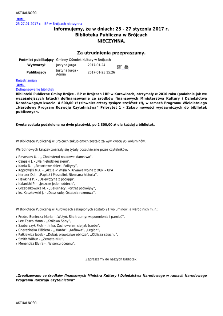 25 - 27 stycznia 2017 r. Biblioteka Publiczna w Brójcach