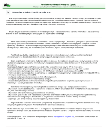 Powiatowy Urząd Pracy w Opolu http://pup.opole.pl/wydarzenie/86/informacja-o-projekcie-pewniak-na-rynku-pracy Informacja o projekcie: Pewniak na rynku pracy PUP w Opolu informuje o możliwości skorzystania z udziału w projekcie pn. „Pewniak na rynku pracy – poszukiwane na rynku pracy specjalności na studiach II stopnia na kierunku Informatyka” współfinansowanego przez Europejski Fundusz Społeczny. Działanie 4.3 Wzmocnienie potencjału dydaktycznego uczelni w obszarach kluczowych w kontekście celów Strategii Europa 2020, który jest realizowany przez Wrocławską Wyższą Szkołę Informatyki Stosowanej. Projekt dotyczy studiów magisterskich w trybie stacjonarnym i niestacjonarnym na kierunku Informatyka i jest skierowany zarówno do osób bezrobotnych jak i pracujących, bez ograniczenia wiekowego. PUP w Opolu informuje o możliwości skorzystania z udziału w projekcie pn. „Pewniak na rynku pracy – poszukiwane na rynku pracy specjalności na studiach II stopnia na kierunku Informatyka” współfinansowanego przez Europejski Fundusz Społeczny. Działanie 4.3 Wzmocnienie potencjału dydaktycznego uczelni w obszarach kluczowych w kontekście celów Strategii Europa 2020, który jest realizowany przez Wrocławską Wyższą Szkołę Informatyki Stosowanej. Projekt dotyczy studiów magisterskich w trybie stacjonarnym i niestacjonarnym na kierunku Informatyka i jest skierowany zarówno do osób bezrobotnych jak i pracujących, bez ograniczenia wiekowego. Celem projektu jest umożliwienie studentom zdobycia cennego doświadczenia zawodowego i kontynuowania nauki na studiach drugiego stopnia o profilu informatycznym na specjalnościach najbardziej dostosowanych do aktualnych potrzeb rynku pracy. Czesne za studia jest w połowie finansowane ze środków unijnych i wynosi jedynie 270 zł miesięcznie. Szczególny nacisk w projekcie jest położony na przekazanie praktycznych umiejętności i wiedzy m.in. poprzez: - możliwość realizacji płatnego stażu krajowego (10 200 PLN za 3 miesiące); koszty stażu pokrywa EFS, - możliwość realizacji płatnego stażu zagranicznego w przedsiębiorstwie/zagranicznym ośrodku akademickim (15 300 PLN za 3 miesiące); koszty stażu pokrywa EFS, - naukę przy wykorzystaniu najnowszych technik informatycznych, - naukę przy wykorzystaniu najnowocześniejszego sprzętu, - dla osób bez wykształcenia techniczno-informatycznego oferujemy dodatkowe bezpłatne zajęcia wyrównawcze z matematyki i wybranych aspektów informatyki. Dodatkowo w ramach pomocy materialnej każdy student może ubiegać się o następujące świadczenia: - stypendium socjalne do 550zł/mies. – uzależnione od dochodu. W tym roku akademickim dochód ten nie może przekroczyć 602,00 zł netto na osobę w rodzinie, - stypendium rektora dla najlepszych studentów do 435zł/mies., - stypendium specjalne dla osób niepełnosprawnych może otrzymać student z tytułu niepełnosprawności potwierdzonej orzeczeniem właściwego organu. Świadczenie to przyznawane jest na wniosek studenta złożony w uczelni, - zapomoga - jest formą doraźnej, bezzwrotnej pomocy dla studentów. Program studiów w zakresie oferowanych specjalności tj. Programowanie urządzeń mobilnych oraz Zaawansowane bazy danych jest zgodny z wytycznymi Ministerstwa Nauki i Szkolnictwa Wyższego. Studia rozpoczną się w październiku 2014 r., ze względu na wysokość dofinansowania liczba miejsc w projekcie jest ograniczona. Dlatego ważne jest by zarezerwować miejsce w programie już teraz i podpisać stosowne dokumenty w siedzibie Uczelni. Szczegóły projektu i dane kontaktowe dostępne są na stronie: http://pewniak.horyzont.eu/ , ewentualnie pod numerem tel. (71) 799-19-37 wew. 29.