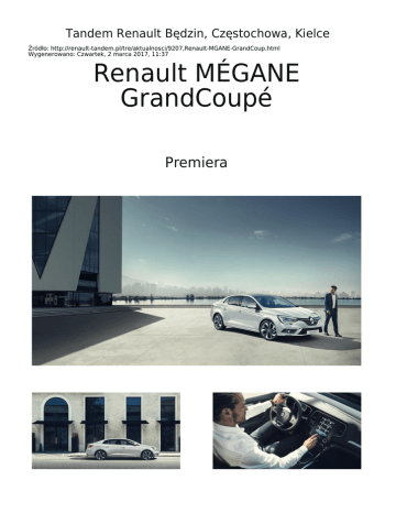 Tandem Renault Będzin, Częstochowa, Kielce Źródło: http://renault-tandem.pl/tre/aktualnosci/9207,Renault-MGANE-GrandCoup.html Wygenerowano: Czwartek, 2 marca 2017, 11:37 Renault MÉGANE GrandCoupé Premiera Design pełen harmonii i elegancji Nowe Zaawansowane technologie Nowe Renault Renault MÉGANE GrandCoupé jest MÉGANE GrandCoupé, wyposażone w fascynujące pod każdym względem. Jego szereg elementów wyposażenia typowych pełna harmonii i elegancji stylistyka, o dla wyższego segmentu, zapewni Ci doskonale wyważonych proporcjach, chwile wyjątkowego komfortu i przyciąga wszystkie spojrzenia. Smukłe przyjemności z jazdy. Do Twojej linie w połączeniu z długą maską i mocno dyspozycji jest m.in. system zarysowanymi nadkolami tworzą multimedialny R-LINK 2 stanowiący dynamiczny design. Charakterystyczny, kwintesencję zaawansowanych wyróżniający się układ przednich i tylnych technologii pokładowych, a także system świateł, podkreśla unikalną osobowość. MULTI-SENSE, dzięki któremu możesz Dzięki dużemu, panoramicznemu, spersonalizować swoje doznania z jazdy, szklanemu dachowi wnętrze jest pełne w zależności od tego na co masz w danej światła. chwili ochotę lub preferowanego stylu jazdy. Usiądź za kierownicą i odkryj pasję prowadzenia.. Potrzebujesz więcej informacji? Skontaktuj się z nami Będzin Częstochowa Kielce ul. Czeladzka 67 (DK 68 ul. Krótka 16 ul. Transportowców 16 Katowice – Warszawa) 34 366 91 66 41 34 35 700 32 267 27 67 czestochowa@renault-tandem. [email protected] [email protected] pl