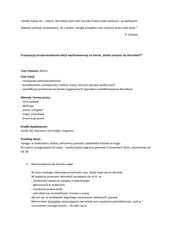 „Kiedy mamy lat …naście, dorosłość jawi nam się jako kraina ludzi wolnych i szczęśliwych. Dopiero później zrozumiemy. Że o jedno i drugie przyjdzie nam walczyć przez całe życie.” R. Schlack Propozycja przeprowadzenia lekcji wychowawczej na temat „Kiedy zaczyna się dorosłość?” Czas trwania: 45min Cele lekcji: - rozwijanie samoświadomości - kształtowanie umiejętności realnej oceny różnych sytuacji społecznych - weryfikacja przekonań na temat negatywnych sposobów manifestowania dorosłości Metody i formy pracy: - mini wykład - dyskusja -„burza mózgów” - mapa umysłowa - praca w grupach Środki dydaktyczne: Kartki A4, flamastry lub kredki, magnesy Przebieg lekcji: Uwaga: w budowaniu dobrej atmosfery pomoże ustawienie krzeseł w kręgu W trakcie przygotowań do zajęć – wysłuchanie nagrania piosenki Czerwonych Gitar „dozwolone od lat 18” 1. Wprowadzenie do tematu zajęć W życiu każdego człowieka przychodzi czas, kiedy staje się on dorosły. W aspekcie prawnym dorosłość przejawia się m.in. w: - możliwości zawarcia związku małżeńskiego - głosowania w wyborach - uzyskania prawa jazdy - zatrudnienia na podstawie umowy o pracę ale też np. w możliwości legalnego stosowania niektórych używek Momentem formalnie oznaczającym dorosłość jest uzyskanie pełnoletniości, czyli w rozumienia naszego prawa – 18 roku życia Podczas zajęć spróbujemy znaleźć odpowiedź na pytanie: - czy bycie osobą pełnoletnią oznacza jednocześnie bycie dorosłym? 2. Praca w grupach – skojarzenia z pojęciem „dorosłość” Podział uczniów na 5 grup. Na kartkach A4 wykonują skojarzeniową „mapę umysłową” (atrybuty formalne, działania, cechy) według schematu DOROSŁOŚĆ TO Liderzy grup prezentują prace umieszczając je na tablicy. Nauczyciel krótko podsumowuje, akcentując istotne cechy i zachowania wskazane przez uczniów 3. Każdy uczeń anonimowo na kartce udziela odpowiedzi na pytanie „Co dla mnie osobiście jest najważniejsze w byciu dorosłym”. Kartki zbiera nauczyciel. Posłużą do podsumowania zajęć 4. Burza mózgów Wprowadzenie do ćwiczenia: Ludzie w różny sposób manifestują swoją dorosłość. Jedni czynią to w sposób, który w powszechnym odbiorze uważany jest za pozytywny. Inni sięgają po takie zachowania, które przynoszą szkody. Na tablicy nauczyciel wspólnie z uczniami tworzy tabelę: Mocne strony, zalety bycia dorosłym np. samodzielność finansowa własny samochód samodzielne mieszkanie satysfakcjonująca praca Problemy i zagrożenia wiążące się z dorosłością np. picie alkoholu palenie papierosów bezrobocie przestępczość problemy ekonomiczne Uczniowie zgłaszają pomysły i następnie podchodzą do tablicy i wpisują w odpowiednim miejscu tabelki. W podsumowaniu zwracamy uwagę, że dorosłość to nie tylko przywileje, to także zmierzenie się z różnymi problemami i zagrożeniami. 5. Dyskusja Coraz częściej młodzi, a często nawet bardzo młodzi ludzie manifestują chęć bycia dorosłym przez sięganie po negatywne atrybuty dorosłości np. palenie papierosów, picie alkoholu, wulgarny język Pytanie: Co popycha młodzież do takich zachowań? Czy rzeczywiście palący, pijany, używający wulgarnego języka nastolatek dodaje sobie powagi, czy te zachowania czynią go dorosłym? 6. Podsumowanie zajęć – odczytanie wybranych odpowiedzi uczniów z zebranych kartek 7. Ewaluacja zajęć np. metoda walizki i kosza: ankieta dla każdego ucznia – co byś chciał zabrać ze sobą z lekcji, a co wrzuciłbyś do kosza. opracowała Anna Ostojewska pedagog VII LO