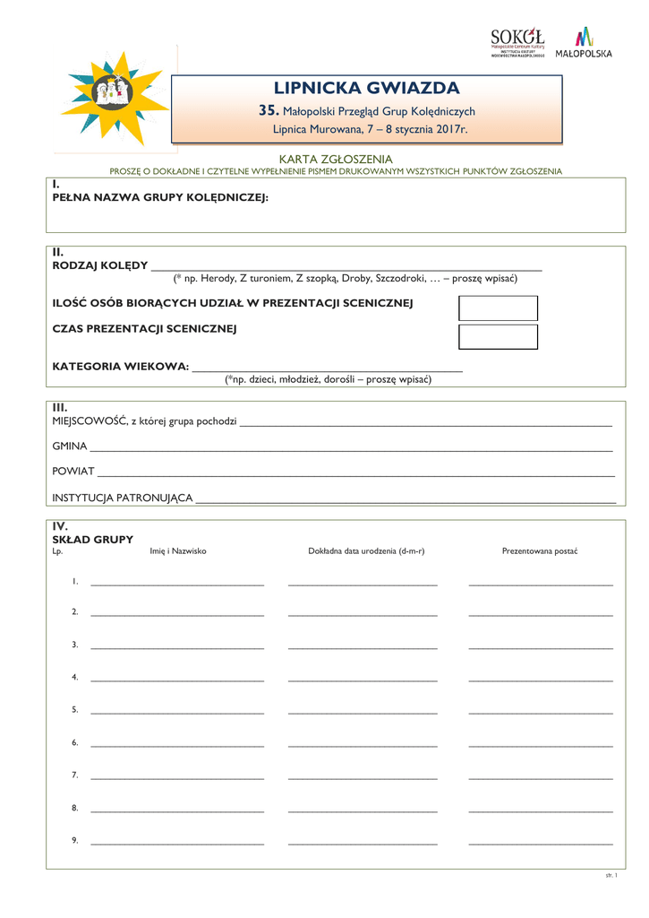 LIPNICKA GWIAZDA 35. Małopolski Przegląd Grup Kolędniczych Lipnica Murowana, 7 – 8 stycznia 2017r. KARTA ZGŁOSZENIA PROSZĘ O DOKŁADNE I CZYTELNE WYPEŁNIENIE PISMEM DRUKOWANYM WSZYSTKICH PUNKTÓW ZGŁOSZENIA I. PEŁNA NAZWA GRUPY KOLĘDNICZEJ: II. RODZAJ KOLĘDY _________________________________________________________________ (* np. Herody, Z turoniem, Z szopką, Droby, Szczodroki, … – proszę wpisać) ILOŚĆ OSÓB BIORĄCYCH UDZIAŁ W PREZENTACJI SCENICZNEJ CZAS PREZENTACJI SCENICZNEJ min KATEGORIA WIEKOWA: _____________________________________________ (*np. dzieci, młodzież, dorośli – proszę wpisać) III. MIEJSCOWOŚĆ, z której grupa pochodzi ______________________________________________________________ GMINA _______________________________________________________________________________________ POWIAT ______________________________________________________________________________________ INSTYTUCJA PATRONUJĄCA ______________________________________________________________________ IV. SKŁAD GRUPY Lp. Imię i Nazwisko Dokładna data urodzenia (d-m-r) Prezentowana postać 1. ____________________________________ _______________________________ ______________________________ 2. ____________________________________ _______________________________ ______________________________ 3. ____________________________________ _______________________________ ______________________________ 4. ____________________________________ _______________________________ ______________________________ 5. ____________________________________ _______________________________ ______________________________ 6. ____________________________________ _______________________________ ______________________________ 7. ____________________________________ _______________________________ ______________________________ 8. ____________________________________ _______________________________ ______________________________ 9. ____________________________________ _______________________________ ______________________________ str. 1 10. ____________________________________ _______________________________ ______________________________ 11. ____________________________________ _______________________________ ______________________________ 12. ____________________________________ _______________________________ ______________________________ V. DANE TELEADRESOWE KIEROWNIKA/INSTRUKTORA GRUPY Imię i Nazwisko _________________________________________________________________________________ Adres zamieszkania: kod __________ miejscowość_____________________ ul. nr lokalu ________________________ tel. kontaktowy kier. __________ nr _______________________ kom._____________________________________ e-mail: ________________________________________________________________________________________ VI. INFORMACJE DLA ORGANIZATORA DOTYCZĄCE WYŻYWIENIA dzień występu ilość osób w grupie w tym: kapela , opiekunowie, kierowca ILOŚĆ POSIŁKÓW DLA min OSÓB min UWAGA ! Dla uczestników przeglądu przewidziany jest jeden gorący posiłek i gorący napój w dniu występu. Kierownik otrzymuje bloczki wyżywieniowe w biurze organizacyjnym po wypełnieniu listy uczestników, według ilości zgłoszonej w karcie zgłoszenia. VII. * wypełnić alternatywnie INFORMACJE NIEZBĘDNE DO PRZESŁANIA NAGRÓD PIENIĘŻNYCH (dot. instytucji, stowarzyszenia - może być prywatne, osoby z kierownictwa GRUPY ) nazwa Banku ____________________________________________ siedziba Banku ____________________________ nr konta /26 cyfr/ __-____-____-____-____-____-____ właściciel konta _________________________________________________________________________________ Adres zamieszkania: kod __________ miejscowość____________________________ ul. nr lokalu _________________ Uwaga! Oświadczam, że ja _________________________________________________________ legitymujący(a) się dowodem osobistym seria i nr __________________________________ jestem świadomy(a) odpowiedzialności karnej za podanie nieprawdziwych z art. 233 ustawy z dnia 6 czerwca 1997 r. Kodeks karny. Podane informacje w karcie zgłoszenia są zgodne z prawdą i aktualne. Oświadczam, że zapoznałam/łem się z treścią regulaminu i akceptuję jego treść. danych, wynikającej Uwaga! Zgodnie z Ustawą z dnia 29.08.1997 roku o ochronie danych osobowych Dz. U. nr 133/97, poz. 883 z późniejszymi zmianami wyrażam zgodę na umieszczenie moich danych osobowych w bazie danych MCK SOKÓŁ oraz ich przetwarzanie zgodne z zasadami organizacyjnymi wynikającymi z działalności MCK SOKÓŁ w Nowym Sączu. _________________________________ /podpis oraz pieczęć instytucji delegującej / _________________________________ /podpis kierownika – instruktora/ ________________________________ /data/ BARDZO PROSZĘ O NADSYŁANIE KART ZGŁOSZEŃ DO DNIA 9 GRUDNIA 2016r. str. 2