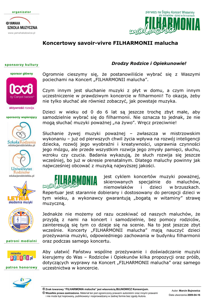 organizator www.yamahakatowice.pl Koncertowy savoir-vivre FILHARMONII malucha sponsorzy kultury sponsor główny Drodzy Rodzice i Opiekunowie! Ogromnie cieszymy się, że postanowiliście wybrać się z Waszymi pociechami na Koncert „FILHARMONII malucha”. Czym innym jest słuchanie muzyki z płyt w domu, a czym innym uczestniczenie w prawdziwym koncercie w filharmonii! To okazja, żeby nie tylko słuchać ale również zobaczyć, jak powstaje muzyka. sponsorzy wspierający Dzieci w wieku od 0 do 6 lat są jeszcze trochę zbyt małe, aby samodzielnie wybrać się do filharmonii. Nie oznacza to jednak, że nie mogą słuchać muzyki poważnej „na żywo”. Wręcz przeciwnie! Słuchanie żywej muzyki poważnej – zwłaszcza w mistrzowskim wykonaniu – już od pierwszych chwil życia wpływa na rozwój inteligencji dziecka, rozwój jego wyobraźni i kreatywności, usprawnia czynności jego mózgu, ale przede wszystkim rozwija jego zmysły pamięci, słuchu, wzroku czy czucia. Badania wykazują, że słuch rozwija się jeszcze wcześniej, bo już w okresie prenatalnym. Dlatego maluchy powinny jak najwcześniej obcować z muzyką najwyższej jakości. jest cyklem koncertów muzyki poważnej, skierowanych specjalnie do maluchów, niemowlaków i dzieci w brzuszkach. Repertuar jest starannie dobierany i dostosowany do percepcji dzieci w tym wieku, a wykonawcy gwarantują „bogatą w witaminy” strawę muzyczną. pat roni m edi al ni Jednakże nie możemy od razu oczekiwać od naszych maluchów, że przyjdą z nami na koncert i samodzielnie, bez pomocy rodziców, zainteresują się tym co dzieje się na scenie. Na to jest jeszcze zbyt wcześnie. Koncerty „FILHARMONII malucha” mają nauczyć dzieci przeżywania muzyki, odpowiedniego zachowania w budynku filharmonii oraz podczas samego koncertu. pat ron honor owy Aby ułatwić Państwu wspólne przeżywanie i doświadczanie muzyki kierujemy do Was – Rodziców i Opiekunów kilka propozycji oraz próśb, dotyczących wyprawy na Koncert „FILHARMONII malucha” oraz samego uczestnictwa w koncercie. ® Znak towarowy “FILHARMONIA malucha” jest własnością BUJNOWICZ Konsorcjum. © Wszelkie prawa zastrzeżone. Materiał ten jest ograniczony prawami autorskimi oraz innymi prawami i nie może być kopiowany, publikowany i rozprowadzany w żadnej formie bez zgody Autora. Autor: Marcin Bujnowicz Data utworzenia 2009-04-16 organizator www.yamahakatowice.pl Zanim wybierzesz się na koncert (intelektualne przygotowanie) n opowiedz maluchowi o koncercie oraz o miejscu, do którego się udajecie; n pokaż dziecku fotografie instrumentów, które usłyszy podczas koncertu; sponsorzy kultury sponsor główny UWAGA: im bardziej wprowadzisz dziecko w atmosferę koncertu (jeszcze w domu), tym chętniej i aktywniej weźmie w nim udział. Udając się do Filharmonii powinnyśmy się do tego przygotować intelektualnie. Jest to, nota bene, bezwzględny obowiązek dla mężczyzny (Taty!). n ubiór do Filharmonii musi być elegancki, a dzieci uwielbiają się ubierać; Przybycie do filharmonii i czas przed koncertem n przybądź z dzieckiem do filharmonii odpowiednio wcześniej (na kwadrans przed rozpoczęciem koncertu), aby dziecko mogło poczuć atmosferę prawdziwej sali koncertowej; sponsorzy wspierający n zadbaj o to, aby maluch załatwił swoje potrzeby fizjologiczne przed koncertem (nawet, jeżeli nie wyraża chęci); n jeżeli macie jeszcze chwilkę nie traćcie czasu – pozwiedzajcie filharmonii i przygotowane dla dzieci atrakcje; budynek n nie pozwól dziecku biegać, szaleć – zmęczy się, zupełnie zatraci koncentrację niezbędną do aktywnego słuchania muzyki, a przy okazji rozproszy innych młodych słuchaczy; n na salę koncertową nie wnosimy słodyczy i napojów; przypomnij dziecku o zasadach kulturalnego zachowania: podczas koncertu się (1) nie je, (2) nie pije i (3) nie rozmawia; W trakcie koncertu (przestrzegaj zasad etykiety) n wspólnie z dzieckiem aktywnie słuchaj muzyki; aby dziecko było zainteresowane koncertem – sam musisz wykazywać to zainteresowanie. Dziecko bierze z Ciebie przykład i naśladuje Cię! n nie rozmawiaj z dzieckiem w trakcie koncertu a zwłaszcza podczas muzycznych prezentacji; wyobraź sobie, że 300 osób będących na sali zaczyna równocześnie rozmawiać ... L n jeżeli Twoje dziecko zacznie hałasować bądź przeszkadzać – zwróć mu uwagę i przypomnij, jak powinno się zachowywać podczas koncertu lub udaj się cichutko do przygotowanego na tę sytuację Muzycznego Miasteczka n nie spacerujcie w trakcie koncertu po sali i/lub scenie – jeżeli będziecie musieli wyjść, zróbcie to w przerwie między utworami; pat roni m edi al ni n w czasie koncertu nie nagrywamy, nie fotografujemy i nie filmujemy, aby całą swoją uwagę oraz dziecka zwrócić ku słuchaniu muzyki; n jeżeli Twój maluch będzie się nudził, protestował, domagał powrotu do domu czy w inny głośny sposób wyrażał swoje niezadowolenie – nie upieraj się! Powtórz próbę za kilka miesięcy. pat ron honor owy Z każdym koncertem będzie lepiej i wkrótce wysłucha go w całości. Plik: „pub-SavoirVivre” Strona 2 z 2 Autor: Marcin Bujnowicz, dn. 2009-04-16 organizator www.yamahakatowice.pl „FILHARMONIA malucha” ma przyzwyczaić dzieci do słuchania muzyki i nauczyć je odpowiedniego zachowania podczas koncertów. sponsorzy kultury Musimy uczynić to wspólnie. sponsor główny My - organizatorzy i Wy – rodzice sponsorzy wspierający pat roni m edi al ni Szkoła Muzyczna YAMAHA w Katowicach istnieje od września 2006 roku i jest jedną z najlepszych w kraju. pat ron honor owy Potwierdzeniem są nagrody „Szkoła Roku 2006/07”, „Szkoła Roku 2007/08” i „Szkoła Roku 2008/09”. Dodatkowo Dyrekcja Szkoły otrzymała prestiżowy tytuł „Menedżer Roku 2008/09”. Obecnie Szkoła kształci muzycznie i umuzykalnia ponad 400 dzieci i młodzieży na prawie 20 programach nauczania, w tym ponad 50 n