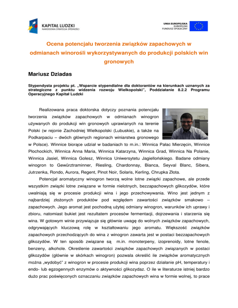 Ocena potencjału tworzenia związków zapachowych w odmianach winorośli wykorzystywanych do produkcji polskich win gronowych Mariusz Dziadas Stypendysta projektu pt. „Wsparcie stypendialne dla doktorantów na kierunkach uznanych za strategiczne z punktu widzenia rozwoju Wielkopolski”, Poddziałanie 8.2.2 Programu Operacyjnego Kapitał Ludzki Realizowana praca doktorska dotyczy poznania potencjału tworzenia związków zapachowych w odmianach winogron używanych do produkcji win gronowych uprawianych na terenie Polski (w rejonie Zachodniej Wielkopolski (Lubuskie), a także na Podkarpaciu – dwóch głównych regionach winiarstwa gronowego w Polsce). Winnice biorące udział w badaniach to m.in.: Winnica Pałac Mierzęcin, Winnice Płochockich, Winnica Anna Maria, Winnica Katarzyna, Winnica Grad, Winnica Na Polanie, Winnica Jasiel, Winnica Golesz, Winnica Uniwersytetu Jagiellońskiego. Badane odmiany winogron to Gewürztraminner, Riesling, Chardonnay, Bianca, Seyval Blanc, Sibera, Jutrzenka, Rondo, Aurora, Regent, Pinot Noir, Solaris, Kerling, Chrupka Złota. Potencjał aromatyczny winogron tworzą wolne lotne związki zapachowe, ale przede wszystkim związki lotne związane w formie nielotnych, bezzapachowych glikozydów, które uwalniają się w procesie produkcji wina i jego przechowywania. Wino jest jednym z najbardziej złożonych produktów pod względem zawartości związków smakowo – zapachowych. Jego aromat jest pochodną użytej odmiany winogron, warunków ich uprawy i zbioru, natomiast bukiet jest rezultatem procesów fermentacji, dojrzewania i starzenia się wina. W gotowym winie przywiązuje się głównie uwagę do wolnych związków zapachowych, odgrywających kluczową rolę w kształtowaniu jego aromatu. Większość związków zapachowych przechodzących do wina z winogron zawarta jest w postaci bezzapachowych glikozydów. W ten sposób związane są m.in. monoterpeny, izoprenoidy, lotne fenole, benzeny, alkohole. Określenie zawartości związków zapachowych związanych w postaci glikozydów (głównie w skórkach winogron) pozwala określić ile związków aromatycznych można „wydobyć” z winogron w procesie produkcji wina poprzez działanie pH, temperatury i endo- lub egzogennych enzymów o aktywności glikozydaz. O ile w literaturze istniej bardzo dużo prac poświęconych oznaczaniu związków zapachowych wina w formie wolnej, to prace poświęcone prekursorom tych związków stanowią kilka procent (<5) wszystkich publikacji. Nigdy nie badano pod tym względem odmian Vitisvinifera oraz krzyżówek i odmian rodzimych uprawianych w Polsce. Odmiany winorośli krzyżowane przez lata są bardziej odporne na choroby i chłodniejszy klimat z uwagi na ich pochodzenie. Metody analityczne stosowane w tych badaniach to m.in. ekstrakcja do fazy stałej (C18) (rys.1), chromatografia gazowa i spektrometria mas oraz kompletna dwuwymiarowa chromatografia gazowa (rys.2). Ekstrakcja do fazy stałej jest jednym ze sposobów izolowania analitu. Mechanizm rozdziału odbywa się w układzie ciecz-ciało stałe przy zastosowaniu zmodyfikowanych materiałów krzemionkowych. Rozdział związków zachodzi tylko wtedy, kiedy wiązanie między sorbentem, a analitem jest silniejsze niż oddziaływanie między analitem i matrycą próbki. Etapy SPE to: 1. Kondycjonowanie złoża 2. Wprowadzenie próbki 3. Wymywanie zanieczyszczeń 4. Elucjaanalitu 5. Zatężenie ekstraktu do analizy GC/MS. Do szacowania zawartości aromatu: wolnych związków aromatycznych zsyntetyzowano znakowane izotopowo alkohole [2H7] – geraniol, [2H7] – nerol, [2H3] – β jonon oraz [2H8] – naftalen, oraz do szacowania aromatycznych aglikonów 2 zwianych glikozydowo 2 zsyntetyzowano znakowane izotopowo glikozydy [ H7] - geraniolu oraz [ H7] – nerolu połączone z β-D-glukozą. Rysunek 1. Ekstrakcja do fazy stałej na kolumnach z wypełnieniem C18 za pomoca stacji SUPELCO. Rysunek 2.. Chromatogram uzyskany występujących w surowcu Vitisvinifera. Vitisvinifera po rozdziale mieszaniny związków związków aromatycznych Jak wynika z wstępnych pnych bada badań (sezon 1), surowiec roślinny linny (jest bardzo zró zróżnicowany pod względem zawartości ci zwi związków zków zapachowych skumulowanych w postaci nielotnych glikozydów, przez co istotne staje się si zastosowanie technik pozwalającyc ących na wzbogacenie matrycy wina rys.2. Aurora Katarzyna Bianca Na Polanie ilość µg/kg ilość µg/kg 16000 10000 9000 8000 7000 6000 5000 4000 3000 2000 1000 0 14000 12000 10000 8000 6000 4000 2000 Monoterpeny wolne zw. zapachowe zw.zapach. po h.kwas. Lotne fenole C13 norizoprenoidy zw.zapach. po h.enzymat. 0 Monoterpeny zw.zapach. po h.kwas. Lotne fenole zw.zapach. C13 po h.enzymat. norizoprenoidy wolne zw. zapachowe Rysunek 3. Porównanie zawartości wybranych związków zapachowych w dwóch białych odmianach winogron Aurora i Bianca. Na rys.1 przedstawiono wybrane odmiany średniej klasy, które są wykorzystywane do wyrobu białego wina gronowego. Odmiana Aurora z winnicy Katarzyna cechuje się typowym aromatem win półwytrawnych. Potencjał aromatyczny w tej odmianie w stosunku do zawartości wolnych związków jest niewielki, co wpłynie na niewielkie zmiany w bukiecie podczas dojrzewania wina. Nawet w przypadku zastosowania specyficznych hydrolaz efekt uwolnienia potencjału aromatycznego nie wpłynie znacząco na poprawę aromatu. W porównaniu z odmianą Bianca z winnicy Na Polanie, która cechuje się słabym aromatem kształtowanym przez wolne związki zapachowe, potencjał aromatyczny tej odmiany jest zdecydowanie większy. To oznacza, iż pomimo średniej jakości wina, zastosowanie specyficznych hydrolaz w trakcie procesu produkcji wpłynie znacząco na aromat wina, wzbogacając matrycę w nuty kwiatowo-owocowe pochodzące od monoterpenów. Te informacje wskazują na potencjał ukryty w owocach oraz niejako segregują odmiany, z których wytworzone wina „nie mogą” lub „powin