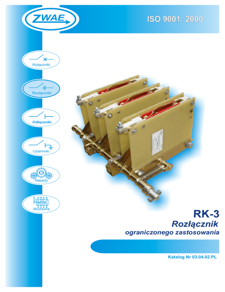 ISO 9001: 2000 Wyłączniki Rozłączniki Odłączniki Uziemniki Napędy Akcesoria RK-3 Rozłącznik ograniczonego zastosowania Katalog Nr 03.04.02.PL 1. ZASTOSOWANIE. Rozłączniki ograniczonego zastosowania typu RK-3 przewidziane są do stosowania w rozdzielniach kopalnianych na napięcie do 7,2kV. Są idealnym zamiennikiem za rozłączniki typu OKR produkcji ZWAR. Niniejsze rozłączniki przeznaczone są do załączania i wyłączania prądów biegu jałowego transformatorów zabudowanych w stacjach transformatorowych stosowanych w górnictwie. Rozłącznik ten jest aparatem dwupołożeniowym - w pierwszej pozycji zwiera przyłącza dolne z górnym, w drugiej uziemia dolne przyłącze równocześnie stwarzając widoczną i bezpieczną przerwę izolacyjną w powietrzu miedzy przyłączami, przez co spełnia odnośne wymagania norm dla odłączników. 4 1 2. ZALETY. & & & & & idealny zamnienik za rozłącznik typu OKR; wysokie parametry techniczno eksploatacyjne; prosta obsługa; niezawodność działania; możliwość zabudowy napędów o ruchu obrotowym i posuwistym cięgna; & możliwość wyboru strony zabudowy napędu (lewa / prawa); & współpraca z napędem silnikowym typu NSW30 oraz NSP20; 3. BUDOWA I ZASADA DZIAŁANIA. Rozłączniki typu RK-3 mają konstrukcję sieczną. Każdy biegun rozłącznika posiada dwa izolatory wsporcze 1 w kształcie płyt, pomiędzy którymi są osadzone dwa styki nieruchome: górny 2 i dolny 3 oraz usprężynowany zaskokowy styk pomocniczy opalny 4 usytuowany przy górnym styku nieruchomym 2 i połączony z nim elektrycznie. Człon stykowy ruchomy bieguna, zawierający dwa usprężynowane styki główne 5 oraz usytuowany między nimi usprężynowany styk pomocniczy opalny 6, jest zamocowany obrotowo do dolnego styku nieruchomego 3 i tworzy z nim zestyk nierozłączalny. Podstawę rozłącznika tworzą dwie stopy 7 połączone ze sobą oraz z biegunami przy pomocy sworzni 8 i tulei dystansowych 9. W podstawie są osadzone styki uziemnika 10 oraz wał napędowy 11 wraz z siłownikiem sprężynowym 12. W stanie zamkniętym rozłącznika, styki główne ruchome 5 każdego bieguna tworzą zestyk z górnymi stykami nieruchomymi 2. W wyniku obrotu wału napędowego 11 wspomaganego przez siłownik sprężynowy 12 następuje szybki obrót członu stykowego ruchomego każdego bieguna w kierunku – do podstawy. Po odłączeniu styków głównych ruchomych 5 od górnych styków nieruchomych 2 prąd biegu jałowego transformatora płynie przez styki pomocnicze opalne 4 i 6. Po ich rozłączeniu zapala się między nimi łuk elektryczny, gaszony w wyniku szybkiego rozciągania. Po zgaszeniu łuku styki główne ruchome 5 każdego bieguna zajmują położenie spoczynkowe w stanie otwartym rozłącznika, tworząc jednocześnie zestyk ze stykami 10 uziemnika. Podczas zamykania rozłącznika prąd biegu jałowego transformatora jest załączany przez szybko poruszające się styki główne ruchome 5 wchodzące w styczność ze stykami nieruchomymi 2. 10 12 1 7 11 6 4 2 9 3 5 7 8 4. ZGODNOŚĆ Z NORMAMI. Rozłączniki typu RK-3 spełniają wymagania następujących norm: & PN - EN 62271 - 102 : 2005 & PN - EN 60694 : 2004 & PN - EN 60265-1: 2001 5. DANE TECHNICZNE. Lp. WARTOŚĆ Napięcie znamionowe robocze 7,2 [kV] 2. Częstotliwość znamionowa 50 [Hz] 3. Prąd znamionowy ciągły 630 [A] 4. Prąd znamionowy wyłączeniowy nieobciążonego transformatora 5. Prąd szczytowy wytrzymywany 40 [kA] 6. Prąd zwarciowy wytrzymywany 1-sek. 16 [kA] 7. Napięcie znamionowe wytrzymywane przemienne 1min 50Hz dla izolacji: 8. Strona 2/4 PARAMETR 1. 5 [A] - doziemnej i międzybiegunowej 20 [kV] - międzyzaciskowej 23 [kV] Napięcie znamionowe piorunowe wytrzymywane dla izolacji: 9. Masa rozłącznika: 10. Trwałość mechaniczna - doziemnej i międzybiegunowej 60 [kV] - międzyzaciskowej 70 [kV] 25 [kg] 2000 cykli ZWAE Sp. z o.o. 6. SZKIC WYMIAROWY ROZŁĄCZNIKA TYPU RK-3 Uwaga: Zastrzega się możliwość wprowadzania zmian wynikających z postępu technicznego. ZWAE Sp. z o.o. Strona 3/4 7. SZKIC WYMIAROWY PRZYŁĄCZY ROZŁĄCZNIKA 8. ROZSTAW OTWORÓW MONTAŻOWYCH ROZŁĄCZNIKA Zakład Wytwórczy Aparatów Elektrycznych Sp. z o.o. ul. Gdańska 60; 84-300 Lębork Tel.: (059) 86-336-15; Fax: (059) 86-333-86 e-mail: [email protected] www.zwae.com.pl