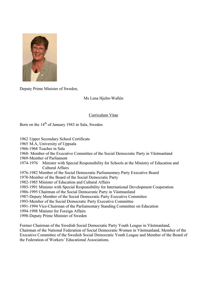 Deputy Prime Minister of Sweden, Ms Lena Hjelm-Wallén Curriculum Vitae Born on the 14th of January 1943 in Sala, Sweden 1962 Upper Secondary School Certificate 1965 M.A, University of Uppsala 1966-1968 Teacher in Sala 1968- Member of the Executive Committee of the Social Democratic Party in Västmanland 1969-Member of Parliament 1974-1976 Minister with Special Responsibility for Schools at the Ministry of Education and Cultural Affairs 1976-1982 Member of the Social Democratic Parliamentary Party Executive Board 1978-Member of the Board of the Social Democratic Party 1982-1985 Minister of Education and Cultural Affairs 1985-1991 Minister with Special Responsibility for International Development Cooperation 1986-1995 Chairman of the Social Democratic Party in Västmanland 1987-Deputy Member of the Social Democratic Party Executive Committee 1993-Member of the Social Democratic Party Executive Committee 1991-1994 Vice-Chairman of the Parliamentary Standing Committee on Education 1994-1998 Minister for Foreign Affairs 1998-Deputy Prime Minister of Sweden Former Chairman of the Swedish Social Democratic Party Youth League in Västmanland, Chairman of the National Federation of Social Democratic Women in Västmanland, Member of the Executive Committee of the Swedish Social Democratic Youth League and Member of the Board of the Federation of Workers’ Educational Associations.