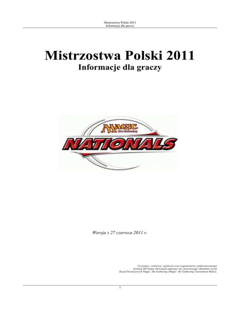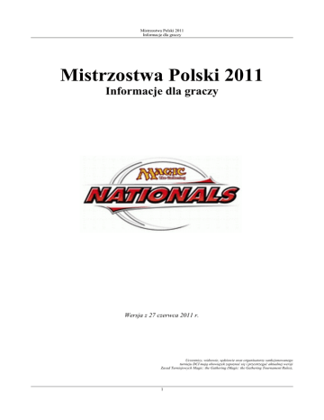 Mistrzostwa Polski 2011 Informacje dla graczy Mistrzostwa Polski 2011 Informacje dla graczy Wersja z 27 czerwca 2011 r. Uczestnicy, widzowie, sędziowie oraz organizatorzy sankcjonowanego turnieju DCI mają obowiązek zapoznać się i przestrzegać aktualnej wersji Zasad Turniejowych Magic: the Gathering (Magic: the Gathering Tournament Rules), 1 Mistrzostwa Polski 2011 Informacje dla graczy 1. SPRAWY ORGANIZACYJNE 1.1. Lokalizacja Hotel Gromada Centrum Pl. Powstańców Warszawy 2 Warszawa 1.2. Dojazd Z Dworca Centralnego: 1,7 kilometra (20 minut piechotą) 1.3. Termin rozgrywek Mistrzostwa Polski 2011 odbędą się w dniach 2-3 lipca 2011 r. Dzień wcześniej (1 lipca) odbędą się turnieje kwalifikacyjne ostatniej szansy – Grindery. 1.4. Noclegi Noclegi należy zapewnić sobie we własnym zakresie. 1.5. Przydatne informacje w Internecie Najnowsze informacje o Mistrzostwach Polski: Strona firmy ISA Informacje o Warszawie: Plan Warszawy Strona Hotelu Gromada 2 Mistrzostwa Polski 2011 Informacje dla graczy 2. ZASADY OBOWIĄZUJĄCE PODCZAS MISTRZOSTW POLSKI 2.1. Widzowie Widzowie mogą oglądać przebieg meczów. Muszą jednak przestrzegać następujących reguł: – Nie wolno rozmawiać z graczami i między sobą. – Należy umożliwić sędziom swobodne przejście i dostęp do stolików, przy których odbywają się mecze. – Widzom nie wolno siadać przy stolikach. – Nie wolno przestawiać krzeseł, stołów, numerów stolików. – Gracz ma prawo poprosić sędziego o odsunięcie widza od stolika, przy którym gra, bez podania przyczyny. Osoby, które zauważyły złamanie zasad gry bądź DCI, powinny niezwłocznie powiadomić sędziego. W żadnym wypadku NIE wolno interweniować samodzielnie, można jedynie poprosić graczy, aby przerwali grę. Na terenie Mistrzostw Polski obowiązuje zakaz spożywania alkoholu i palenia. Zabronione jest zamawianie i wnoszenie jedzenia zakupionego poza restauracją hotelową „U Chłopa”, która oferuje posiłki przez cały czas trwania Mistrzostw. Możliwe, że będzie też upust dla graczy na hasło „Magic”. Sędzia główny, organizator lub kierownictwo obsługi obiektu mogą zakazać wstępu na teren Mistrzostw Polski osobom nieprzestrzegającym powyższych zasad lub innych obowiązujących regulaminów. 2.2. Prasa Przebieg meczów i draftów mogą notować, fotografować lub nagrywać wyłącznie osoby, które uzyskały zgodę sędziego głównego. Osoby, które chcą relacjonować mecze, w szczególności mecze pokazowe (ang. feature match), powinny skontaktować się wcześniej z sędzią głównym. 2.3. Uczestnicy Mistrzostw Polski Uczestnicy Mistrzostw Polski są zobowiązani do przestrzegania zasad, o których mowa w punkcie 2.1. Widzowie. Ponadto: – na stołach do gry nie wolno stawiać napojów i jedzenia; – na prośbę sędziego ze stołu należy usunąć maskotki, pudełka na karty itp. 2.4. Mecze pokazowe W każdej rundzie jedna lub więcej par graczy może zostać wybrana do meczu pokazowego. Mecze te rozgrywa się w specjalnie do tego wyznaczonym miejscu. Gracz nie może odmówić uczestnictwa w takim meczu i jest zobowiązany ujawnić osobie relacjonującej przebieg rozgrywki swoje decyzje dotyczące wymiany kart pomiędzy talią a talią pomocniczą (ang. sideboard). 3 Mistrzostwa Polski 2011 Informacje dla graczy 2.5. Telefony komórkowe Na terenie Mistrzostw Polski obowiązuje zakaz rozmawiania przez telefony komórkowe. Aparaty powinny mieć wyciszony dzwonek. Sędzia główny może uchylić tę zasadę w wyjątkowych okolicznościach na indywidualną prośbę uczestnika. 4 Mistrzostwa Polski 2011 Informacje dla graczy 3. DODATKOWE ATRAKCJE 3.1. Grinder A Data: Format: Nagrody: Koszt: Rejestracja: Start turnieju: Uwagi: 1 lipca 2011 (piątek) Standard, system pucharowy (single-elimination) 4 zaproszenia na Mistrzostwa Polski 30 zł 11.00-11.30 11.30 po wyłonieniu Top 4 turniej nie będzie kontynuowany Grinder B Data: Format: Nagrody: Koszt: Rejestracja: Start turnieju: Uwagi: 1 lipca 2011 (piątek) Standard, system pucharowy (single-elimination) 4 zaproszenia na Mistrzostwa Polski 30 zł 16.00-16.30 16.30 po wyłonieniu Top 4 turniej nie będzie kontynuowany 3.2. Egzaminy sędziowskie Egzaminy sędziowskie przeprowadza Sebastian Pękala. Osoby pragnące zdawać egzamin sędziowski powinny wysłać zgłoszenie do sędziowania Mistrzostw Polski jak każdy sędzia. Egzamin sędziowski wymaga wcześniejszego przygotowania, w tym nauczenia się zasad gry oraz zasad turniejowych, a także zaliczonego Rules Advisor Test (http://judge.wizards.com). Od kandydatów będzie wymagane sędziowanie podczas wszystkich trzech dni Mistrzostw Polski. 3.3. Turnieje otwarte (Public events) Przewiduje się następujące turnieje towarzyszące podczas Mistrzostw Polski: Piątek: 12:30 – Turniej na życzenie – Legacy #1 wpisowe: 40 zł, nagrody: co najmniej 6 boosterów na osobę do puli. Niedziela: 11:15 – PTQ Philadelphia wpisowe: 50 zł, nagrody: bilet dla zwycięzcy oraz nagrody pocieszenia dla Top 8. 12:00 – Turniej na życzenie – Legacy #2 wpisowe: 40 zł, nagrody: co najmniej 6 boosterów na osobę do puli. Ponadto, codziennie będą się odbywać sankcjonowane turnieje Booster Draft i Constructed. Początek każdego turnieju od razu po zebraniu ośmiu chętnych. Wpisowe: Constructed – 15 zł, pula nagród: booster za każdego uczestnika Booster Draft – 30 zł / 24 zł (zależnie od edycji), nagrody: zestaw draftowy dla zwycięzcy. Podobnie jak co roku, firma ISA planuje promocje-niespodzianki, w tym superatrakcyjne drafty z niskim wpisowym. 5 Mistrzostwa Polski 2011 Informacje dla graczy 3.4. Inne turnieje otwarte Osoby mające własny pomysł na urozmaicenie Mistrzostw Polski lub ciekawy turniej proszone są o kontakt z Marcelem Zaborskim ([email protected]). 6 Mistrzostwa Polski 2011 Informacje dla graczy 4. HARMONOGRAM MISTRZOSTW POLSKI Godziny zaznaczone kursywą są orientacyjne i mogą ulec zmianie. Pią