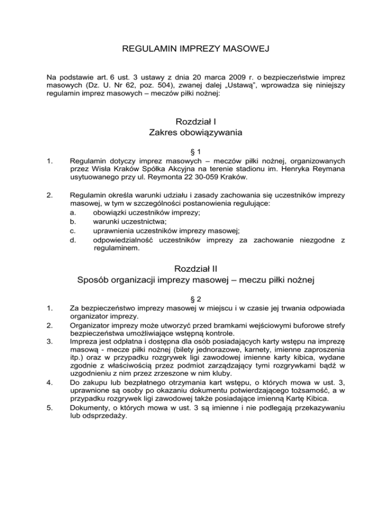 REGULAMIN IMPREZY MASOWEJ Na podstawie art. 6 ust. 3 ustawy z dnia 20 marca 2009 r. o bezpieczeństwie imprez masowych (Dz. U. Nr 62, poz. 504), zwanej dalej „Ustawą”, wprowadza się niniejszy regulamin imprez masowych – meczów piłki nożnej: Rozdział I Zakres obowiązywania 1. 2. §1 Regulamin dotyczy imprez masowych – meczów piłki nożnej, organizowanych przez Wisła Kraków Spółka Akcyjna na terenie stadionu im. Henryka Reymana usytuowanego przy ul. Reymonta 22 30-059 Kraków. Regulamin określa warunki udziału i zasady zachowania się uczestników imprezy masowej, w tym w szczególności postanowienia regulujące: a. obowiązki uczestników imprezy; b. warunki uczestnictwa; c. uprawnienia uczestników imprezy masowej; d. odpowiedzialność uczestników imprezy za zachowanie niezgodne z regulaminem. Rozdział II Sposób organizacji imprezy masowej – meczu piłki nożnej 1. 2. 3. 4. 5. §2 Za bezpieczeństwo imprezy masowej w miejscu i w czasie jej trwania odpowiada organizator imprezy. Organizator imprezy może utworzyć przed bramkami wejściowymi buforowe strefy bezpieczeństwa umożliwiające wstępną kontrole. Impreza jest odpłatna i dostępna dla osób posiadających karty wstępu na imprezę masową - mecze piłki nożnej (bilety jednorazowe, karnety, imienne zaproszenia itp.) oraz w przypadku rozgrywek ligi zawodowej imienne karty kibica, wydane zgodnie z właściwością przez podmiot zarządzający tymi rozgrywkami bądź w uzgodnieniu z nim przez zrzeszone w nim kluby. Do zakupu lub bezpłatnego otrzymania kart wstępu, o których mowa w ust. 3, uprawnione są osoby po okazaniu dokumentu potwierdzającego tożsamość, a w przypadku rozgrywek ligi zawodowej także posiadające imienną Kartę Kibica. Dokumenty, o których mowa w ust. 3 są imienne i nie podlegają przekazywaniu lub odsprzedaży. Rozdział III Obowiązki uczestnika imprezy masowej – meczu piłki nożnej §3 1. Uczestnik imprezy jest obowiązany: a. nie zakłócać porządku publicznego; b. przestrzegać postanowień niniejszego regulaminu oraz regulaminu obiektu; c. posiadać przy sobie i okazywać każdorazowo na żądanie służb porządkowych, służb informacyjnych lub stewardów imprezy masowej dokument uprawniający do wejścia i przebywania na imprezie oraz dokument tożsamości bądź w przypadku ligi zawodowej wydaną w ramach tej ligi Kartę Kibica; d. zajmować miejsce określone w dokumencie uprawniającym do wejścia na imprezę masową; e. nie zagrażać bezpieczeństwu innych osób obecnych na imprezie masowej; f. stosować się do poleceń porządkowych wydawanych przez służby porządkowe, służby informacyjne i stewardów organizatora imprezy masowej, a w przypadku interwencji funkcjonariuszy Policji, Państwowej Straży Pożarnej, Straży Granicznej, Żandarmerii Wojskowej lub pracowników innych uprawnionych służb i organów – do wykonywania ich poleceń; 2. Ze względu na bezpieczeństwo imprezy masowej uczestnicy imprezy masowej, na żądanie służby porządkowej, służby informacyjnej lub stewardów zobowiązani są zajmować miejsca nie inne niż określone w dokumencie uprawniającym do wejścia na obiekt. Rozdział IV Warunki uczestnictwa w imprezie masowej – meczu piłki nożnej 1. 2. §4 Zakazuje się wstępu na imprezę masową – mecze piłki nożnej osobie: a. wobec której zostało wydane orzeczenie zakazujące wstępu na imprezę masową lub zobowiązujące do powstrzymania się od przebywania w miejscach przeprowadzanych imprez masowych; b. wobec której wydano zakaz zagraniczny lub zakaz klubowy; c. odmawiającej poddania się czynnościom określonym w art. 20 ustawy o bezpieczeństwie imprez masowych; d. znajdującej się pod widocznym wpływem alkoholu, środków odurzających i psychotropowych lub innych podobnie działających środków; e. zachowującej się agresywnie, prowokacyjnie albo w inny sposób stwarzającej zagrożenie dla bezpieczeństwa lub porządku publicznego; f. małoletniej do lat 13, nie będącej pod opieką osoby pełnoletniej. Podczas imprezy masowej – meczu piłki nożnej zabrania się w szczególności: a. używania elementów odzieży lub przedmiotu do zakrycia twarzy celem uniemożliwienia lub utrudnienia identyfikacji; b. głoszenia i wywieszania haseł o treściach obscenicznych, wulgarnych i rasistowskich, nawoływania do waśni na tle narodowościowym, religijnym, społecznym, itp.; c. rzucania przedmiotami; d. spożywania alkoholu, zażywania środków odurzających lub substancji psychotropowych; e. uporczywego stania poza miejscami zajmowanymi przez kibiców uczestniczących w zorganizowanym dopingu w sektorach wskazanych przez organizatora; f. rozniecania i podsycania ognia oraz palenia tytoniu poza miejscami do tego wyznaczonymi; g. posiadania materiałów wybuchowych, wyrobów pirotechnicznych oraz substancji o podobnym działaniu itp.; h. umieszczania transparentów lub flag w sposób ograniczający widoczność innym uczestnikom imprezy lub w sposób ograniczający widoczność materiałów reklamowych lub wyjść ewakuacyjnych; i. załatwiania potrzeb fizjologicznych poza toaletami i zaśmiecania terenu stadionu, a także niszczenia infrastruktury obiektu; j. nieuzasadnionego zajmowania miejsc w ciągach komunikacyjnych oraz w rejonie dróg ewakuacyjnych; k. używania urządzeń obiektu w sposób niezgodny z nich przeznaczeniem. 3. Zabrania się wnoszenia i posiadania na imprezie masowej – meczu piłki nożnej: a. broni, amunicji oraz innych niebezpiecznych przedmiotów, mogących być użytych jako broń; b. materiałów wybuchowych, wyrobów pirotechnicznych oraz substancji o podobnym działaniu oraz wszelkiego rodzaju materiałów pożarowo niebezpiecznych; c. pojemników na płyny lub produkty spożywcze wykonanych z twardego materiału, w tym butelek plastikowych; d. alkoholu, środków odurzających i psychotropowych lub innych podobnie działających środków; e. kasków, parasoli o ost