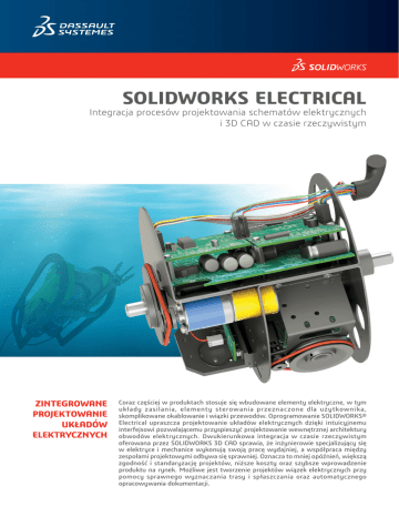 SOLIDWORKS ELECTRICAL Integracja procesów projektowania schematów elektrycznych i 3D CAD w czasie rzeczywistym ZINTEGROWANE PROJEKTOWANIE UKŁADÓW ELEKTRYCZNYCH Coraz częściej w produktach stosuje się wbudowane elementy elektryczne, w tym układy zasilania, elementy sterowania przeznaczone dla użytkownika, skomplikowane okablowanie i wiązki przewodów. Oprogramowanie SOLIDWORKS® Electrical upraszcza projektowanie układów elektrycznych dzięki intuicyjnemu interfejsowi pozwalającemu przyspieszyć projektowanie wewnętrznej architektury obwodów elektrycznych. Dwukierunkowa integracja w czasie rzeczywistym oferowana przez SOLIDWORKS 3D CAD sprawia, że inżynierowie specjalizujący się w elektryce i mechanice wykonują swoją pracę wydajniej, a współpraca między zespołami projektowymi odbywa się sprawniej. Oznacza to mniej opóźnień, większą zgodność i standaryzację projektów, niższe koszty oraz szybsze wprowadzenie produktu na rynek. Możliwe jest tworzenie projektów wiązek elektrycznych przy pomocy sprawnego wyznaczania trasy i spłaszczania oraz automatycznego opracowywania dokumentacji. SOLIDWORKS Electrical umożliwia integrację schematów elektrycznych z modelami SOLIDWORKS 3D i jednoczesne projektowanie układów elektromechanicznych. Nowoczesna metoda projektowania systemów elektrycznych W złożonym świecie projektowania elektromechanicznego utworzenie systemu elektrycznego za pomocą oprogramowania 3D CAD może być trudnym i niewdzięcznym zadaniem. Opracowywanie elementów projektu i definiowanie wewnętrznych połączeń elektrycznych między przewodami, okablowaniem oraz wiązkami to proces, który jest często pracochłonny i podatny na błędy. Tworzenie układów elektrycznych za pomocą rozwiązań 3D CAD zwykle odbywało się w oparciu o żmudne wprowadzanie danych i wymianę informacji projektowych w postaci plików zewnętrznych. Korzystanie z plików zewnętrznych może spowodować rozsynchronizowanie projektów elektrycznego i mechanicznego, a co za tym idzie — brak spójności procesu projektowania, produkcji i dostawy. Stosowane obecnie rozwiązania nie zapewniają także łatwej metody łączenia tych elementów projektu. Technologia SOLIDWORKS Electrical 3D™ umożliwia szybsze projektowanie schematycznych układów elektrycznych, które są gotowe do wdrożenia w modelu 3D CAD. Dzięki synchronizacji schematu elektrycznego z modelem 3D CAD można ujednolicić listę materiałów (LM) układu elektrycznego i mechanicznego oraz zapobiec występowaniu błędów wynikających z wprowadzania zmian w projekcie. Pakiety SOLIDWORKS Electrical udostępniają szereg narzędzi do tworzenia schematów elektrycznych oraz projektowania 3D: • SOLIDWORKS Electrical Schematic Wydajny i łatwy w obsłudze pakiet zsynchronizowanych narzędzi do projektowania, ułatwiający szybkie opracowywanie wewnętrznej architektury układów elektrycznych na potrzeby urządzeń i innych systemów. Wbudowane biblioteki symboli, informacji producenta o częściach i modeli komponentów 3D, stanowią uniwersalne materiały wielokrotnego użytku optymalizujące możliwości ponownego wykorzystania danego projektu. Zautomatyzowane narzędzia do projektowania oraz zarządzania ułatwiają i usprawniają szereg żmudnych zadań z zakresu projektowania, takich jak opracowywanie sterowników PLC i bloków zaciskowych czy też przypisywanie wzajemnych odsyłaczy. • SOLIDWORKS Electrical 3D Umożliwia dwukierunkową integrację danych z projektu schematu elektrycznego z modelem SOLIDWORKS 3D w czasie rzeczywistym. Oprogramowanie SOLIDWORKS Electrical 3D umożliwia dowolne rozmieszczenie komponentów elektrycznych i wykorzystanie zaawansowanej technologii SOLIDWORKS do wyznaczania trasy przebiegu przewodów, co pozwala na automatyczne połączenie elementów projektu elektrycznego z modelem 3D. Określanie optymalnej długości przewodów, kabli i wiązek odbywa się przy zachowaniu synchronizacji projektu oraz listy materiałów między projektami elektrycznym i mechanicznym. • SOLIDWORKS Electrical Professional Łatwy w obsłudze, wydajny pakiet stanowiący połączenie funkcji projektowania schematów elektrycznych dostępnych w programie SOLIDWORKS Electrical Schematic oraz opcji modelowania 3D oprogramowania SOLIDWORKS Electrical 3D. Pakiet SOLIDWORKS Electrical Professional jest idealny dla użytkowników korzystających z integracji projektów elektrycznych i mechanicznych z modelami 3D. WYBIERZ PAKIET SOLIDWORKS ELECTRICAL, KTÓRY ODPOWIADA TWOIM POTRZEBOM. SOLIDWORKS Electrical Schematic SOLIDWORKS Electrical 3D* Ten pakiet umożliwia tworzenie schematów obwodów elektrycznych i układów sterowania. Ten pakiet umożliwia dodawanie danych pakietu SOLIDWORKS Electrical Schematic do opracowywanego modelu trójwymiarowego SOLIDWORKS. Najważniejsze funkcje to: • Zaawansowana architektura bazy danych pozwalająca na pracę nad projektem wielu użytkownikom jednocześnie • Zintegrowane narzędzia do opracowywania schematów jednokreskowych, wielokreskowych i mieszanych • Raporty z testów z informacjami na temat integralności projektu • Kopiowanie i wklejanie obwodów w celu ponownego ich wykorzystania w innych projektach • Inteligentne funkcje wyszukiwania i filtrowania upraszczające szukanie elementów w jednym lub wielu projektach • Udoskonalone zarządzanie treścią (z uwzględnieniem internetowego portalu do obsługi zawartości) ułatwiające wybieranie dowolnych elementów • Raporty dotyczące obliczeń parametrów elektrycznych umożliwiające określanie właściwości zasilania obwodów (np. napięcie i straty energii) • Zaawansowane zarządzanie prawami umożliwiające opartą na użytkownikach kontrolę dostępu do narzędzi do projektowania elektrycznego i bibliotek. • Generowanie dokumentów SOLIDWORKS eDrawings® dla projektów, które umożliwiają bezproblemową integrację z urządzeniami przenośnymi • Błyskawiczna 