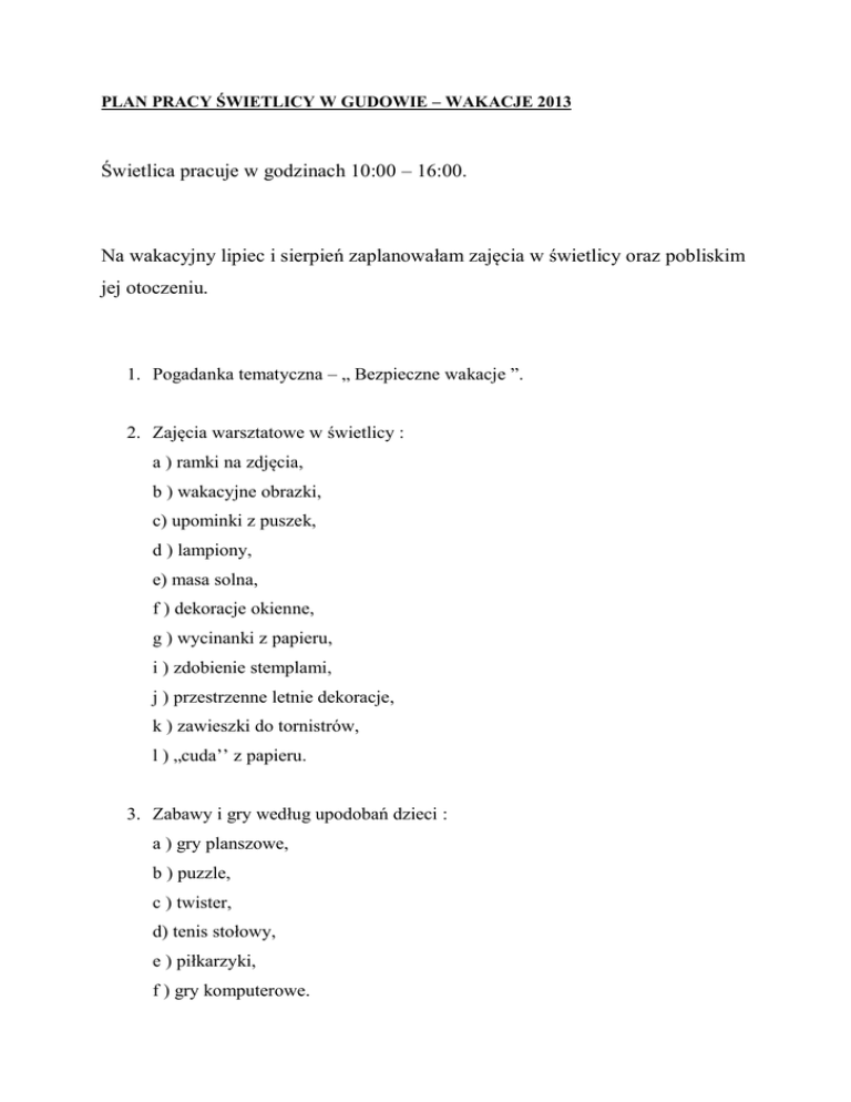 PLAN PRACY ŚWIETLICY W GUDOWIE – WAKACJE 2013 Świetlica pracuje w godzinach 10:00 – 16:00. Na wakacyjny lipiec i sierpień zaplanowałam zajęcia w świetlicy oraz pobliskim jej otoczeniu. 1. Pogadanka tematyczna – „ Bezpieczne wakacje ”. 2. Zajęcia warsztatowe w świetlicy : a ) ramki na zdjęcia, b ) wakacyjne obrazki, c) upominki z puszek, d ) lampiony, e) masa solna, f ) dekoracje okienne, g ) wycinanki z papieru, i ) zdobienie stemplami, j ) przestrzenne letnie dekoracje, k ) zawieszki do tornistrów, l ) „cuda’’ z papieru. 3. Zabawy i gry według upodobań dzieci : a ) gry planszowe, b ) puzzle, c ) twister, d) tenis stołowy, e ) piłkarzyki, f ) gry komputerowe. 4. Gry i zabawy tematyczne : a ) głuchy telefon, b ) pomidor, c ) kolorki, d ) ciepło – zimno, e ) kalambury – rysowane i pokazywane, f ) łamigłówki – krzyżówki, wykreślanki, sudoku, labirynt, rozsypane literki, szubienica, państwa – miasta. 5. Gry i zabawy na dziedzińcu świetlicy : a ) podchody, b ) berek lawina, c ) murarz, d ) zrób to co ja, e )ciuciubabka, f ) Szymon mówi, g ) klasy, h ) skakanka, i ) zbijak, j ) dwa ognie, k ) budujemy mosty, l ) „raz, dwa, trzy Babajaga patrzy ‘’, m ) kolanko. 6. Konkursy i turnieje ( plaża, świetlica, boisko ) a ) turniej szachowy, warcabowy, b ) turniej piłki plażowej, siatkowej, c ) turniej tenisa stołowego, d ) turniej piłkarzyków, e ) konkurs na najładniejszy zamek z piasku, f ) konkurs rysunkowy. 7. Wycieczki piesze - Gudowo i okolice 8. Rajdy rowerowe : a) Harcerska Górka, b) Suliszewo – świetlica, c) Jędrkowe Zakole, d) ścieżka rowerowa w Drawsku Pomorskim, e) Kamień Papieski w Drawsku Pomorskim. 9. Wyjazd do kina w Drawsku Pomorskim. 10. Wyjście na pobliskie strzeżone kąpielisko w Gudowie. 11. Bajki i filmy na DVD – tematyczne oraz według upodobań dzieci. 12. Piknik na łące połączony z mini lekcją przyrody. 13. „ Pidżama Party ‘’- wieczór i noc spędzona w budynku świetlicy. 14. Podsumowanie wakacji : a) wrażenia, b) oglądanie zdjęć i widokówek. INSTRUKTOR ŚWIETLICY – Jolanta Gilewicz