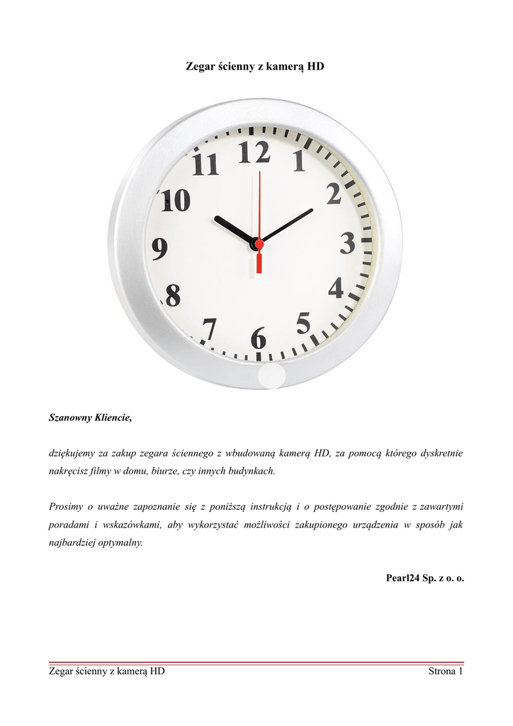 Zegar ścienny z kamerą HD Szanowny Kliencie, dziękujemy za zakup zegara ściennego z wbudowaną kamerą HD, za pomocą którego dyskretnie nakręcisz filmy w domu, biurze, czy innych budynkach. Prosimy o uważne zapoznanie się z poniższą instrukcją i o postępowanie zgodnie z zawartymi poradami i wskazówkami, aby wykorzystać możliwości zakupionego urządzenia w sposób jak najbardziej optymalny. Pearl24 Sp. z o. o. Zegar ścienny z kamerą HD Strona 1 Zawartość zestawu: • Zegar z wbudowaną kamerą HD w tarczy z nagrywarką • Kabel USB 2.0 • Instrukcja obsługi Potrzebne będą również: • 1 bateria typu AA (do pracy zegara) • Karta microSD do nagrywania filmów • Zasilacz USB – do ładowania baterii za pomocą gniazda elektrycznego. Zegar ścienny z kamerą HD Strona 2 Opis produktu: 1. Kamera 2. Czujnik ruchu 3. Komora baterii 4. Pokrętło do ustawiania czasu 5. Miejsce na zawieszenie 6. Ustawianie obiektywu 7. Pokrywa/Podstawka 8. RESET 9. Włączanie/wyłączanie 10. Gniazdo na kartę SD 11. Przycisk trybu (P) 12. Podłączenie zasilania (DC) 13. Dioda stanu LED 14. Port USB Zegar ścienny z kamerą HD Strona 3 Montaż/zawieszanie Rozstawianie: 1. Naciśnij delikatnie kciukami pokrywę i pociągnij ją do tyłu aż znajdzie się w odpowiednim miejscu. 2. Odchyl pokrywę w taki sposób, aby mogła posłużyć jako podstawka. WSKAZÓWKA Przesuń pokrywę nieco dalej (jak w punkcie pierwszym) i zdejmij ją, aby mieć dostęp do elementów kontrolnych oraz miejsc wejścia i wyjścia. Zawieszanie: Do montażu na ścianie użyj odpowiedniego i bezpiecznego materiału mocującego. Zegar ścienny z kamerą HD Strona 4 Zegar Włóż baterię typu AA do komory baterii z tyłu urządzenia. Należy zwrócić uwagę na prawidłową polaryzację. Obróć pokrętło, aby ustawić odpowiednią godzinę. WSKAZÓWKA Działanie i funkcja zegara jest całkowicie niezależna od rejestrowania wideo. Ładowanie kamery Za pomocą USB: Należy połączyć zegar za pomocą dołączonego kabla do komputera. Gdy urządzenie jest podłączone do komputera, rozpoczyna się ładowanie baterii. Proces ładowania może potrwać 4-6 godzin. Za pomocą zasilacza: Ładuj zegar ścienny za pomocą zasilacza pod napięciem stałym 5V. Nagrywanie video WSKAZÓWKA Przełącz zegar na włączony, aby funkcja nagrywania zaczęła działać. Ręczne włączanie: Przytrzymaj przycisk trybu P (patrz strona 3) przez 2 sekundy, aż niebieska dioda LED zaświeci się. Dioda LED zacznie migać na czerwono cztery razy, po czym zgaśnie i rozpocznie się nagrywanie. Aby zatrzymać nagrywanie naciśnij i zwolnij przycisk trybu P. Nagranie będzie automatycznie zapisane. Zegar ścienny z kamerą HD Strona 5 Czujnik ruchu: Naciśnij i puść przycisk trybu P. Dioda LED zaświeci się sześć razy na krótko, a potem zgaśnie. Kamera znajduje się w trybie gotowości. W przypadku, gdy kamera wykryje ruch, automatycznie rozpocznie się nagrywanie. Po ponownym zwolnieniu przycisku trybu P, tryb gotowości zakończy się, a ewentualne nagranie zostanie zatrzymane i zapisane. WSKAZÓWKA Po 45 sekundach bez zauważalnego ruchu, kamera przełącza się w tryb gotowości, zatrzymuje nagrywanie wideo i zapisuje film. Jeśli karta SD jest pełna, film z najstarszą datą zostanie nadpisany. UWAGA! Jeśli kamera nie jest ustawiona na określony tryb, wyłączy się automatycznie. Przełączanie odbywa się poprzez ponowne naciśnięcie przycisku ON / OFF! Ustawienia obiektywu Obróć obiektyw pokrętłem z tyłu zegara, aby ustawić kąt ustawienia aparatu podczas fotografowania. Podłączenie do komputera PC WSKAZÓWKA Podczas podłączania do PC funkcja kamery musi być wyłączona. Podłącz kabel do złącza mini USB na zegarze, a złącze USB do komputera PC. Kamera zostanie automatycznie rozpoznana jako nośnik pamięci masowej. Otwórz folder, aby uzyskać dostęp do nagranych filmów. Zegar ścienny z kamerą HD Strona 6 Data/godzina Utwórz katalog dla zegara z plikiem tekstowym time.txt. Wprowadź najpierw datę w następującym formacie: RRRR / MM / DD (rok / miesiąc / dzień), a następnie ustaw czas: godziny / minuty / sekundy. WSKAZÓWKA Twoje pliki są wyświetlane na komputerze bez rozszerzeń formatu pliku, wystarczy nazwać plik tekstowy jako „time”. Zegar ścienny z kamerą HD Strona 7 Dane techniczne: • Rozdzielczość video: 1280 x 720 (30fps) • Format video: AVI • System: Windows XP/Vista/7/8, Mac OS • Czas czuwania/baterii: ok. 600 godzin/ bateria litowo – polimerowa 1000 mAh • Czas nagrywania: ok. 5 godzin • Napięcie ładowania: 5V lub zasilanie 1A • Zakres czujnika ruchu: 3 do 8 metrów, 7- stopniowe sektory Czyszczenie Nie należy czyścić okna zegara szorstkimi, chropowatymi ściereczkami. Do czyszczenia zaleca się użycie szmatki z mikrofibry. Proszę nie używać silnych, żrących środków czyszczących. Zegar ścienny z kamerą HD Strona 8 Bezpieczeństwo • Niniejsza instrukcja ma na celu zapoznanie Państwa z zasadami prawidłowego korzystania z produktu. Zaleca się przechowywanie instrukcji w łatwo dostępnym miejscu, aby w razie potrzeby mogli Państwo zweryfikować informacje. • Wszelkie modyfikacje produktu obniżają poziom jego bezpieczeństwa. UWAGA! Istnieje ryzyko obrażeń! • Nie należy rozkładać ani naprawiać urządzenia samodzielnie! • Zaleca się ostrożne obchodzenie się z produktem. Produkt może ulec uszkodzeniu w wyniku uderzenia, wstrząsów lub upadku nawet z niewielkiej wysokości. • Produkt należy trzymać z dala od wilgoci i wysokiej temperatury. • Nie należy zanurzać urządzenia w wodzie oraz innych płynach. • Wszelkie prawa do wprowadzania zmian technicznych oraz eliminacji błędów są zastrzeżone. Ważne wskazówki dotyczące utylizacji Urządzenia elektrycznego nie zalicza się do odpadów gospodarstwa domowego. W celu właściwej utylizacji urządzenia należy skontaktować się z organizacją odpowiedzialną
