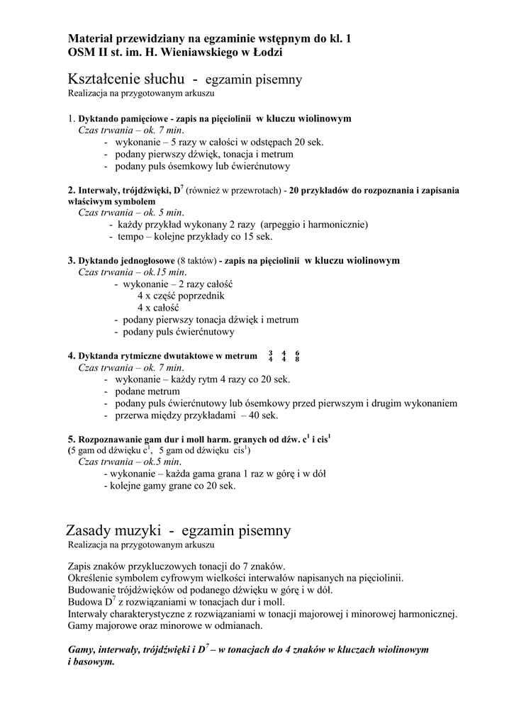 Materiał przewidziany na egzaminie wstępnym do kl. 1 OSM II st. im. H. Wieniawskiego w Łodzi Kształcenie słuchu - egzamin pisemny Realizacja na przygotowanym arkuszu 1. Dyktando pamięciowe - zapis na pięciolinii w kluczu wiolinowym Czas trwania – ok. 7 min. - wykonanie – 5 razy w całości w odstępach 20 sek. - podany pierwszy dźwięk, tonacja i metrum - podany puls ósemkowy lub ćwierćnutowy 2. Interwały, trójdźwięki, D7 (również w przewrotach) - 20 przykładów do rozpoznania i zapisania właściwym symbolem Czas trwania – ok. 5 min. - każdy przykład wykonany 2 razy (arpeggio i harmonicznie) - tempo – kolejne przykłady co 15 sek. 3. Dyktando jednogłosowe (8 taktów) - zapis na pięciolinii w kluczu wiolinowym Czas trwania – ok.15 min. - wykonanie – 2 razy całość 4 x część poprzednik 4 x całość - podany pierwszy tonacja dźwięk i metrum - podany puls ćwierćnutowy 4. Dyktanda rytmiczne dwutaktowe w metrum Czas trwania – ok. 7 min. - wykonanie – każdy rytm 4 razy co 20 sek. - podane metrum - podany puls ćwierćnutowy lub ósemkowy przed pierwszym i drugim wykonaniem - przerwa między przykładami – 40 sek. 5. Rozpoznawanie gam dur i moll harm. granych od dźw. c1 i cis1 (5 gam od dźwięku c1, 5 gam od dźwięku cis1) Czas trwania – ok.5 min. - wykonanie – każda gama grana 1 raz w górę i w dół - kolejne gamy grane co 20 sek. Zasady muzyki - egzamin pisemny Realizacja na przygotowanym arkuszu Zapis znaków przykluczowych tonacji do 7 znaków. Określenie symbolem cyfrowym wielkości interwałów napisanych na pięciolinii. Budowanie trójdźwięków od podanego dźwięku w górę i w dół. Budowa D7 z rozwiązaniami w tonacjach dur i moll. Interwały charakterystyczne z rozwiązaniami w tonacji majorowej i minorowej harmonicznej. Gamy majorowe oraz minorowe w odmianach. Gamy, interwały, trójdźwięki i D7 – w tonacjach do 4 znaków w kluczach wiolinowym i basowym.