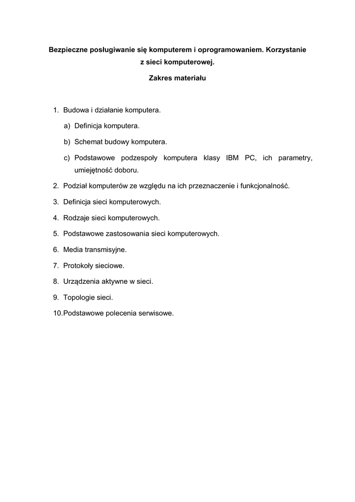 Bezpieczne posługiwanie się komputerem i oprogramowaniem. Korzystanie z sieci komputerowej. Zakres materiału 1. Budowa i działanie komputera. a) Definicja komputera. b) Schemat budowy komputera. c) Podstawowe podzespoły komputera klasy IBM PC, ich parametry, umiejętność doboru. 2. Podział komputerów ze względu na ich przeznaczenie i funkcjonalność. 3. Definicja sieci komputerowych. 4. Rodzaje sieci komputerowych. 5. Podstawowe zastosowania sieci komputerowych. 6. Media transmisyjne. 7. Protokoły sieciowe. 8. Urządzenia aktywne w sieci. 9. Topologie sieci. 10.Podstawowe polecenia serwisowe.