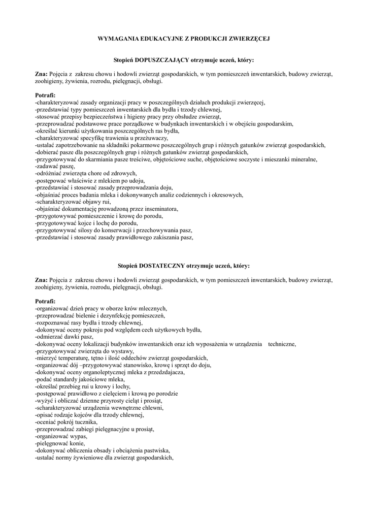 WYMAGANIA EDUKACYJNE Z PRODUKCJI ZWIERZĘCEJ Stopień DOPUSZCZAJĄCY otrzymuje uczeń, który: Zna: Pojęcia z zakresu chowu i hodowli zwierząt gospodarskich, w tym pomieszczeń inwentarskich, budowy zwierząt, zoohigieny, żywienia, rozrodu, pielęgnacji, obsługi. Potrafi: -charakteryzować zasady organizacji pracy w poszczególnych działach produkcji zwierzęcej, -przedstawiać typy pomieszczeń inwentarskich dla bydła i trzody chlewnej, -stosować przepisy bezpieczeństwa i higieny pracy przy obsłudze zwierząt, -przeprowadzać podstawowe prace porządkowe w budynkach inwentarskich i w obejściu gospodarskim, -określać kierunki użytkowania poszczególnych ras bydła, -charakteryzować specyfikę trawienia u przeżuwaczy, -ustalać zapotrzebowanie na składniki pokarmowe poszczególnych grup i różnych gatunków zwierząt gospodarskich, -dobierać pasze dla poszczególnych grup i różnych gatunków zwierząt gospodarskich, -przygotowywać do skarmiania pasze treściwe, objętościowe suche, objętościowe soczyste i mieszanki mineralne, -zadawać paszę, -odróżniać zwierzęta chore od zdrowych, -postępować właściwie z mlekiem po udoju, -przedstawiać i stosować zasady przeprowadzania doju, -objaśniać proces badania mleka i dokonywanych analiz codziennych i okresowych, -scharakteryzować objawy rui, -objaśniać dokumentację prowadzoną przez inseminatora, -przygotowywać pomieszczenie i krowę do porodu, -przygotowywać kojce i lochę do porodu, -przygotowywać silosy do konserwacji i przechowywania pasz, -przedstawiać i stosować zasady prawidłowego zakiszania pasz, Stopień DOSTATECZNY otrzymuje uczeń, który: Zna: Pojęcia z zakresu chowu i hodowli zwierząt gospodarskich, w tym pomieszczeń inwentarskich, budowy zwierząt, zoohigieny, żywienia, rozrodu, pielęgnacji, obsługi. Potrafi: -organizować dzień pracy w oborze krów mlecznych, -przeprowadzać bielenie i dezynfekcję pomieszczeń, -rozpoznawać rasy bydła i trzody chlewnej, -dokonywać oceny pokroju pod względem cech użytkowych bydła, -odmierzać dawki pasz, -dokonywać oceny lokalizacji budynków inwentarskich oraz ich wyposażenia w urządzenia -przygotowywać zwierzęta do wystawy, -mierzyć temperaturę, tętno i ilość oddechów zwierząt gospodarskich, -organizować dój –przygotowywać stanowisko, krowę i sprzęt do doju, -dokonywać oceny organoleptycznej mleka z przedzdajacza, -podać standardy jakościowe mleka, -określać przebieg rui u krowy i lochy, -postępować prawidłowo z cielęciem i krową po porodzie -wyżyć i obliczać dzienne przyrosty cieląt i prosiąt, -scharakteryzować urządzenia wewnętrzne chlewni, -opisać rodzaje kojców dla trzody chlewnej, -oceniać pokrój tucznika, -przeprowadzać zabiegi pielęgnacyjne u prosiąt, -organizować wypas, -pielęgnować konie, -dokonywać obliczenia obsady i obciążenia pastwiska, -ustalać normy żywieniowe dla zwierząt gospodarskich, techniczne, Stopień DOBRY otrzymuje uczeń, który: Zna: Pojęcia z zakresu chowu i hodowli zwierząt gospodarskich, w tym pomieszczeń inwentarskich, budowy zwierząt, zoohigieny, żywienia, rozrodu, pielęgnacji, obsługi. Potrafi: -obliczać ilość komponentów niezbędnych do sporządzania mieszanek pasz treściwych, - zabiegi pielęgnacyjne u zwierząt gospodarskich (czyszczenie i mycie zwierząt, przycinanie racic), -poskramiać zwierzęta gospodarskie, -udzielać pomocy przy porodzie, -ustalać kalendarz pokryć i wcieleń (wyproszeń), -oceniać wydajność pastwiska, -organizować stanówkę Stopień BARDZO DOBRY otrzymuje uczeń, który: Zna: Pojęcia z zakresu chowu i hodowli zwierząt gospodarskich, w tym pomieszczeń inwentarskich, budowy zwierząt, zoohigieny, żywienia, rozrodu, pielęgnacji, obsługi. Potrafi: -projektować ciągi technologiczne (usuwania odchodów, zadawania pasz, pojenia), -określać na żywych zwierzętach położenie ważniejszych kości, stawów i narządów wewnętrznych, -bilansować dawki pokarmowe dla bydła, trzody chlewnej, koni, drobiu i owiec, -sporządzać bilans pasz dla danego gospodarstwa, -charakteryzować technikę unasieniania bydła, -wykonać prawidłowo dój ręczny i mechaniczny, -opisywać charakterystyczne objawy chorób zwierząt gospodarskich, -udzielać pierwszej pomocy w nagłych wypadkach u zwierząt gospodarskich (zranienia, wzdęcie żwacza), -oceniać wartość pastwiska na podstawie składu botanicznego runi, Stopień CELUJĄCY otrzymuje uczeń, który: Zna: Pojęcia z zakresu chowu i hodowli zwierząt gospodarskich, w tym pomieszczeń inwentarskich, budowy zwierząt, zoohigieny, żywienia, rozrodu, pielęgnacji, obsługi. Potrafi: -projektować ciągi technologiczne (usuwania odchodów, zadawania pasz, pojenia), -określać na żywych zwierzętach położenie ważniejszych kości, stawów i narządów wewnętrznych, -bilansować dawki pokarmowe dla bydła, trzody chlewnej, koni, drobiu i owiec, -sporządzać bilans pasz dla danego gospodarstwa, -charakteryzować technikę unasieniania bydła, -wykonać prawidłowo dój ręczny i mechaniczny, -opisywać charakterystyczne objawy chorób zwierząt gospodarskich, -udzielać pierwszej pomocy w nagłych wypadkach u zwierząt gospodarskich (zranienia, wzdęcie żwacza), -oceniać wartość pastwiska na podstawie składu botanicznego runi, -posiada wiedzę i umiejętności wykraczające poza program nauczania, -osiąga sukcesy w olimpiadach, konkursach, -prace pisemne pisze na oceny celujące, -biegle posługuje się fachową terminologią, -umiejętnie stosuje wiedzę z innych przedmiotów, -precyzyjnie formułuje swoje wypowiedzi, -umiejętnie posługuje się zdobytymi wiadomościami w rozwiązywaniu zadań, -samodzielnie rozwija swoje własne zainteresowania, - wykazuje szczególną aktywność na zajęciach