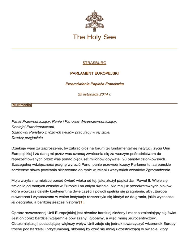The Holy See STRASBURG PARLAMENT EUROPEJSKI Przemówienie Papieża Franciszka 25 listopada 2014 r. [Multimedia] Panie Przewodniczący, Panie i Panowie Wiceprzewodniczący, Dostojni Eurodeputowani, Szanowni Państwo z różnych tytułów pracujący w tej Izbie, Drodzy przyjaciele, Dziękuję wam za zaproszenie, by zabrać głos na forum tej fundamentalnej instytucji życia Unii Europejskiej i za daną mi przez was szansę zwrócenia się za waszym pośrednictwem do reprezentowanych przez was ponad pięciuset milionów obywateli 28 państw członkowskich. Szczególną wdzięczność pragnę wyrazić Panu, panie przewodniczący Parlamentu, za pańskie serdeczne słowa powitania skierowane do mnie w imieniu wszystkich członków Zgromadzenia. Moja wizyta ma miejsce ponad ćwierć wieku od tej, jaką złożył papież Jan Paweł II. Wiele się zmieniło od tamtych czasów w Europie i na całym świecie. Nie ma już przeciwstawnych bloków, które wówczas dzieliły kontynent na dwie części i powoli spełnia się pragnienie, aby „Europa suwerenna i wyposażona w wolne instytucje rozszerzyła się kiedyś aż do granic, jakie wyznacza jej geografia, a bardziej jeszcze historia”[1]. Oprócz rozszerzonej Unii Europejskiej jest również bardziej złożony i mocno zmieniający się świat. Jest on coraz bardziej wzajemnie powiązany i globalny, a więc mniej „eurocentryczny”. Obszerniejszej i posiadającej większy wpływ Unii zdaje się jednak towarzyszyć wizerunek Europy trochę podstarzałej i przytłumionej, skłonnej by czuć się mniej uczestniczącą w świecie, który patrzy na nią z dystansem, nieufnością, a niekiedy z podejrzliwością. Zwracając się dziś do was i wychodząc od mojego powołania jako pasterza, chciałbym skierować do wszystkich obywateli Europy orędzie nadziei i zachęty. Orędzie nadziei, którego podstawą jest ufność, że trudności mogą stać się silnymi katalizatorami jedności, by przezwyciężyć wszelkie obawy, jakie Europa przeżywa razem z całym światem. Nadzieję w Panu, który przekształca zło w dobro, a śmierć w życie. Zachęty, by powrócić do stanowczego przekonania ojców założycieli Unii Europejskiej, którzy pragnęli przyszłości opierającej się na zdolności do wspólnego działania na rzecz przezwyciężenia podziałów i krzewienia pokoju i jedności wśród wszystkich narodów kontynentu. W centrum tego ambitnego projektu politycznego było zaufanie do człowieka, nie tyle jako obywatela ani też podmiotu ekonomicznego, ale do człowieka jako osoby obdarzonej godnością transcendentną. Bardzo zależy mi na podkreśleniu ścisłego związku między tymi dwoma słowami: „godność” i „transcendentna”. „Godność” to słowo-klucz, które charakteryzowało odbudowę po II wojnie światowej. Nasza historia najnowsza wyróżnia się z powodu niewątpliwie centralnego miejsca krzewienia ludzkiej godności wobec różnego rodzaju przemocy i dyskryminacji, których na przestrzeni wieków nie brakowało również w Europie. Dostrzeganie znaczenia praw człowieka rodzi się właśnie jako wynik długiej drogi, na którą składały się również liczne cierpienia i ofiary. Przyczyniła się ona do uświadomienia sobie wartości, wyjątkowości i niepowtarzalności każdej poszczególnej osoby ludzkiej. Ta świadomość kulturowa znajduje swój fundament nie tylko w wydarzeniach historii, ale przede wszystkim w myśli europejskiej, wyróżniającej się bogactwem spotkania, którego liczne źródła pochodzą „z Grecji i Rzymu, ze źródeł celtyckich, germańskich i słowiańskich oraz z chrześcijaństwa, które ją dogłębnie ukształtowało”[2], dając właśnie miejsce pojęciu „osoby”. Dzisiaj promowanie praw człowieka odgrywa kluczową rolę w ramach zaangażowania Unii Europejskiej na rzecz wspierania godności osoby, zarówno w jej wnętrzu, jak i w relacjach z innymi państwami. Jest to zaangażowanie ważne i godne podziwu, bo wciąż istnieje nazbyt wiele sytuacji, w których istoty ludzkie są traktowane jak przedmioty, których koncepcję, strukturę i przydatność można zaprogramować, a które następnie można wyrzucić, gdy nie są już potrzebne, gdyż stają się słabe, chore lub stare. Jaka bowiem godność istnieje rzeczywiście, kiedy nie ma możliwości swobodnego wyrażania swej myśli czy wyznawania bez ucisku swej wiary religijnej? Jaka godność jest możliwa bez jasnych ram prawnych, ograniczających panowanie siły i sprawiających wyższość prawa nad tyranią władzy? Jaką godność może w ogóle posiadać mężczyzna lub kobieta, którzy stali się przedmiotem jakiejkolwiek dyskryminacji? Jaką godność może mieć kiedykolwiek osoba, która nie ma pożywienia czy minimum niezbędnego do życia, czy – co gorsza – nie ma pracy, która namaszcza ją godnością? Krzewienie godności osoby oznacza uznanie, że posiada ona niezbywalne prawa, których nie może być pozbawiona arbitralnie przez nikogo, a tym mniej, na rzecz interesów ekonomicznych. Trzeba jednak zwracać uwagę, aby nie popaść w pewne dwuznaczności, które mogą wynikać z niezrozumienia idei praw człowieka i ich paradoksalnego nadużywania. Istnieje dziś bowiem skłonność, by rościć sobie coraz więcej praw indywidualnych – kusi mnie, by powiedzieć indywidualistycznych – która skrywa koncepcję osoby ludzkiej oderwanej od wszelkiego kontekstu społecznego i antropologicznego, niemal jako „monady” (μονάς), coraz bardziej nieczułej na inne otaczające ją „monady”. Koncepcji prawa zdaje się już nie towarzyszyć równie istotna i dopełniająca koncepcja obowiązku, tak że w końcu dochodzi do potwierdzenia praw jednostki, nie uwzględniając, że każda istota ludzka jest związana z pewnym kontekstem społecznym, w którym jej prawa i obowiązki są połączone z prawami i obowiązkami innych i z dobrem wspólnym społeczeństwa. Dlatego też uważam, że ważnie