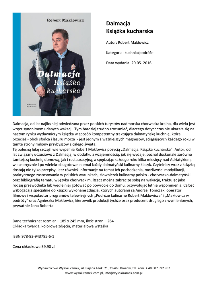 Dalmacja Książka kucharska Autor: Robert Makłowicz Kategoria: kuchnia/podróże Data wydania: 20.05. 2016 Dalmacja, od lat najliczniej odwiedzana przez polskich turystów nadmorska chorwacka kraina, dla wielu jest wręcz synonimem udanych wakacji. Tym bardziej trudno zrozumieć, dlaczego dotychczas nie ukazała się na naszym rynku wydawniczym książka w sposób kompetentny traktująca dalmatyńską kuchnię, która przecież - obok słońca i lazuru morza - jest jednym z ważniejszych magnesów, ściągających każdego roku w tamte strony miliony przybyszów z całego świata. Tę bolesną lukę szczęśliwie wypełnia Robert Makłowicz pozycją „Dalmacja. Książka kucharska”. Autor, od lat związany uczuciowo z Dalmacją, w dodatku z wzajemnością, jak się wydaje, poznał doskonale zarówno tamtejszą kuchnię domową, jak i restauracyjną, a spędzając każdego roku kilka miesięcy nad Adriatykiem, własnoręcznie i po wielekroć ugotował niemal każdy dalmatyński kulinarny klasyk. Czytelnicy wraz z książką dostają nie tylko przepisy, lecz również informacje na temat ich pochodzenia, możliwości modyfikacji, praktycznego zastosowania w polskich warunkach, słowniczek kulinarny polsko - chorwacko-dalmatyński oraz bibliografię tematu w języku chorwackim. Rzecz można zabrać ze sobą na wakacje, traktując jako rodzaj przewodnika lub wedle niej gotować po powrocie do domu, przywołując letnie wspomnienia. Całość wzbogacają specjalnie do książki wykonane zdjęcia, których autorami są Andrzej Tomczak, operator filmowy i współautor programów telewizyjnych „Podróże kulinarne Robert Makłowicza” i „Makłowicz w podróży” oraz Agnieszka Makłowicz, kierownik produkcji tychże oraz producent drugiego z wymienionych, prywatnie żona Roberta. Dane techniczne: rozmiar – 185 x 245 mm, ilość stron – 264 Okładka twarda, kolorowe zdjęcia, materiałowa wstążka ISBN 978-83-943785-6-1 Cena okładkowa 59,90 zł Wydawnictwo Wysoki Zamek, ul. Bajana 4 lok. 21, 31-465 Kraków, tel. kom. + 48 607 592 907 www.wysokizamek.com.pl, [email protected]