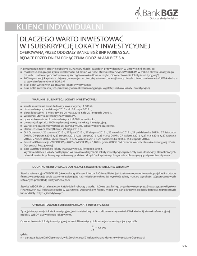 KLIENCI INDYWIDUALNI DLACZEGO WARTO INWESTOWAĆ W I SUBSKRYPCJĘ LOKATY INWESTYCYJNEJ OFEROWANĄ PRZEZ ODDZIAŁY BANKU BGŻ BNP PARIBAS S.A. BĘDĄCE PRZED DNIEM POŁĄCZENIA ODDZIAŁAMI BGŻ S.A. Najważniejsze zalety obecnej subskrypcji, na warunkach i zasadach przewidzianych w umowie z Klientem, to: możliwość osiągnięcia zysku w zależności od zmian wartości stawki referencyjnej WIBOR 3M w trakcie okresu lokacyjnego (zasady ustalenia oprocentowania są szczegółowo określone w części „Oprocentowanie lokaty inwestycyjnej”) 100% gwarancji kapitału – dajemy gwarancję zwrotu całej zainwestowanej kwoty niezależnie od zmian wartości Wskaźnika – tj. stawki referencyjnej WIBOR 3M brak opłat wstępnych za otwarcie lokaty inwestycyjnej brak opłat za wcześniejszą, przed upływem okresu lokacyjnego, wypłatę środków lokaty inwestycyjnej WARUNKI I SUBSKRYBCJI LOKATY INWESTYCYJNEJ kwota minimalna i waluta lokaty inwestycyjnej: 4 000 zł, okres subskrypcji: od 4 maja 2015 r. do 28 maja 2015 r., okres lokacyjny: 18 miesięcy: od 29 maja 2015 r. do 29 listopada 2016 r., Wskaźnik: Stawka referencyjna WIBOR 3M, oprocentowanie w okresie subskrypcji: 0,00% w skali roku, gwarancja kapitału: 100% wpłaconej kwoty na lokatę inwestycyjną, Wartość Początkowa: Wartość Wskaźnika w Dniu Obserwacji Początkowej, Dzień Obserwacji Początkowej: 29 maja 2015 r., Dni Obserwacji: 26 czerwca 2015 r., 27 lipca 2015 r., 27 sierpnia 2015 r., 25 września 2015 r., 27 października 2015 r., 27 listopada 2015 r., 24 grudnia 2015 r., 27 stycznia 2016 r., 26 lutego 2016 r., 25 marca 2016 r., 27 kwietnia 2016 r., 27 maja 2016 r., 27 czerwca 2016 r., 27 lipca 2016 r., 26 sierpnia 2016 r., 27 września 2016 r., 27 października 2016 r., 25 listopada 2016 r., Przedział Obserwacji: <WIBOR 3Mi – 0,05%; WIBOR 3Mi + 0,10%>, gdzie WIBOR 3Mi oznacza wartość stawki referencyjnej z Dnia Obserwacji Początkowej, data wypłaty odsetek od lokaty inwestycyjnej: 29 listopada 2016 r. Wypłata odsetek z lokaty nastąpi pod warunkiem utrzymania lokaty inwestycyjnej przez cały okres lokacyjny. Od naliczonych odsetek zostanie pobrany zryczałtowany podatek od zysków kapitałowych zgodnie z obowiązującymi przepisami prawa. DODATKOWE INFORMACJE DOTYCZĄCE STAWKI REFERENCYJNEJ WIBOR 3M Stawka referencyjna WIBOR 3M (skrót od ang. Warsaw Interbank Offered Rate) jest to stawka oprocentowania, po jakiej instytucje finansowe pożyczają sobie wzajemnie pieniądze na 3-miesięczny okres. Jej wysokość zależy m.in. od wysokości stóp procentowych ustalanych przez Radę Polityki Pieniężnej. Stawka WIBOR 3M ustalana jest w każdy dzień roboczy o godz. 11.00 na tzw. fixingu organizowanym przez Stowarzyszenie Rynków Finansowych ACI Polska z siedzibą w Warszawie. Uczestnikiem fixingu mogą być banki krajowe, oddziały banków zagranicznych lub oddziały instytucji kredytowych. OPROCENTOWANIE I SUBSKRYPCJI LOKATY INWESTYCYJNEJ Zysk, jaki wypracuje lokata inwestycyjna, jest uzależniony od kształtowania się wartości Wskaźnika tj. stawki referencyjnej indeksu WIBOR 3M w okresie lokacyjnym. Oprocentowanie lokaty inwestycyjnej w skali 18 miesięcy obliczane jest w następujący sposób: n — * 4,50% 18 gdzie: n – oznacza liczbę Dni Obserwacji, w których wartość Wskaźnika znajduje się w Przedziale Obserwacji 01. KLIENCI INDYWIDUALNI DLACZEGO WARTO INWESTOWAĆ W I SUBSKRYPCJĘ LOKATY INWESTYCYJNEJ OFEROWANĄ PRZEZ ODDZIAŁY BANKU BGŻ BNP PARIBAS S.A. BĘDĄCE PRZED DNIEM POŁĄCZENIA ODDZIAŁAMI BGŻ S.A. przy czym: jeżeli w którymkolwiek z Dni Obserwacji oficjalna wartość Wskaźnika nie jest ustalona, do obliczenia oprocentowania przyjmuje się wartość Wskaźnika z pierwszego dnia roboczego następującego po tym Dniu Obserwacji, w którym oficjalna wartość Wskaźnika została ustalona, jeżeli w Dniu Obserwacji Początkowej oficjalna wartość Wskaźnika nie jest ustalona, do obliczenia oprocentowania przyjmuje się wartość Wskaźnika z pierwszego dnia roboczego następującego po Dniu Obserwacji Początkowej, w którym oficjalna wartość Wskaźnika została ustalona, w przypadku zaprzestania obliczania stawki referencyjnej stanowiącej Wskaźnik, zostanie ona zastąpiona przez stawkę referencyjną wyznaczoną w jej miejsce, a w przypadku braku takiego wyznaczenia – inną odpowiednią stawkę. Wypłata odsetek z lokaty nastąpi w dniu 29 listopada 2016 r. pod warunkiem utrzymania lokaty inwestycyjnej przez cały okres lokacyjny. Informacje o charakterze poglądowym, o wartości Wskaźnika publikowane są m.in. na http://www.acipolska.pl/wibor/indeks-wibidwibor.html. Ponadto informacje o wartości Wskaźnika w poszczególnych Dniach Obserwacji podlegają publikacji na stronie www.bgz.pl oraz dostępne są w oddziałach Banku BGŻ BNP Paribas S.A. będących przed dniem połączenia oddziałami BGŻ S.A. RYZYKA ZWIĄZANE Z LOKATĄ INWESTYCYJNĄ Inwestycja w I subskrypcję lokaty inwestycyjnej wiąże się z następującymi ryzykami: oprocentowanie I subskrypcji lokaty inwestycyjnej może być niższe od oprocentowania standardowych lokat terminowych, a w szczególności może wynieść 0% w skali roku, w przypadku wypłaty przez Klienta środków lokaty przed upływem okresu lokacyjnego, odsetki nie przysługują, a Klient otrzymuje zwrot zainwestowanego kapitału. SCENARIUSZE Z SYMULACJĄ WYSOKOŚCI OPROCENTOWANIA LOKATY INWESTYCYJNEJ Scenariusz nr 1 Jeśli stawka referencyjna WIBOR 3M byłaby we wszystkich 18 Dniach Obserwacji nie wyższa niż wartość stawki referencyjnej WIBOR3Mi w dniu 29 maja 2015 r. powiększona o 10 punktów bazowych oraz nie niższa niż wartość stawki referencyjnej WIBOR3Mi w dniu 29 maja 2015 r. pomniejszona o 5 punktów bazowych, to oprocentowanie lokaty inwestycyjnej wyniosłoby 4,50% w skali 18 miesięcy, tj. 3,00% w skali roku. 18 — * 4,50% = 0,0450 tj. 4,50% 18 Scenariusz nr 2 Jeśli stawka referencyjna WIBOR 3M byłaby w 10 spośród 18 Dni Obs