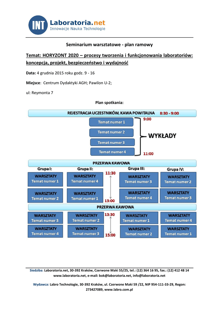 Seminarium warsztatowe - plan ramowy Temat: HORYZONT 2020 – procesy tworzenia i funkcjonowania laboratoriów: koncepcja, projekt, bezpieczeństwo i wydajność Data: 4 grudnia 2015 roku godz. 9 - 16 Miejsce: Centrum Dydaktyki AGH; Pawilon U-2; ul: Reymonta 7 Plan spotkania: Siedziba: Laboratoria.net, 30-392 Kraków, Czerwone Maki 55/25, tel.: (12) 364 16 95, fax.: (12) 412 48 14 www.laboratoria.net, e-mail: [email protected], [email protected] Wydawca: Labro Technologie, 30-392 Kraków, ul. Czerwone Maki 59 /22, NIP 954-111-33-29, Regon: 273427089, www.labro.com.pl PRELEGENCI: Dr inż. Tadeusz Komorowicz - jest starszym wykładowcą na Wydziale Inżynierii i Technologii Chemicznej Politechniki Krakowskiej. Ukończył studia podyplomowe z zakresu zarządzania bezpieczeństwem i higieną pracy. Jest audytorem wewnętrznym systemu zarządzania BHP. Posiada certyfikat asystenta systemu zarządzania BHP wydany przez Polskie Centrum Badań i Certyfikacji w Warszawie. Jest współautorem podręczników „Zarządzanie bezpieczeństwem i higieną pracy”, „Gospodarowanie odpadami i substancjami niebezpiecznymi” oraz „Zarządzanie chemikaliami w przedsiębiorstwie – Rozporządzenie REACH” wydanych przez Centrum Szkolenia i Organizacji Systemów Jakości Politechniki Krakowskiej. Mgr inż. Michał Cisowski - Manager ds. Systemów VAV. Absolwent Politechniki Krakowskiej Wydziału Mechanicznego. W Firmie SMAY prace rozpoczął w 2011r. na stanowisku Automatyka. Od ponad dwóch lat zajmuje się wdrażaniem i rozwojem szeroko pojętych systemów VAV między innymi systemów do wentylacji Laboratoriów system SmayLab. Aktualnie zajmuje się pracami rozwojowymi systemu SmayLab oraz nowymi rozwiązaniami systemowi do układów wentylacji bytowej. Współautor przewodnika „Regulacja przepływu powietrza w laboratoriach”, prelegent konferencji Future4Build w 2013 roku. Mgr inż. arch. Sławomir Florkiewicz – architekt z bardzo dużym doświadczeniem w projektowaniu obiektów badawczo – rozwojowych. Absolwent Politechniki Krakowskiej Wydziału Architektury. Prezes Zarządu Spółki Tektonika Architekci. Współuczestniczył w projektowaniu takich inwestycji jak: Projekt budowlano- wykonawczy modernizacji pracowni w budynku laboratoryjnym Centrum Badań Jakości sp. z o.o. w Polkowicach czy opracowanie szczegółowej specyfikacji istotnych warunków zamówienia Siedziba: Laboratoria.net, 30-392 Kraków, Czerwone Maki 55/25, tel.: (12) 364 16 95, fax.: (12) 412 48 14 www.laboratoria.net, e-mail: [email protected], [email protected] Wydawca: Labro Technologie, 30-392 Kraków, ul. Czerwone Maki 59 /22, NIP 954-111-33-29, Regon: 273427089, www.labro.com.pl zabudowy laboratoryjnej będącej częścią projektu technologii „LAB” wraz z analizą i konsultacjami w zakresie funkcjonalności, trwałości i jakości wyposażenia dla inwestycji „Zaprojektowanie i wybudowanie zespołu obiektów laboratorium centralnego wraz z zagospodarowaniem terenów stanowiące część projektu „Płocki Park Przemysłowo Technologiczny I”. Obecnie pracuje nad takim projektem dotyczącym wielobranżowy koncepcyjny oraz budowlany i wykonawczy Uniwersyteckiego Centrum Medycyny Weterynaryjnej i Hodowli Zwierząt Polski Południowej. mgr inż. Andrzej Komisarz – projektant, właściciel Pracowni Projektowej Andrzej Komisarz. Posiada ponad 25 letniej doświadczenie w projektowaniu instalacji gazów medycznych, laboratoryjnych i technicznych. Jest autorem wielu zrealizowanych projektów instalacji gazów laboratoryjnych i technicznych, w takich obiektach jak: Laboratorium Geochemii Środowiska i Terenów Przeznaczonych do Rekultywacji, Wydziału Leśnego Uniwersytetu Rolniczego w Krakowie, Akademickie Centrum Materiałów i Nanotechnologii AGH w Krakowie, Pawilon Dydaktyczny Wydziału Inżynierii Materiałowej i Ceramiki AGH w Krakowie, Budynek laboratoryjno administracyjny Instytutu Technicznego Wojsk Lotniczych w Warszawie, Laboratorium Zakładów Azotowych Kędzierzyn S. A. w Kędzierzynie – Koźlu, Dolnośląskie Centrum Materiałów i Biomateriałów Wrocławskiego Centrum Badań EIT+ we Wrocławiu, Pracownia Toksykologii Analitycznej i Terapii Monitorowanej Szpitala Uniwersyteckiego w Krakowie, Laboratoriach Euroinplant w Kajetanach, Wydziału Fizyki, Astronomii i Informatyki Stosowanej UJ przy ul. Gronostajowej w Krakowie, Centrum Energetyki AGH przy ul. Czarnowiejskiej w Krakowie, Projekt instalacji gazów technicznych w pomieszczeniach budynku CD Oddziału Instytutu Nafty i Gazu w Krakowie, Centrum Biotechnologii – Ośrodek Rozwoju Specjalistycznych Usług dla Firm Sektora Biotechnologicznego w Złotnikach, Siedziba: Laboratoria.net, 30-392 Kraków, Czerwone Maki 55/25, tel.: (12) 364 16 95, fax.: (12) 412 48 14 www.laboratoria.net, e-mail: [email protected], [email protected] Wydawca: Labro Technologie, 30-392 Kraków, ul. Czerwone Maki 59 /22, NIP 954-111-33-29, Regon: 273427089, www.labro.com.pl Ośrodek Badawczo-Rozwojowym firmy „OLIMP- LABORATORIES” w Pustyni. W roku 2006 Pracownia Projektowa Andrzej Komisarz uzyskała certyfikat ISO 9001 w zakresie projektowania i rozwoju instalacji rurociągowych gazów medycznych i próżni, instalacji gazów laboratoryjnych oraz instalacji sanitarnych, a także certyfikat EN ISO 13485 w zakresie projektowania i rozwoju instalacji rurociągowych gazów medycznych i próżni. Siedziba: Laboratoria.net, 30-392 Kraków, Czerwone Maki 55/25, tel.: (12) 364 16 95, fax.: (12) 412 48 14 www.laboratoria.net, e-mail: [email protected], [email protected] Wydawca: Labro Technologie, 30-392 Kraków, ul. Czerwone Maki 59 /22, NIP 954-111-33-29, Regon: 273427089, www.labro.com.pl