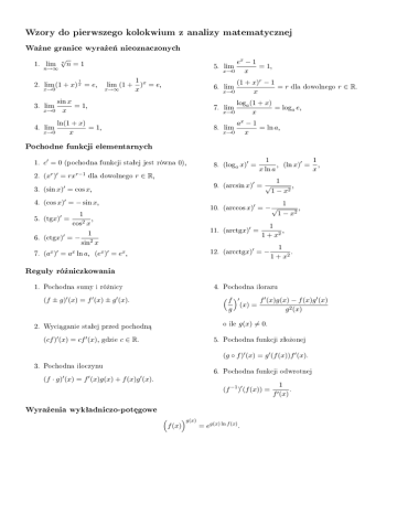 Wzory do pierwszego kolokwium z analizy matematycznej Wa»ne granice wyra»e« nieoznaczonych 1. 2. 3. 4. lim √ n n→∞ n=1 1 lim (1 + x) x = e, lim (1 + x→∞ x→0 1 x ) = e, x 5. ex − 1 = 1, x→0 x 6. (1 + x)r − 1 =r x→0 x lim lim dla dowolnego sin x = 1, x 7. ln(1 + x) = 1, x→0 x 8. ax − 1 = ln a, x→0 x 8. (loga x)0 = 9. 1 (arcsin x)0 = √ , 1 − x2 lim x→0 lim lim x→0 loga (1 + x) = loga e, x lim Pochodne funkcji elementarnych 1. c0 = 0 2. (xr )0 = rxr−1 (pochodna funkcji staªej jest równa 0), 3. (sin x)0 dla dowolnego = cos x, 4. (cos x)0 = − sin x, 5. (tgx)0 = 6. 7. r ∈ R, 1 , cos2 x 1 (ctgx)0 = − 2 sin x (ax )0 = ax ln a, (ex )0 = ex , 1 1 0 , (ln x) = , x ln a x 10. 1 , (arccos x)0 = − √ 1 − x2 11. (arctgx)0 = 12. (arcctgx)0 = − 1 , 1 + x2 1 . 1 + x2 Reguªy ró»niczkowania 1. Pochodna sumy i ró»nicy 4. Pochodna ilorazu (f ± g)0 (x) = f 0 (x) ± g 0 (x). f 0 g o ile 2. Wyci¡ganie staªej przed pochodn¡ (cf )0 (x) = cf 0 (x), gdzie c ∈ R. (x) = f 0 (x)g(x) − f (x)g 0 (x) g 2 (x) g(x) 6= 0. 5. Pochodna funkcji zªo»onej (g ◦ f )0 (x) = g 0 (f (x))f 0 (x). 3. Pochodna iloczynu (f · g)0 (x) = f 0 (x)g(x) 6. Pochodna funkcji odwrotnej + f (x)g 0 (x). (f −1 )0 (f (x)) = Wyra»enia wykªadniczo-pot¦gowe g(x) f (x) = eg(x) ln f (x) . 1 f 0 (x) . r ∈ R.