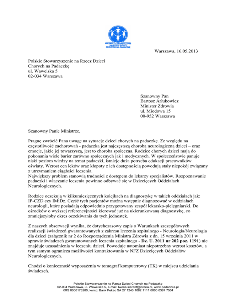 Warszawa, 16.05.2013 Polskie Stowarzyszenie na Rzecz Dzieci Chorych na Padaczkę ul. Wawelska 5 02-034 Warszawa Szanowny Pan Bartosz Arłukowicz Minister Zdrowia ul. Miodowa 15 00-952 Warszawa Szanowny Panie Ministrze, Pragnę zwrócić Pana uwagę na sytuację dzieci chorych na padaczkę. Ze względu na częstotliwość zachorowań - padaczka jest najczęstszą chorobą neurologiczną dzieci – oraz emocje, jakie jej towarzyszą, jest to choroba społeczna. Rodzice chorych dzieci mają do pokonania wiele barier zarówno społecznych jak i medycznych. W społeczeństwie panuje niski poziom wiedzy na temat padaczki, istnieje duża potrzeba edukacji pracowników oświaty. Wzrost cen leków oraz kłopoty z ich dostępnością powodują stały niepokój związany z utrzymaniem ciągłości leczenia. Największy problem stanowią trudności z dostępem do lekarzy specjalistów. Rozpoznawanie padaczki i włączanie leczenia powinno odbywać się w Dziecięcych Oddziałach Neurologicznych. Rodzice oczekują w kilkumiesięcznych kolejkach na diagnostykę w takich oddziałach jak: IP-CZD czy IMiDz. Część tych pacjentów można wstępnie diagnozować w oddziałach neurologii, które posiadają odpowiednio przygotowany zespół lekarsko-pielęgniarski. Do ośrodków o wyższej referencyjności kierować już na ukierunkowaną diagnostykę, co zmniejszyłoby okres oczekiwania do tych jednostek. Z naszych obserwacji wynika, że dotychczasowy zapis o Warunkach szczegółowych realizacji świadczeń gwarantowanych z zakresu leczenia szpitalnego - Neurologia/Neurologia dla dzieci (załącznik nr 2 do Rozporządzenia Ministra Zdrowia z dn. 15 września 2011 w sprawie świadczeń gwarantowanych leczenia szpitalnego - Dz. U. 2011 nr 202 poz. 1191) nie znajduje uzasadnienia w leczeniu dzieci. Powoduje natomiast niepotrzebny wzrost kosztów, a tym samym ogranicza możliwości kontraktowania w NFZ Dziecięcych Oddziałów Neurologicznych. Chodzi o konieczność wyposażenia w tomograf komputerowy (TK) w miejscu udzielania świadczeń. Polskie Stowarzyszenie na Rzecz Dzieci Chorych na Padaczkę 02-034 Warszawa, ul. Wawelska 5, e-mail: [email protected], www.padaczka.pl KRS 0000173200, konto: Bank Pekao SA 27 1240 1082 1111 0000 0387 7504 Wyżej wymienione wyposażenie jest wskazane na Oddziałach Neurologicznych dla osób dorosłych ze względy na częstość występowania udarów. W przypadku dzieci udary są zjawiskiem występującym z niewielką, w porównaniu z dorosłymi częstością. Statystyki szpitalne pokazują, że utrzymanie i obsługa TK generują koszty niewspółmierne do częstotliwości wykonywanych badań. Dane za rok 2012 w jednym ze szpitali dziecięcych: Liczba badań wykonanych przy pomocy TK – 31 Liczba badań wykonanych przy pomocy RM – 114 Dla problemów neurologicznych populacji pediatrycznej większe znaczenie ma badanie rezonansem magnetycznym, które jest dokładniejsze i mniej szkodliwe. Oddział Neurologii Dziecięcej powinien mieć możliwość dostępu do tomografii komputerowej. Dlatego też zmiana ustawowego zapisu: TK w lokalizacji na: dostęp do TK jest zgodna ze wskazaniami medycznymi. Jednocześnie w znaczący sposób poprawiłaby kondycję finansową Dziecięcych Oddziałów Neurologicznych. W tej chwili brak sprzętu oznacza brak kontraktu z NFZ. W rezultacie dzieci, które powinny znaleźć się na Oddziale Neurologicznym są umieszczane na Oddziałach Pediatrycznych, co jest bardzo niekorzystne ze względów epidemiologicznych i generuje następne koszty spowodowane dodatkowymi zakażeniami i wydłużeniem czasu pobytu w szpitalu. Ze względu na dobro chorych dzieci i skrócenie kolejek w oczekiwaniu na specjalistyczne leczenie, proszę o pozytywne rozpatrzenia naszej propozycji. Iwona Sierant Prezes Zarządu Polskie Stowarzyszenie na Rzecz Dzieci Chorych na Padaczkę 02-034 Warszawa, ul. Wawelska 5, e-mail: [email protected], www.padaczka.pl KRS 0000173200, konto: Bank Pekao SA 27 1240 1082 1111 0000 0387 7504