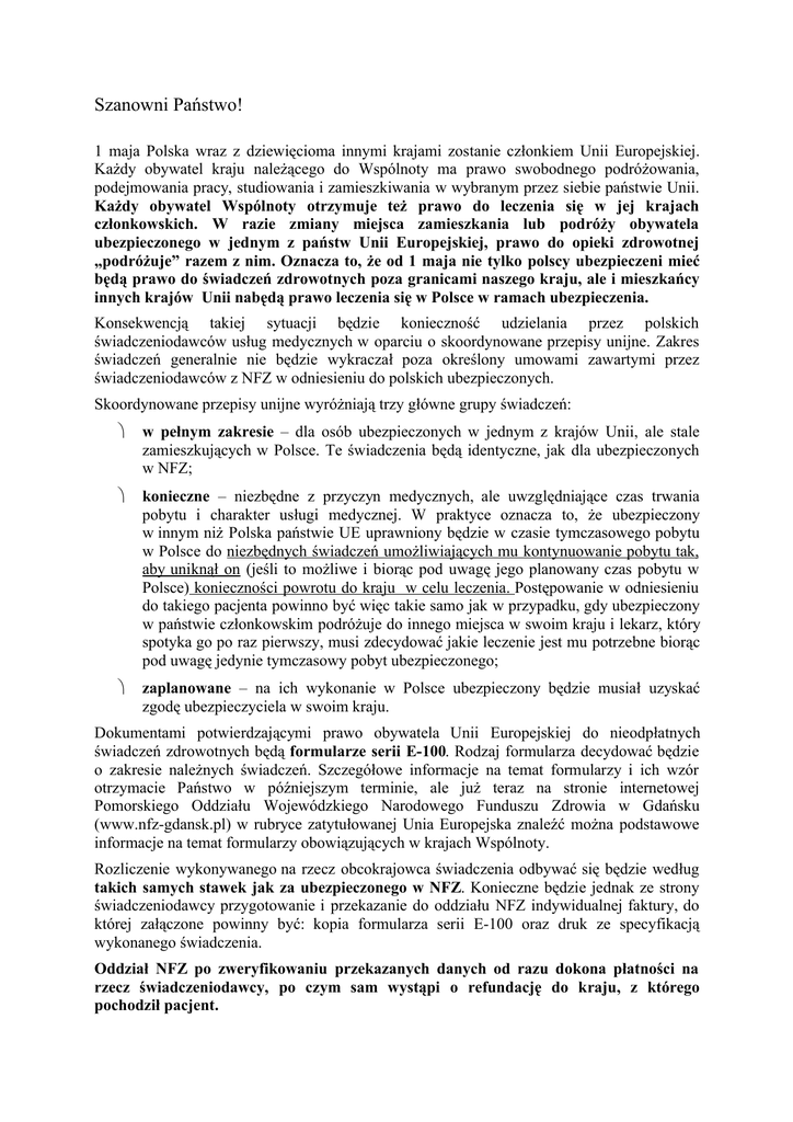 Szanowni Państwo! 1 maja Polska wraz z dziewięcioma innymi krajami zostanie członkiem Unii Europejskiej. Każdy obywatel kraju należącego do Wspólnoty ma prawo swobodnego podróżowania, podejmowania pracy, studiowania i zamieszkiwania w wybranym przez siebie państwie Unii. Każdy obywatel Wspólnoty otrzymuje też prawo do leczenia się w jej krajach członkowskich. W razie zmiany miejsca zamieszkania lub podróży obywatela ubezpieczonego w jednym z państw Unii Europejskiej, prawo do opieki zdrowotnej „podróżuje” razem z nim. Oznacza to, że od 1 maja nie tylko polscy ubezpieczeni mieć będą prawo do świadczeń zdrowotnych poza granicami naszego kraju, ale i mieszkańcy innych krajów Unii nabędą prawo leczenia się w Polsce w ramach ubezpieczenia. Konsekwencją takiej sytuacji będzie konieczność udzielania przez polskich świadczeniodawców usług medycznych w oparciu o skoordynowane przepisy unijne. Zakres świadczeń generalnie nie będzie wykraczał poza określony umowami zawartymi przez świadczeniodawców z NFZ w odniesieniu do polskich ubezpieczonych. Skoordynowane przepisy unijne wyróżniają trzy główne grupy świadczeń: w pełnym zakresie – dla osób ubezpieczonych w jednym z krajów Unii, ale stale zamieszkujących w Polsce. Te świadczenia będą identyczne, jak dla ubezpieczonych w NFZ; konieczne – niezbędne z przyczyn medycznych, ale uwzględniające czas trwania pobytu i charakter usługi medycznej. W praktyce oznacza to, że ubezpieczony w innym niż Polska państwie UE uprawniony będzie w czasie tymczasowego pobytu w Polsce do niezbędnych świadczeń umożliwiających mu kontynuowanie pobytu tak, aby uniknął on (jeśli to możliwe i biorąc pod uwagę jego planowany czas pobytu w Polsce) konieczności powrotu do kraju w celu leczenia. Postępowanie w odniesieniu do takiego pacjenta powinno być więc takie samo jak w przypadku, gdy ubezpieczony w państwie członkowskim podróżuje do innego miejsca w swoim kraju i lekarz, który spotyka go po raz pierwszy, musi zdecydować jakie leczenie jest mu potrzebne biorąc pod uwagę jedynie tymczasowy pobyt ubezpieczonego; zaplanowane – na ich wykonanie w Polsce ubezpieczony będzie musiał uzyskać zgodę ubezpieczyciela w swoim kraju. Dokumentami potwierdzającymi prawo obywatela Unii Europejskiej do nieodpłatnych świadczeń zdrowotnych będą formularze serii E-100. Rodzaj formularza decydować będzie o zakresie należnych świadczeń. Szczegółowe informacje na temat formularzy i ich wzór otrzymacie Państwo w późniejszym terminie, ale już teraz na stronie internetowej Pomorskiego Oddziału Wojewódzkiego Narodowego Funduszu Zdrowia w Gdańsku (www.nfz-gdansk.pl) w rubryce zatytułowanej Unia Europejska znaleźć można podstawowe informacje na temat formularzy obowiązujących w krajach Wspólnoty. Rozliczenie wykonywanego na rzecz obcokrajowca świadczenia odbywać się będzie według takich samych stawek jak za ubezpieczonego w NFZ. Konieczne będzie jednak ze strony świadczeniodawcy przygotowanie i przekazanie do oddziału NFZ indywidualnej faktury, do której załączone powinny być: kopia formularza serii E-100 oraz druk ze specyfikacją wykonanego świadczenia. Oddział NFZ po zweryfikowaniu przekazanych danych od razu dokona płatności na rzecz świadczeniodawcy, po czym sam wystąpi o refundację do kraju, z którego pochodził pacjent. Uwaga!!! Wspólne przepisy dotyczące opieki zdrowotnej obowiązywać będą w Polsce od 1 maja w odniesieniu do obywateli: Austrii, Belgii, Danii, Finlandii, Francji, Grecji, Hiszpanii, Holandii, Irlandii, Luksemburga, Niemiec, Portugalii, Szwecji, Wielkiej Brytanii, Włoch oraz mieszkańców państw wchodzących w skład Europejskiego Obszaru Gospodarczego: Islandii, Lichtensteinu, Norwegii i Szwajcarii. Od 1 maja 2004 roku, poza Polską, przepisami wspólnotowymi objęte będą również: Cypr, Czechy, Estonia, Litwa, Łotwa, Malta, Słowacja, Słowenia i Węgry.
