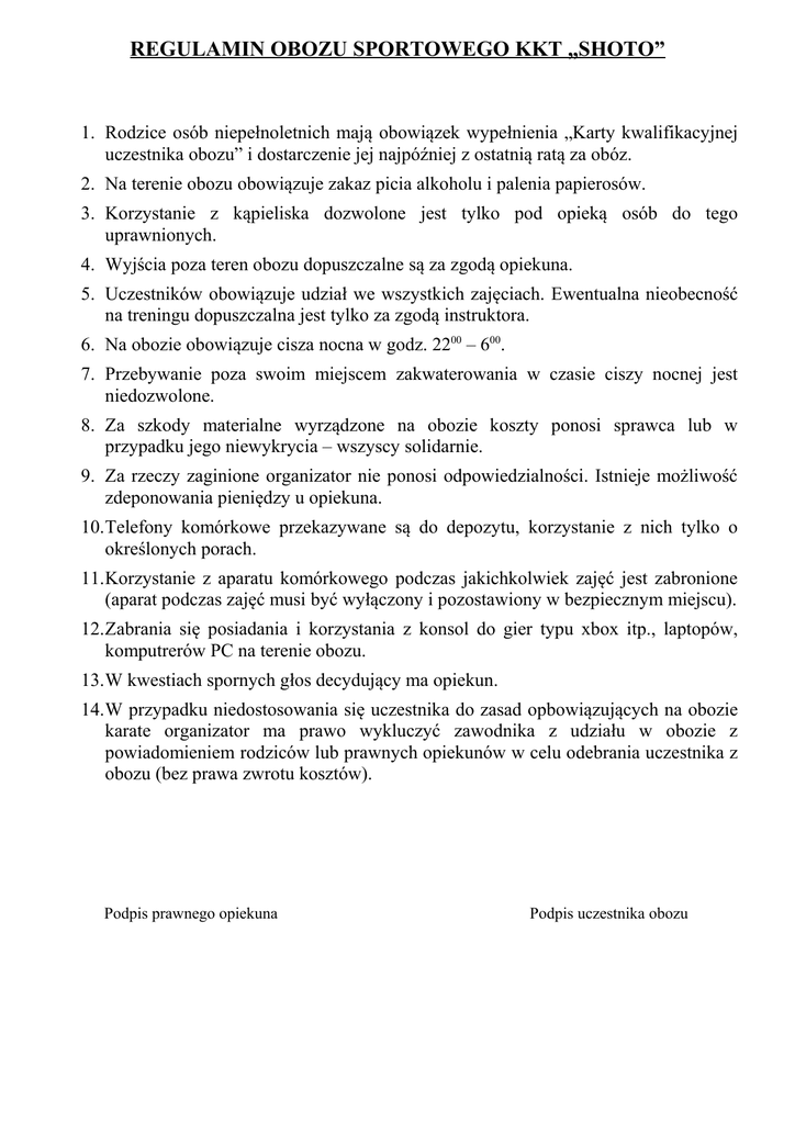 REGULAMIN OBOZU SPORTOWEGO KKT „SHOTO” 1. Rodzice osób niepełnoletnich mają obowiązek wypełnienia „Karty kwalifikacyjnej uczestnika obozu” i dostarczenie jej najpóźniej z ostatnią ratą za obóz. 2. Na terenie obozu obowiązuje zakaz picia alkoholu i palenia papierosów. 3. Korzystanie z kąpieliska dozwolone jest tylko pod opieką osób do tego uprawnionych. 4. Wyjścia poza teren obozu dopuszczalne są za zgodą opiekuna. 5. Uczestników obowiązuje udział we wszystkich zajęciach. Ewentualna nieobecność na treningu dopuszczalna jest tylko za zgodą instruktora. 6. Na obozie obowiązuje cisza nocna w godz. 2200 – 600. 7. Przebywanie poza swoim miejscem zakwaterowania w czasie ciszy nocnej jest niedozwolone. 8. Za szkody materialne wyrządzone na obozie koszty ponosi sprawca lub w przypadku jego niewykrycia – wszyscy solidarnie. 9. Za rzeczy zaginione organizator nie ponosi odpowiedzialności. Istnieje możliwość zdeponowania pieniędzy u opiekuna. 10.Telefony komórkowe przekazywane są do depozytu, korzystanie z nich tylko o określonych porach. 11.Korzystanie z aparatu komórkowego podczas jakichkolwiek zajęć jest zabronione (aparat podczas zajęć musi być wyłączony i pozostawiony w bezpiecznym miejscu). 12.Zabrania się posiadania i korzystania z konsol do gier typu xbox itp., laptopów, komputrerów PC na terenie obozu. 13.W kwestiach spornych głos decydujący ma opiekun. 14.W przypadku niedostosowania się uczestnika do zasad opbowiązujących na obozie karate organizator ma prawo wykluczyć zawodnika z udziału w obozie z powiadomieniem rodziców lub prawnych opiekunów w celu odebrania uczestnika z obozu (bez prawa zwrotu kosztów). Podpis prawnego opiekuna Podpis uczestnika obozu