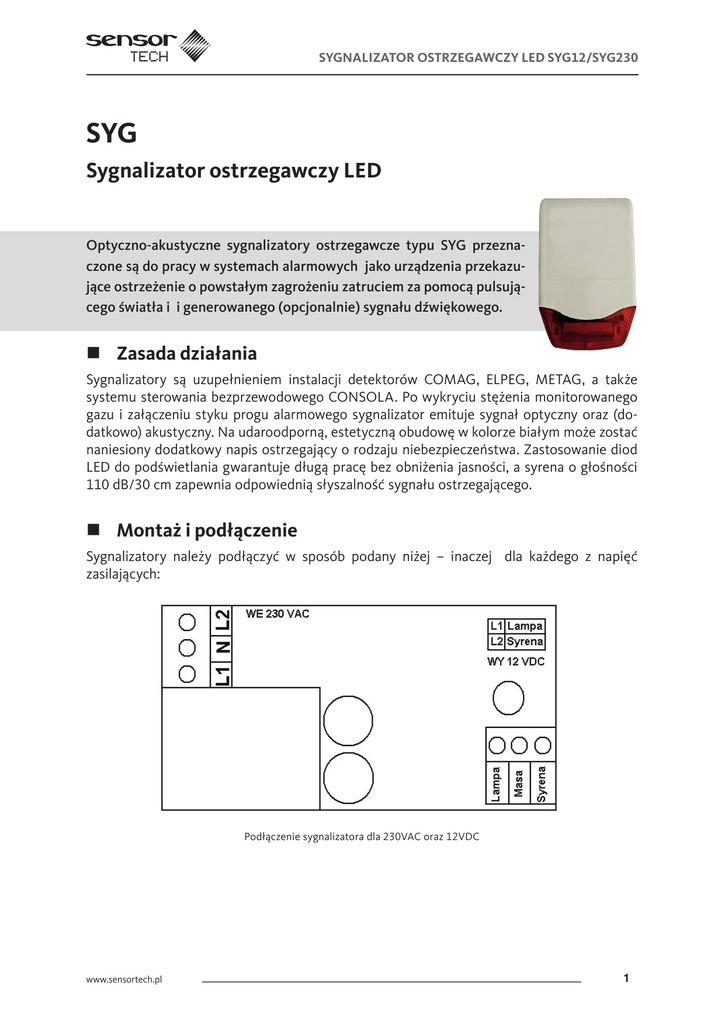 sygnalizator ostrzegawczy led syg12/syg230 SYG Sygnalizator ostrzegawczy LED Optyczno-akustyczne sygnalizatory ostrzegawcze typu SYG przeznaczone są do pracy w systemach alarmowych jako urządzenia przekazujące ostrzeżenie o powstałym zagrożeniu zatruciem za pomocą pulsującego światła i i generowanego (opcjonalnie) sygnału dźwiękowego. Zasada działania Sygnalizatory są uzupełnieniem instalacji detektorów COMAG, ELPEG, METAG, a także systemu sterowania bezprzewodowego CONSOLA. Po wykryciu stężenia monitorowanego gazu i załączeniu styku progu alarmowego sygnalizator emituje sygnał optyczny oraz (dodatkowo) akustyczny. Na udaroodporną, estetyczną obudowę w kolorze białym może zostać naniesiony dodatkowy napis ostrzegający o rodzaju niebezpieczeństwa. Zastosowanie diod LED do podświetlania gwarantuje długą pracę bez obniżenia jasności, a syrena o głośności 110 dB/30 cm zapewnia odpowiednią słyszalność sygnału ostrzegającego. Montaż i podłączenie Sygnalizatory należy podłączyć w sposób podany niżej – inaczej dla każdego z napięć zasilających: Podłączenie sygnalizatora dla 230VAC oraz 12VDC www.sensortech.pl 1 sygnalizator ostrzegawczy led syg12/syg230 Załączenie sygnału alarmowego dla napięcia 12VDC odbywa się przez niezależne podanie na wejścia wyzwalające SYRENA i LAMPA napięć +12V. W przypadku sterowania sygnałem optycznym i akustycznym z jednego źródła, przewody sygnału sterującego muszą zostać podłączone do obu wejść sterujących. Schemat podłączenia dla zasilania 230VAC: L1+N = sygnalizacja optyczna L1+L2+N = sygnalizacja optyczna i akustyczna L2+N = brak reakcji ze strony układu Dane techniczne PARAMETR SYGNALIZATOR SYG12/SYG230 Maksymalny pobór mocy Klasa ochronności Stopień ochrony IP 230VAC, 50Hz 11-15VDC / 9-13VAC 90mA II 44 Wymiary 183×310×75mm Częstotliwość błysków Natężenie dźwięku Przewody przyłączeniowe maks. Temperatura użytkowania Waga 1,2Hz 110 dB/0,3m 2x1mm2 -15°C..+40°C 0,70kg Zasilanie Parametry techniczne sygnalizatora SYG 2 Nie wyrzucaj do śmieci! Ten symbol oznacza, że pod żadnym pozorem urządzeń nie należy wyrzucać do zwykłych koszy na śmieci. Należy je oddawać do specjalnych punktów zbierania zużytego sprzętu elektronicznego. www.sensortech.pl