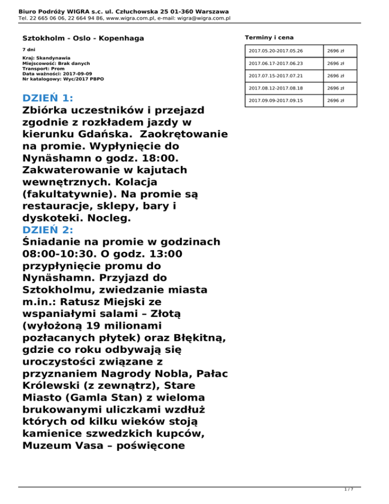 Biuro Podróży WIGRA s.c. ul. Człuchowska 25 01-360 Warszawa Tel. 22 665 06 06, 22 664 94 86, www.wigra.com.pl, e-mail: [email protected] Sztokholm - Oslo - Kopenhaga 7 dni Kraj: Skandynawia Miejscowość: Brak danych Transport: Prom Data ważności: 2017-09-09 Nr katalogowy: Wyc/2017 PBPO DZIEŃ 1: Zbiórka uczestników i przejazd zgodnie z rozkładem jazdy w kierunku Gdańska. Zaokrętowanie na promie. Wypłynięcie do Nynäshamn o godz. 18:00. Zakwaterowanie w kajutach wewnętrznych. Kolacja (fakultatywnie). Na promie są restauracje, sklepy, bary i dyskoteki. Nocleg. DZIEŃ 2: Śniadanie na promie w godzinach 08:00-10:30. O godz. 13:00 przypłynięcie promu do Nynäshamn. Przyjazd do Sztokholmu, zwiedzanie miasta m.in.: Ratusz Miejski ze wspaniałymi salami – Złotą (wyłożoną 19 milionami pozłacanych płytek) oraz Błękitną, gdzie co roku odbywają się uroczystości związane z przyznaniem Nagrody Nobla, Pałac Królewski (z zewnątrz), Stare Miasto (Gamla Stan) z wieloma brukowanymi uliczkami wzdłuż których od kilku wieków stoją kamienice szwedzkich kupców, Muzeum Vasa – poświęcone Terminy i cena 2017.05.20-2017.05.26 2696 zł 2017.06.17-2017.06.23 2696 zł 2017.07.15-2017.07.21 2696 zł 2017.08.12-2017.08.18 2696 zł 2017.09.09-2017.09.15 2696 zł 1/7 Biuro Podróży WIGRA s.c. ul. Człuchowska 25 01-360 Warszawa Tel. 22 665 06 06, 22 664 94 86, www.wigra.com.pl, e-mail: [email protected] okrętowi wojennemu, który zatonął w 1628 r. i został odnaleziony w 1956 r. Przejazd do hotelu, zakwaterowanie. Kolacja (fakultatywnie). Nocleg. DZIEŃ 3: Śniadanie. Podziwianie panoramy Sztokholmu z punktu widokowego, czas wolny na zakupy i wyjazd do Oslo. W godzinach wieczornych przyjazd w okolice stolicy Norwegii. Krótki postój nad największym jeziorem Szwecji – Vanern. Zakwaterowanie w hotelu. Kolacja (fakultatywnie). Nocleg. DZIEŃ 4: Śniadanie. Przejazd na Półwysep Bygdoy - zwiedzanie: Muzeum Łodzi Wikingów, Muzeum Fram - szkunera z XIX w. biorącego udział w trzech wielkich wyprawach polarnych lub Muzeum Kon-Tiki - tratwy, która przepłynęła Pacyfik. Dalsze zwiedzanie Oslo, m.in.: Ratusz, gdzie wręczane są Pokojowe Nagrody Nobla, Pałac Królewski Slottet, katedra, niepowtarzalny Teatr Opery i Baletu, spacer po niezwykłym Parku Vigelanda wśród 212 rzeźb z kamienia i brązu, nowoczesna dzielnica Tjuvholmen. Przejazd w okolice Angelholm w Szwecji. Zakwaterowanie w hotelu. Kolacja (fakultatywnie). Nocleg. DZIEŃ 5: Śniadanie. Przejazd do Helsingborg, 2/7 Biuro Podróży WIGRA s.c. ul. Człuchowska 25 01-360 Warszawa Tel. 22 665 06 06, 22 664 94 86, www.wigra.com.pl, e-mail: [email protected] krótka przeprawa promowa do Helsingor. Zwiedzanie z Zamku Hamleta (kazamaty, kaplica). Przejazd do Fredensborga – zwiedzanie (z zewnątrz) letniej rezydencji Królowej Małgorzaty II. Przejazd do Hillerod i zwiedzanie zamku Frederiksborg (komnaty). Frederiksborg Slot – najpotężniejszy zamek Danii zajmuje trzy wyspy położone na malowniczym sztucznym jeziorze. Zamkowe wieże, wieżyczki, szczyty i pokryte patyną, miedziane dachy górują nad miastem Hillerod. Dwie największe atrakcje to złocona Ridder Kapellet (Kaplica Koronacyjna), gdzie w ciągu ostatnich dwóch wieków – gdy zamek był siedzibą królewską – odbywały się koronacje monarchów, oraz potężna Riddersalen (Sala Rycerska) z pięknie dekorowanym wysokim sklepieniem. Przejazd w okolice Kopenhagi. Zakwaterowanie w hotelu. Kolacja (fakultatywnie). Nocleg. DZIEŃ 6: Śniadanie. Kopenhaga – panoramiczne zwiedzanie miasta m.in. Zamek Christiansborg, Parlament, kopenhaska giełda – Borsen, Nyhavn, Pałac Królewski Amalienborg, fontanna bogini Gefion, pomnik Kopenhaskiej Syrenki, Katedra. Czas wolny na deptaku kopenhaskim Strøget. 3/7 Biuro Podróży WIGRA s.c. ul. Człuchowska 25 01-360 Warszawa Tel. 22 665 06 06, 22 664 94 86, www.wigra.com.pl, e-mail: [email protected] Spektakularny przejazd 16 km mostem Øresund łączącym Danię ze Szwecją. Przejazd do bazy promowej w Karlskrona. Zakwaterowanie w kajutach wewnętrznych. Kolacja (fakultatywnie). O godzinie 21:00 wypłynięcie do Gdyni. Na promie są restauracje, sklepy, bary i dyskoteki. Nocleg. DZIEŃ 7: Śniadanie. Przypłynięcie do Gdyni o godzinie 07:30. Powrót do poszczególnych miejscowości zgodnie z rozkładem jazdy. Program imprezy jest ramowy, kolejność zwiedzania może ulec zmianie. ZAREZERWUJ JUŻ DZIŚ, TEL . 22 665 06 06, 22 664 94 86 CENA IMPREZY OBEJMUJE: - transport autokarem (klimatyzacja, barek, wc, dvd) lub mniejszym autokarem (klimatyzacja, dvd) - przeprawy promowe: Gdańsk – Nynashamn; Karlskrona – Gdynia - 4 noclegi w hotelach*** w pokojach 2 - osobowych z łazienką - 2 noclegi na promie w kajutach 4-osobowych wewnętrznych z łazienką i wc - 6 śniadań 4/7 Biuro Podróży WIGRA s.c. ul. Człuchowska 25 01-360 Warszawa Tel. 22 665 06 06, 22 664 94 86, www.wigra.com.pl, e-mail: [email protected] - opiekę pilota - ubezpieczenie Signal Iduna (KL 10.000 EUR, NNW 15.000 PLN, bagaż 1.000 EUR) DODATKOWO PŁATNE: - pakiet do realizacji programu: 150 EUR (rezerwacje i wstępy do zwiedzanych obiektów, usługi przewodnickie, opłaty za wewnętrzne przeprawy promowe, przejazd mostem Kopenhaga – Malmö, zestaw słuchawkowy Tour Guide) płatny obligatoryjnie pilotowi wycieczki DOPŁATY OPCJONALNE: dopłata do pokoju 1-osobowego: 850 zł dopłata do kajuty 2-osobowej: 360 zł dopłata do 6 obiadokolacji: 1000 zł WAŻNE INFORMACJE: 1. Wycieczki będą realizowane w zależności od ilości uczestników w grupie: wygodnymi autokarami lub wygodnymi busami. 2. Niektóre połączenia krajowe mogą być realizowane innymi środkami transportu niż autokar (bus, samochód osobowy, autokar liniowy, pociąg). Trasy antenowe obsługiwane są bez pilota. 3. Wyjazd *antenkowy za dopłatą z wybranego miasta organizowany 5/7 Biuro Podróży WIGRA s.c. ul. Człuchowska 25 01-360 Warszawa Tel. 22 665 06 06, 22 664 