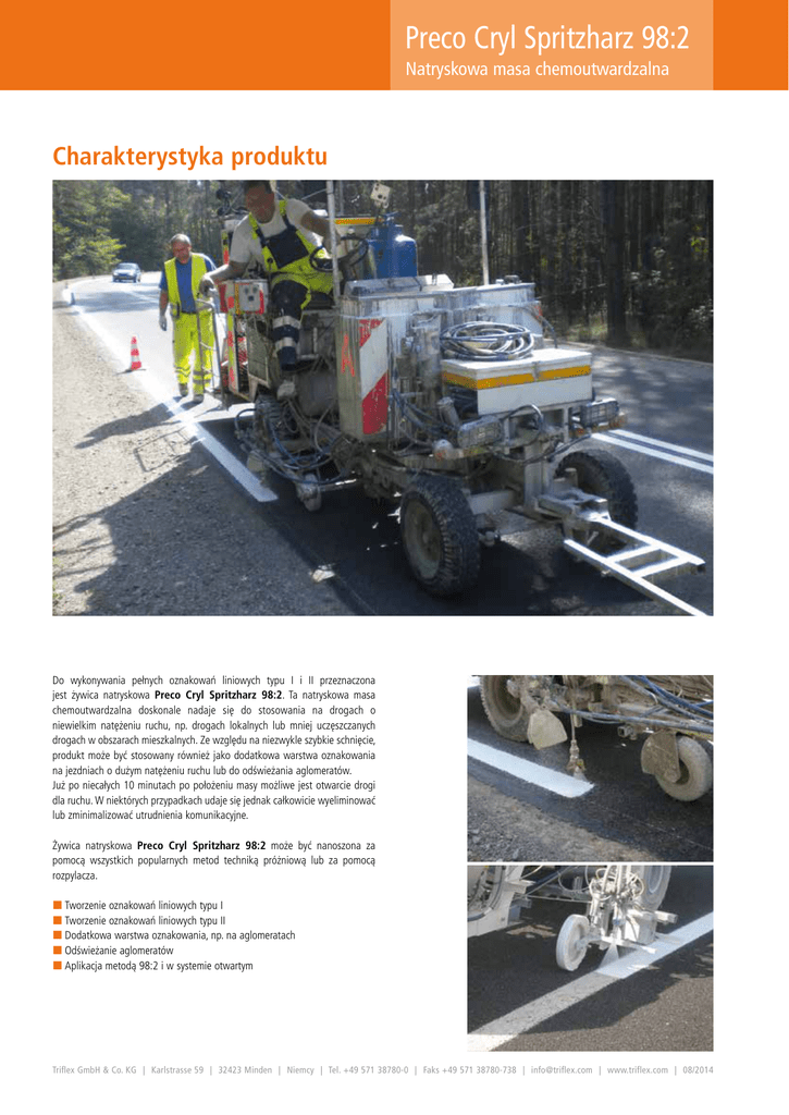Preco Cryl Spritzharz 98:2 Natryskowa masa chemoutwardzalna Charakterystyka produktu Do wykonywania pełnych oznakowań liniowych typu I i II przeznaczona jest żywica natryskowa Preco Cryl Spritzharz 98:2. Ta natryskowa masa chemoutwardzalna doskonale nadaje się do stosowania na drogach o niewielkim natężeniu ruchu, np. drogach lokalnych lub mniej uczęszczanych drogach w obszarach mieszkalnych. Ze względu na niezwykle szybkie schnięcie, produkt może być stosowany również jako dodatkowa warstwa oznakowania na jezdniach o dużym natężeniu ruchu lub do odświeżania aglomeratów. Już po niecałych 10 minutach po położeniu masy możliwe jest otwarcie drogi dla ruchu. W niektórych przypadkach udaje się jednak całkowicie wyeliminować lub zminimalizować utrudnienia komunikacyjne. Żywica natryskowa Preco Cryl Spritzharz 98:2 może być nanoszona za pomocą wszystkich popularnych metod techniką próżniową lub za pomocą rozpylacza. ¢¢Tworzenie oznakowań liniowych typu I ¢¢Tworzenie oznakowań liniowych typu II ¢¢Dodatkowa warstwa oznakowania, np. na aglomeratach ¢¢Odświeżanie aglomeratów ¢¢Aplikacja metodą 98:2 i w systemie otwartym Triflex GmbH & Co. KG | Karlstrasse 59 | 32423 Minden | Niemcy | Tel. +49 571 38780-0 | Faks +49 571 38780-738 | [email protected] | www.triflex.com | 08/2014 Preco Cryl Spritzharz 98:2 Natryskowa masa chemoutwardzalna Charakterystyka produktu Właściwości Masa chemoutwardzalna Preco Cryl Spritzharz 98:2 na bazie polimetakrylanu metylu (PMMA) charakteryzuje się następującymi właściwościami: ¢¢Odporna na obciążenia mechaniczne ¢¢Przyczepna na całej powierzchni ¢¢Odporna na działanie czynników atmosferycznych (promieniowanie UV, IR itd.) ¢¢Odporna na działanie alkaliów ¢¢Szybkowiążąca ¢¢Elastyczna ¢¢Aplikowana na zimno ¢¢Atest BASt ¢¢Atest IBDiM Instrukcja mieszania Żywicę natryskową Preco Cryl Spritzharz należy wymieszać przed zastosowaniem za pomocą mieszadła pracującego na wolnym biegu. W zależności od temperatury zewnętrznej, w mieszalniku statycznym (lub podobnym urządzeniu) do produktu należy dodać od 1 do 2 % katalizatora. Czas schnięcia ok. 4–10 min. w temp. +20 °C Budowa systemu Przechowywanie Podkład gruntujący Triflex Than Grund L 1K – zapewnia izolację podłoża betonowego oraz jego przyczepność. Preco Cryl Spritzharz 98:2 – w postaci oznakowania pełnego. Posypka – zgodnie z odpowiednim świadectwem kontroli BASt. Postać Przechowywać w stanie zamkniętym i niezmieszanym w chłodnym, suchym i zabezpieczonym przed mrozem miejscu przez ok. 6 miesięcy. Należy bezwzględnie unikać bezpośredniego oddziaływania światła słonecznego na pojemniki z materiałem, także na placu budowy. Świadectwa kontroli / ZTV M 13 Wiadro 38,00 kg Preco Cryl Spritzharz 98:2 Kontener 1 050,00 kg Preco Cryl Spritzharz 98:2 Perły reaktywne Perły odblaskowe powleczone nadtlenkiem 25,00 kg Echostar 5 BCP Techno SRT 25,00 kg Echostar 30 BCP Techno SRT Katalizator 0,70 kg Preco Cryl Pulverkatalysator 20,00 kg Triflex Flüssigkatalysator Kolory Towar magazynowy: specjalnego pistoletu, a następnie dodatkowo rozsypane na powierzchni. Proporcja mieszania żywicy Preco Cryl Spritzharz 98:2 oraz pereł Technoperlen wynosi 1 : 1. Konieczne jest równomierne pokrycie mokrego oznakowania perłami Technoperlen. Pełne pokrycie zostaje osiągnięte wówczas, gdy na powierzchni nie są już widoczne błyszczące miejsca. 9010 Biały Wskazówka: Dodatkowe informacje na temat dostępnych kolorów znaleźć można w rozdziale 7 – Informacje ogólne. Sposoby aplikacji Metoda 98:2 Metoda ta zakłada aplikację żywicy natryskowej Preco Cryl Spritzharz 98:2 z zastosowaniem malowarki dwuskładnikowej techniką próżniową lub za pomocą sprężonego powietrza, z zachowaniem proporcji mieszania 98:2. Rolę aktywatora nadtlenkowego pełni katalizator w płynie Triflex Flüssigkatalysator. Obie substancje zostają zmieszane np. w mieszalniku statycznym. System otwarty Metoda ta zakłada aplikację żywicy natryskowej Preco Cryl Spritzharz 98:2 z zastosowaniem malowarki jednoskładnikowej techniką próżniową lub za pomocą sprężonego powietrza. Rolę aktywatora nadtlenkowego pełnią perły Echostar 5 BCP Techno SRT lub Echostar 30 BCP Techno SRT, które zostają wstrzyknięte do strumienia rozpylanego materiału za pomocą Żywica Triflex Preco Cryl Spritzharz spełnia najnowsze wymogi ZTV M 13. Aktualne świadectwa kontroli znaleźć można na stronie internetowej pod adresem www.triflex.com, w zakładce "Oznakowania", sekcja "Do pobrania". Zużycie materiału Preco Cryl Spritzharz 98:2, gęstość ok. 1,4 g/cm³ Pełne oznakowanie liniowe: Zużycie ok. 0,84 kg/m² przy grubości warstwy 0,60 mm. Zużycie ok. 1,05 kg/m² przy grubości warstwy 0,75 mm. W odniesieniu do linii ciągłej wykonywanej na odcinku 1 km. Oznakowanie wstępne/odświeżanie: Zużycie ok. 0,42 kg/m² przy grubości warstwy 0,30 mm. Zużycie ok. 0,56 kg/m² przy grubości warstwy 0,40 mm. Wzór wyliczenia: Szerokość linii (m) x długość linii (m) x zużycie (kg/m²) = Zużycie powierzchniowe (kg) Informacje ogólne Dodatkowe informacje na temat dostępnych opakowań, sposobów aplikacji oraz przygotowania podłoża znajdują się w rozdziale 7 – Informacje ogólne. Rękojmia Więcej informacji na temat uprawnień z tytułu rękojmi znajdą Państwo w rozdziale 7 – Informacje ogólne. Triflex GmbH & Co. KG | Karlstrasse 59 | 32423 Minden | Niemcy | Tel. +49 571 38780-0 | Faks +49 571 38780-738 | [email protected] | www.triflex.com | 08/2014