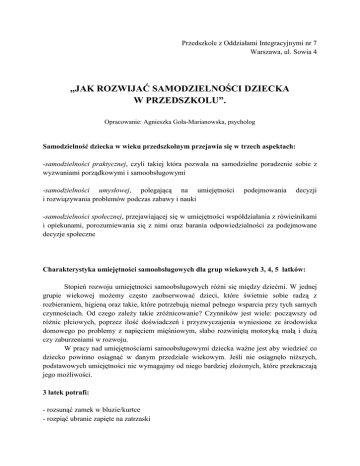 Przedszkole z Oddziałami Integracyjnymi nr 7 Warszawa, ul. Sowia 4 „JAK ROZWIJAĆ SAMODZIELNOŚCI DZIECKA W PRZEDSZKOLU”. Opracowanie: Agnieszka Gola-Marianowska, psycholog Samodzielność dziecka w wieku przedszkolnym przejawia się w trzech aspektach: -samodzielności praktycznej, czyli takiej która pozwala na samodzielne poradzenie sobie z wyzwaniami porządkowymi i samoobsługowymi -samodzielności umysłowej, polegającą na umiejętności i rozwiązywania problemów podczas zabawy i nauki podejmowania decyzji -samodzielności społecznej, przejawiającej się w umiejętności współdziałania z rówieśnikami i opiekunami, porozumiewania się z nimi oraz barania odpowiedzialności za podejmowane decyzje społeczne Charakterystyka umiejętności samoobsługowych dla grup wiekowych 3, 4, 5 latków: Stopień rozwoju umiejętności samoobsługowych różni się między dziećmi. W jednej grupie wiekowej możemy często zaobserwować dzieci, które świetnie sobie radzą z rozbieraniem, higieną oraz takie, które potrzebują niemal pełnego wsparcia przy tych samych czynnościach. Od czego zależy takie zróżnicowanie? Czynników jest wiele: począwszy od różnic płciowych, poprzez ilość doświadczeń i przyzwyczajenia wyniesione ze środowiska domowego po problemy z napięciem mięśniowym, słabo rozwiniętą motoryką małą i dużą czy zaburzeniami w rozwoju. W pracy nad umiejętnościami samoobsługowymi dziecka ważne jest aby wiedzieć co dziecko powinno osiągnąć w danym przedziale wiekowym. Jeśli nie osiągnęło niższych, podstawowych umiejętności nie wymagajmy od niego bardziej złożonych, które przekraczają jego możliwości. 3 latek potrafi: - rozsunąć zamek w bluzie/kurtce - rozpiąć ubranie zapięte na zatrzaski - mieszać łyżeczką w kubeczku/misce - zdjąć luźną bluzę wkładaną przez głowę i rozpięte części ubrania - odkręcić i zakręcić kran - załatwić się do toalety i spuścić wodę - odkręcić kran i nalać wodę do kubka - włożyć skarpetki - nadziać jedzenie na widelec i wziąć do ust - rozpiąć duże guziki - zgłaszać potrzeby fizjologiczne - włożyć półbuty z pomocą dorosłego - włożyć kapcie - włożyć kurtkę lub bluzę rozpinaną z przodu 4 latek potrafi: - zjeść samodzielnie posiłek, posługując się łyżką i widelcem - umyć samodzielnie twarz i ręcę - włożyć spodnie - włożyć przez głowę luźną bluzę - wydmuchać samodzielnie nos w chusteczkę - zapiąć ubrania na zatrzaski - włożyć rękawiczki z jednym palcem 5 latek potrafi: - zapiąć ubranie na guziki - ma zwyczaj mycia rąk przed jedzeniem - potrafi się podetrzeć po załatwieniu do toalety - w kąpieli myje się samo - zapiąć pasek lub buty z klamerką - przewlec pasek przez szlufki - nałożyć pastę na szczoteczkę - samodzielnie umyć zęby Wspieranie przez osobę dorosłą samodzielności dziecka odbywa się poprzez: - budowanie bezpiecznej relację z dzieckiem - budowanie poczucia wartości dziecka poprzez docenianie, chwalenie, okazywanie szacunku dla wysiłku dziecka - uważne słuchanie dziecka - wyznaczanie swoich granic i respektowanie granic dziecka - mówienie o własnych uczuciach i oczekiwaniach - dawanie dziecku możliwości wyboru - nie wyręczanie i nie spiesznie się z dawaniem rozwiązania, pomocy - umiejętnym wycofywanie swojej pomocy i obecności w miarę postępów - dawanie możliwość naprawiania różnych spraw przez dziecko i pokazywania konsekwencji zachowań NAUKA SAMODZIELNOŚCI PRZEDSZKOLAKA Pewne umiejętności są niezbędne do samodzielnego funkcjonowania dziecka poza środowiskiem domowym. Przedszkolak jest w trakcie ich nabywania i często jeszcze potrzebuje pomocy i wsparcia. Udany start w przedszkolu nie oznacza, że dziecko ma być w pełni samodzielne – nauczyciele są po to, by je wspierać. Należy pamiętać, że wspieranie nie polega wyręczaniu dziecka. Najlepsze efekty przedszkolak osiąga gdy jest zachowana spójność między wymogami przedszkolnymi i domowymi. Współpraca rodziców z gronem pedagogicznym znacznie przyspiesza rozwój samodzielności dziecka, poprzez wyznaczanie tych samych celów i bycia konsekwentnym. Nauka samodzielnego jedzenia Początkowo trzylatek może mieć trudności z utrzymaniem łyżki i widelca, często się brudzi i wylewa. W tym okresie ważne jest aby dziecko nie zniechęcało się i próbowało samodzielnie jeść dlatego nie wyręczamy dziecka a pokazujemy w atmosferze wspierającej jak sobie radzić. Nigdy nie karzemy i nie krzyczymy na dziecko za nieudane próby, wolne tempo jedzenia i niezgrabne ruchu. Chwalimy kiedy samodzielnie zjadło. Pamiętajmy, że dzieci uczą się samodzielności małymi krokami. Bądźmy konsekwentni, jeżeli wymagamy od dziecka samodzielnego jedzenia jednego dnia, nie wyręczajmy go poprze karmienie następnego dnia. Wówczas uczymy dziecko, że warto poczekać, pokręcić nosem bo w końcu i tak go ktoś nakarmi, a nie o to nam chodzi. Gdy dziecko potrafi sprawnie jeść rozwijajmy jego samodzielność poprzez możliwość posmarowania sobie (tępym) nożem kanapki, nalania z dzbanka wody do kubeczka, nakrycia do stołu i posprzątania po jedzeniu. Ważne aby zdawać sobie sprawę, że dziecko nie tylko uczy się umiejętności samodzielnego jedzenia ale również ćwiczy koordynację wzrokowo-ruchową, oraz koncentrację uwagi. Nauka ubierania się Podczas samodzielnego ubierania dziecko ćwiczy nie tylko umiejętności samoobsługowe i swoją niezależność ale również motorykę dużą i małą (np. przy zakładaniu spodni/ sweterka, rozpinaniu guzików), koordynację pracy obu rąk (zakładanie skarpetek, bucików) czy koncentracji uwagi i koordynacji ruchów ręki i oczu (wiązanie bucików, zapinanie guzików/ suwaka itp.). Ubierając i rozbierając dzieci zabieramy im możliwość ćwiczenia szeregu umiejętności, które przekładają się na sprawności ruchowe czy grafomotoryczne dziecka.