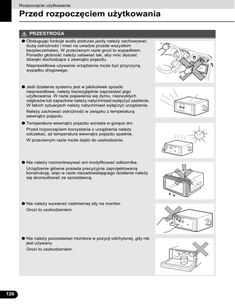Rozpoczęcie użytkowania Przed rozpoczęciem użytkowania PRZESTROGA ● Obsługując funkcje audio podczas jazdy należy zachowywać dużą ostrożność i mieć na uwadze przede wszystkim bezpieczeństwo. W przeciwnym razie grozi to wypadkiem. Ponadto głośność należy ustawiać tak, aby móc słyszeć dźwięki dochodzące z zewnątrz pojazdu. Nieprawidłowe używanie urządzenia może być przyczyną wypadku drogowego. ● Jeśli działanie systemu jest w jakikolwiek sposób nieprawidłowe, należy bezwzględnie zaprzestać jego użytkowania. W razie pojawienia się dymu, niezwykłych odgłosów lub zapachów należy natychmiast wyłączyć zasilanie. W takich sytuacjach należy natychmiast wyłączyć urządzenie. Należy zachować ostrożność w związku z temperaturą wewnątrz pojazdu. ● Temperatura wewnątrz pojazdu wzrasta w gorące dni. Przed rozpoczęciem korzystania z urządzenia należy odczekać, aż temperatura wewnątrz pojazdu spadnie. W przeciwnym razie może dojść do uszkodzenia. ● Nie należy rozmontowywać ani modyfikować odbiornika. Urządzenie główne posiada precyzyjnie zaprojektowaną konstrukcję, więc w razie niezadowalającego działania należy się skonsultować ze sprzedawcą. ● Nie należy wywierać nadmiernej siły na monitor. Grozi to uszkodzeniem. ● Nie należy pozostawiać monitora w pozycji odchylonej, gdy nie jest używany. Grozi to uszkodzeniem. 126 126 ● Nie należy wkładać żadnych przedmiotów innych niż płyty do szczeliny na płytę. Grozi to uszkodzeniem. ● Należy uważać, aby nie przytrzasnąć palców ani żadnych przedmiotów za monitorem podczas jego składania. Może to być przyczyną obrażeń ciała lub uszkodzenia urządzenia. ● Płytę lub kartę pamięci SD należy wyjmować z odbiornika poziomo. Podczas wyjmowania nie należy mocno pociągać w górę ani pchać w dół. Nieprawidłowe wyjmowanie może doprowadzić do zadrapania płyty, powodując emitowanie przez urządzenie niestandardowych dźwięków. Nieprawidłowe wyjmowanie karty pamięci SD może doprowadzić do jej uszkodzenia. 127 127 Rozpoczęcie użytkowania Przed rozpoczęciem użytkowania Płyty UWAGA ● W zimną lub deszczową pogodę, gdy paruje wewnętrzna strona szyby, rosa (skroplona para wodna) może się gromadzić również na urządzeniu. W takiej sytuacji odtwarzanie płyty może być przerywane lub niemożliwe. Należy wówczas, przed wznowieniem odtwarzania, osuszyć powietrze w pojeździe. ● W przypadku wystąpienia problemu działanie odtwarzacza zostaje automatycznie przerwane w celu ochrony jego wewnętrznych części. Jeśli odtwarzacz nie działa pomimo postępowania zgodnie z komunikatami ekranowymi, może to oznaczać jego awarię. Należy się skonsultować z punktem zakupu. ● Gdy odtwarzacz jest narażony na silne wibracje podczas jazdy po nierównej nawierzchni, odtwarzanie może być przerywane. ● Nie należy stosować dostępnych w handlu środków do czyszczenia soczewek, ponieważ mogą one uszkodzić głowicę odtwarzacza. ■ Formatowanie płyt ● Urządzenie odtwarza płyty audio lub DVD wideo oznaczone jednym z poniższych symboli. W przypadku używania płyt DVD±R/RW (DVD z możliwością nagrywania/wielokrotnego zapisu) należy pamiętać, że odtwarzane mogą być tylko płyty, których zawartość została nagrana w trybie wideo. Płyty nagrane w trybie nagrywania wideo (VR) i w trybie audio nie są odtwarzane. ● Obsługiwany jest format Dolby Digital i można odtwarzać płyty oznaczone następującym logo. Ten produkt został wyprodukowany na licencji firmy Dolby Laboratories. Dolby oraz symbol podwójnej litery „D” to zarejestrowane znaki towarowe firmy Dolby Laboratories. ● Istnieje ryzyko, że urządzenie nie odtworzy płyty CD-R (CD z możliwością nagrywania) lub CD-RW (CD z możliwością wielokrotnego zapisu). Przyczyną tego mogą być właściwości nagrania bądź szczególne cechy płyty, zadrapania, zabrudzenia lub pogorszenie jej stanu na skutek długiego przechowywania w pojeździe. Ponadto urządzenie nie odtwarza niesfinalizowanych płyt CD-R i CD-RW ani płyt CD-R i CD-RW nagranych w formacie UDF. ● Istnieje ryzyko, że urządzenie nie odtworzy płyty DVD±R/RW (DVD z możliwością nagrywania/wielokrotnego zapisu). Przyczyną tego mogą być właściwości nagrania bądź szczególne cechy płyty, zadrapania, zabrudzenia lub pogorszenie jej stanu na skutek 128 128 długiego przechowywania w pojeździe. Ponadto urządzenie nie odtwarza niesfinalizowanych płyt DVD±R/RW. W zależności od aplikacji i środowiska systemowego może nie być możliwe odtworzenie płyty nagranej na komputerze osobistym. ● Funkcja CD-TEXT działa tylko dla dostępnych w sprzedaży płyt CD-text. Znaki zapisane na płycie CD-R i CD-RW mogą nie być prawidłowo wyświetlane. ● Nie należy używać płyt przezroczystych ani płyt CD z przezroczystym lub półprzezroczystym obszarem zapisu, ponieważ mogą one uniemożliwiać prawidłowe wkładanie i wysuwanie lub poprawne odtwarzanie zawartości. ● Nie można odtwarzać płyt z zabezpieczeniem przed kopiowaniem CCCD (Copy Control CD), ponieważ nie spełniają one oficjalnego standardu CD. ■ Obchodzenie się z płytami ● Nie należy narażać płyt na bezpośrednie oddziaływanie promieni słonecznych. Należy je przechowywać w pudełkach/etui ochronnych. W przeciwnym razie płyty mogą ulec zdeformowaniu i uniemożliwiać odtwarzanie. ● Nie należy naklejać papierowej taśmy na płytę — ani od strony zapisu, ani od strony z etykietą. Grozi to uszkodzeniem. ● Nie należy używać popękanych lub zdeformowanych płyt. Grozi to uszkodzeniem. ● Nie należy dotykać strony zapisu (z efektem tęczy) płyty. Grozi to zabrudzeniem płyty, co może być przyczyną przerywania podczas odtwarzania. ● W przypadku odtwarzania zabrudzonej płyty jej powierzchnia może ulec zadrapaniu i odtwarzanie może być przerywane. Płyty n