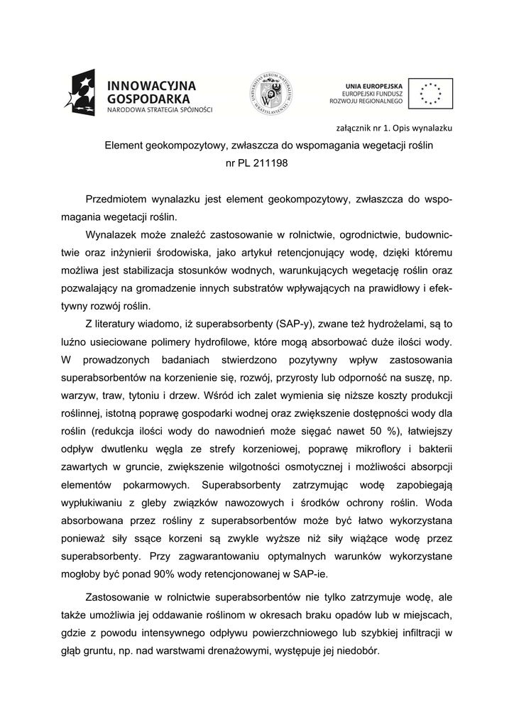 załącznik nr 1. Opis wynalazku Element geokompozytowy, zwłaszcza do wspomagania wegetacji roślin nr PL 211198 Przedmiotem wynalazku jest element geokompozytowy, zwłaszcza do wspomagania wegetacji roślin. Wynalazek może znaleźć zastosowanie w rolnictwie, ogrodnictwie, budownictwie oraz inżynierii środowiska, jako artykuł retencjonujący wodę, dzięki któremu możliwa jest stabilizacja stosunków wodnych, warunkujących wegetację roślin oraz pozwalający na gromadzenie innych substratów wpływających na prawidłowy i efektywny rozwój roślin. Z literatury wiadomo, iż superabsorbenty (SAP-y), zwane też hydrożelami, są to luźno usieciowane polimery hydrofilowe, które mogą absorbować duże ilości wody. W prowadzonych badaniach stwierdzono pozytywny wpływ zastosowania superabsorbentów na korzenienie się, rozwój, przyrosty lub odporność na suszę, np. warzyw, traw, tytoniu i drzew. Wśród ich zalet wymienia się niższe koszty produkcji roślinnej, istotną poprawę gospodarki wodnej oraz zwiększenie dostępności wody dla roślin (redukcja ilości wody do nawodnień może sięgać nawet 50 %), łatwiejszy odpływ dwutlenku węgla ze strefy korzeniowej, poprawę mikroflory i bakterii zawartych w gruncie, zwiększenie wilgotności osmotycznej i możliwości absorpcji elementów pokarmowych. Superabsorbenty zatrzymując wodę zapobiegają wypłukiwaniu z gleby związków nawozowych i środków ochrony roślin. Woda absorbowana przez rośliny z superabsorbentów może być łatwo wykorzystana ponieważ siły ssące korzeni są zwykle wyższe niż siły wiążące wodę przez superabsorbenty. Przy zagwarantowaniu optymalnych warunków wykorzystane mogłoby być ponad 90% wody retencjonowanej w SAP-ie. Zastosowanie w rolnictwie superabsorbentów nie tylko zatrzymuje wodę, ale także umożliwia jej oddawanie roślinom w okresach braku opadów lub w miejscach, gdzie z powodu intensywnego odpływu powierzchniowego lub szybkiej infiltracji w głąb gruntu, np. nad warstwami drenażowymi, występuje jej niedobór. 2 Innym czynnikiem obniżającym właściwości absorpcyjne wody jest sposób aplikacji superabsorbentów. Jedną z dotychczas realizowanych metod jest wprowadzanie superabsorbentu do podłoża w sposób bezpośredni i wymieszanie go z glebą do określonej głębokości. Rozwiązanie to nie jest dostatecznie skuteczne. Udokumentowane próby stosowania superabsorbentów dla zwiększenia retencji glebowej i dostarczenia zgromadzonej w nich wody roślinom, przyniosły niezadawalające efekty. Niska siła pęcznienia SAP-u pod obciążeniem powoduje, iż także po jego zmieszaniu z glebą nie jest on w stanie w pełni spęcznieć i całkowicie wykorzystać swoje właściwości retencjonowania wody. Stąd też jego działanie przy aplikacji bezpośredniej jest ograniczone. Ponadto, zmieszany z glebą superabsorbent, w procesie wielokrotnego pęcznienia i skurczu spowodowanego pobieraniem wody przez rośliny, zmienia strukturę gleb. Ponadto, wadami takich rozwiązań są możliwości całkowitego blokowania porów gruntu/gleby przez pęczniejący superabsorbent, brak kontroli nad położeniem i przemieszczaniem się superabsorbentu w podłożu, brak możliwości usunięcia raz zaaplikowanego superabsorbentu, a przede wszystkim ograniczenie efektywności pęcznienia w przypadku naprężeń pionowych. W przypadku aplikacji na zboczach może także dochodzić do zsuwu powierzchniowej warstwy gruntu z powodu zmniejszenia wytrzymałości na ścinanie. Superabsorbenty aplikowane powierzchniowo mogą być narażone na oddziaływania atmosferyczne, np. rozwiewanie przez wiatr, przyspieszone wysychanie itp. Ze względu na istniejące trudności znane ze stanu techniki podejmowano liczne próby opracowania skutecznej alternatywy dla dotychczasowych aplikacji superabsorbentów. Z opisu patentowego PL 169462 znany jest element chłonny zawierający superabsorbent tworzący hydrożel, w postaci materiału nośnego oraz wkładu polimerowego. Jest to nierozpuszczalna w wodzie, chłonna substancja polimerowa, będąca w stanie wchłaniać duże ilości wody i tworząca wskutek tego, hydrożel. Ze zgłoszenia patentowego nr P-362942, znana jest taśma geokompozytu przeznaczona do aplikacji do podłoża glebowego w celu powiększenia zdolności retencyjnej gleby. Taśma może być aplikowana do gruntu w przypadku zabudowy biologicznej skarp nasypów i wykopów lub skłonów i zboczy powstających przy pracach deniwelacyjnych terenu. 3 Z opisu patentowego JP58138807 znana jest taśma geokompozytu, charakteryzująca się tym, że elementy osłonowe stanowią co najmniej dwa pasy materiału o dobranej szerokości i długości. Dwa zewnętrzne brzegi pasów są ze sobą trwale połączone tak, że umieszczony we wnętrzu materiał absorbujący wodę, a także substancje w niej rozpuszczone, może swobodnie pęcznieć i kurczyć się. Swobodne pęcznienie materiału absorpcyjnego zapewnione jest jedynie na powierzchni terenu w momencie, gdy na taśmę geokompozytu nie działa obciążenie w postaci warstwy gleby, podczas gdy sposób aplikacji zakłada eksploatację wewnątrz warstwy wegetacyjnej (warstwy gleby) a więc w warunkach działania obciążeń na taśmę geokompozytu. Przyczyną jest wykonanie taśmy geokompozytu z typowych, wiotkich geowłóknin. Geowłókniny są materiałami elastycznymi o znikomej sztywności i odporności na zginanie nie mogą więc zapewnić wytrzymałości wystarczającej do przeciwdziałania obciążeniu od ciężaru gleby znajdującej się nad takim elementem taśmy. Tym samym materiały te nie zapewniają możliwości swobodnego pęcznienia materiału absorbującego wodę, zapadając się pod obciążeniem wynikającym z leżącej nad nim warstwy gruntu, gleby lub innego materiału, w którym taki element taśmy został założony. W konsekwencji, po zaaplikowaniu do podłoża bez aktywacji superabsorbentu wodą, po obciążeniu nadkładem gleby, e