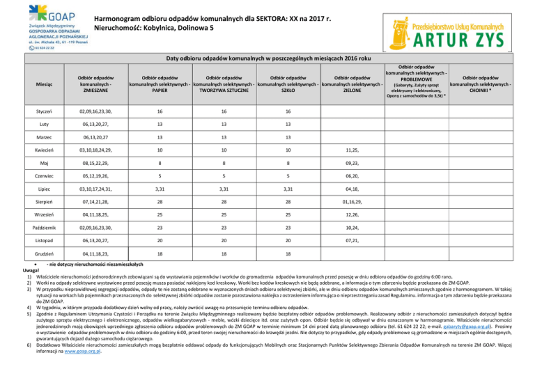Harmonogram odbioru odpadów komunalnych dla SEKTORA: XX na 2017 r. Nieruchomość: Kobylnica, Dolinowa 5 Daty odbioru odpadów komunalnych w poszczególnych miesiącach 2016 roku Miesiąc Odbiór odpadów komunalnych ZMIESZANE Odbiór odpadów Odbiór odpadów Odbiór odpadów Odbiór odpadów komunalnych selektywnych - komunalnych selektywnych - komunalnych selektywnych - komunalnych selektywnych PAPIER TWORZYWA SZTUCZNE SZKŁO ZIELONE Styczeń 02,09,16,23,30, 16 16 16 Luty 06,13,20,27, 13 13 13 Marzec 06,13,20,27 13 13 13 Kwiecień 03,10,18,24,29, 10 10 10 11,25, Maj 08,15,22,29, 8 8 8 09,23, Czerwiec 05,12,19,26, 5 5 5 06,20, Lipiec 03,10,17,24,31, 3,31 3,31 3,31 04,18, Sierpień 07,14,21,28, 28 28 28 01,16,29, Wrzesień 04,11,18,25, 25 25 25 12,26, Październik 02,09,16,23,30, 23 23 23 10,24, Listopad 06,13,20,27, 20 20 20 07,21, Grudzień 04,11,18,23, 18 18 18 Odbiór odpadów komunalnych selektywnych PROBLEMOWE Odbiór odpadów komunalnych selektywnych (Gabaryty, Zużyty sprzęt elektryczny i elektroniczny, CHOINKI * Opony z samochodów do 3,5t) * - nie dotyczy nieruchomości niezamieszkałych Uwaga! 1) Właściciele nieruchomości jednorodzinnych zobowiązani są do wystawiania pojemników i worków do gromadzenia odpadów komunalnych przed posesję w dniu odbioru odpadów do godziny 6:00 rano. 2) Worki na odpady selektywne wystawione przed posesję musza posiadać naklejony kod kreskowy. Worki bez kodów kreskowych nie będą odebrane, a informacja o tym zdarzeniu będzie przekazana do ZM GOAP. 3) W przypadku nieprawidłowej segregacji odpadów, odpady te nie zostaną odebrane w wyznaczonych dniach odbioru selektywnej zbiórki, ale w dniu odbioru odpadów komunalnych zmieszanych zgodnie z harmonogramem. W takiej sytuacji na workach lub pojemnikach przeznaczonych do selektywnej zbiórki odpadów zostanie pozostawiona naklejka z ostrzeżeniem informująca o nieprzestrzeganiu zasad Regulaminu. informacja o tym zdarzeniu będzie przekazana do ZM GOAP. 4) W tygodniu, w którym przypada dodatkowy dzień wolny od pracy, należy zwrócić uwagę na przesunięcie terminu odbioru odpadów. 5) Zgodnie z Regulaminem Utrzymania Czystości i Porządku na terenie Związku Międzygminnego realizowany będzie bezpłatny odbiór odpadów problemowych. Realizowany odbiór z nieruchomości zamieszkałych dotyczył będzie zużytego sprzętu elektrycznego i elektronicznego, odpadów wielkogabarytowych - meble, wózki dziecięce itd. oraz zużytych opon. Odbiór będzie się odbywał w dniu oznaczonym w harmonogramie. Właściciele nieruchomości jednorodzinnych mają obowiązek uprzedniego zgłoszenia odbioru odpadów problemowych do ZM GOAP w terminie minimum 14 dni przed datą planowanego odbioru (tel. 61 624 22 22; e-mail. [email protected]). Prosimy o wystawienie odpadów problemowych w dniu odbioru do godziny 6:00, przed teren swojej nieruchomości do krawędzi jezdni. Nie dotyczy to przypadków, gdy odpady problemowe są gromadzone w miejscach ogólnie dostępnych, gwarantujących dojazd dużego samochodu ciężarowego. 6) Dodatkowo Właściciele nieruchomości zamieszkałych mogą bezpłatnie oddawać odpady do funkcjonujących Mobilnych oraz Stacjonarnych Punktów Selektywnego Zbierania Odpadów Komunalnych na terenie ZM GOAP. Więcej informacji na www.goap.org.pl.