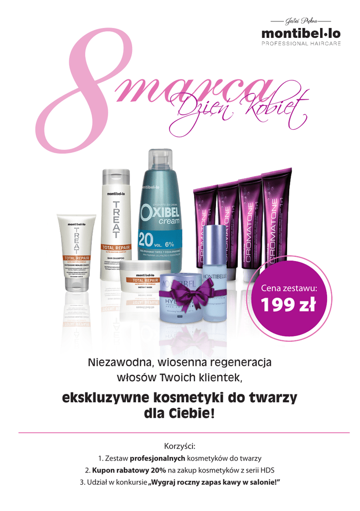 8 marca - Dzien Kobiet Cena zestawu: 199 zł Niezawodna, wiosenna regeneracja włosów Twoich klientek, ekskluzywne kosmetyki do twarzy dla Ciebie! Korzyści: 1. Zestaw profesjonalnych kosmetyków do twarzy 2. Kupon rabatowy 20% na zakup kosmetyków z serii HDS 3. Udział w konkursie „Wygraj roczny zapas kawy w salonie!” W zestawie otrzymujesz: Koloryzacja Farba do włosów Cromatone 9.31 popielaty złoty bardzo jasny blond 4.60 naturalna czekolada Krem aktywujący OXIBEL 6% 7.44 bardzo intensywny miedziany blond X44 XTREM intensywny miedziany (wzmacniacz odcienia) Pielęgnacja włosów zniszczonych i wysuszonych Szampon do włosów zniszczonych TOTAL REPAIR, 300 ml Maska regenerująca TOTAL REPAIR, 200 ml Krem do końcówek TOTAL REPAIR, 75 ml Nawilża i regeneruje włókno włosa dzięki dużej zawartości cysteiny i hydrolizatów białka pszenicy. Przywraca włosom zarówno siłę, jak ich utraconą elastyczność. Uzupełnia aminokwasy, zapewnia włosom zdrowy, lśniący wygląd. Odbudowuje rozdwojone, łamliwe i kruche końcówki włosów. PREZENT DLA CIEBIE! PROFESJONALNE PRODUKTY DO PIELĘGNACJI TWARZY HYDRIUM krem nawilżający na dzień, 50 ml HYDRIUM intensywne serum nawilżające na noc Krem dla cery suchej i mieszanej. Nałóż krem na oczyszczoną skórę twarzy i szyję. Poczuj jak skóra odzyskuje naturalną równowagę, a Ty naturalnie zdrowy i promienny wygląd. Idealne dla cery zmęczonej i pozbawionej blasku. Nałóż serum na oczyszczoną skórę twarzy i szyję i pobudź ją do życia. Możesz je stosować także po ciężkiej, nieprzespanej nocy. Promocja ważna do 9 marca lub wyczerpania zapasów. Zestaw dostępny tylko w hurtowniach Grupy POLWELL. Listę punktów sprzedaży znajdziesz na stronie www.montibello.pl. Podana cena zawiera należny podatek VAT.