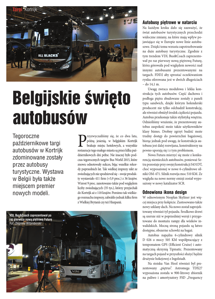 Targi Kortrijk Autobusy piętrowe w natarciu Belgijskie święto autobusów Tegoroczne październikowe targi autobusów w Kortrijk zdominowane zostały przez autobusy turystyczne. Wystawa w Belgii była także miejscem premier nowych modeli. VDL Bus&Coach zaprezentował po raz pierwszy nową piętrową Futurę Fot. Zbigniew Witamborski 16 P rzyzwyczailiśmy się, że co dwa lata, późną jesienią, w belgijskim Kortrijk brakuje miejsc hotelowych, a wszystkie restauracje tego małego miasta są przez kilka październikowych dni pełne. Nie inaczej było podczas tegorocznych targów Bus World 2015, które znowu odnotowały sukces, bijąc wszelkie rekordy poprzednich lat. Tak wielkiej imprezy nikt ze zwiedzających nie spodziewał się – swoje produkty wystawiało 411 firm (+5,9 proc.) z 36 krajów. Wzrost 9 proc. zanotowano także pod względem liczby zwiedzających (35 tys.), którzy przyjechali do Kortrijk aż z 118 krajów. Pomimo tak wielkiego rozmachu imprezy, zabrakło jednak kilku firm z Wielkiej Brytanii czy też Hiszpanii. Na każdym kroku dało się zauważyć, że świat autobusów turystycznych przechodzi widoczne zmiany, na które mają wpływ pojawiające się w Europie nowe linie autobusowe. Dzięki temu wzrasta zapotrzebowanie na duże autobusy turystyczne. Zgodnie z tym trendem VDL Bus&Coach zaprezentował po raz pierwszy nową piętrową Futurę, która górowała pod względem nowości nad innymi autobusami prezentowanymi na targach. FDD2 aby sprostać oczekiwaniom rynku oferowana jest w dwóch długościach – do 14,1 m. Uwagę zwraca modułowa i lekka konstrukcja tych autobusów. Część dachowa i podłoga piętra zbudowane zostały z paneli typu sandwich, dzięki którym holenderski producent nie tylko odchudził konstrukcję, ale również obniżył środek ciężkości pojazdu. Autobus przekonuje także stylistyką wnętrza. Odnieśliśmy wrażenie, że prezentowany autobus zaspokoić może także użytkowników klasy biznes. Drobny zgrzyt budzić może trudny dostęp do powierzchni bagażowej, biorąc jednak pod uwagę, że konstrukcja autobusu jest dalej rozwijana, konstruktorzy na pewno uporają się i z tym problemem. Nowa Futura mierzyć się może z konkurencją niemieckich autobusów, ponieważ Setra pozostaje przy swojej konstrukcji S431DT, choć wyposażonej w nowe 6-cylindrowe silniki OM-471. Silnik rozwija moc 510 KM. Ze względu na nowe normy emisji został wyposażony w nowy katalizator SCR. Odnowiona ikona design W odnowionym Neoplan Skyliner jest więcej miejsca przy kokpicie. Zastosowano także nowy szklany dach. Na nowo został zaprojektowany również tył pojazdu. Środkowe drzwi są szersze niż w poprzedniej wersji i przygotowane do montażu rampy dla wózków inwalidzkich. Mocną stroną pojazdu są łatwo dostępne, obszerne schowki na bagaż. Autobus napędza 6-cylindrowy silnik D 026 o mocy 505 KM współpracujący z tempomatem GPS (Efficient Cruise) i automatyczną skrzynią Tipmatic. Prezentowany na targach pojazd w przyszłości służyć będzie drużynie hokejowej z Ingolstadt. Na stoisku Van Hool również był prezentowany „piętrus”. Astromega TDX27 wyposażona została w 900-litrowy zbiornik na paliwo i amortyzatory FSD „Frequency Selective Damping” z specjalnym system zaworów hydraulicznych poprawiających komfort jazdy. W tym segmencie autobusów swój pojazd wystawił przedstawiciel hiszpańskiej firmy Unvi i Ajats. Obydwie firmy zrezygnowały z drugiej pary schodów prowadzących na wyższy pokład. Rozwiązanie to możliwe jest zgodnie z normami europejskimi tylko, gdy piętro posiada mniej niż 50 miejsc. Festiwal okrętów flagowych Swoje premiery świętowały także inne firmy. Należał do nich hiszpański Irizar, lider w produkcji karoserii i autobusów na rynku hiszpańskim. Do końca roku 2015 Irizar chce wyprodukować 250 autobusów, co stanowi potężny skok w porównaniu z rokiem ubiegłym (w roku 2014 wyprodukowano 120). Producent postawił na rozwój swoich autobusów, których najlepszym przedstawicielem jest flagowy i8. Podobnie jak w poprzednim typie i6 Hiszpanie wykorzystują skrzynię ZF i silnik DAF. Prawie 4-metrowy autobus w 3-osiowej wersji imponuje nową stylizacją wnętrza, trochę przypominającą swojego poprzednika PB. Irizar i8 oferuje wszystko, czego należy spodziewać się od nowoczesnego autobusu – spełnia normy bezpieczeństwa ECE R 6602. Na pokładzie tego autobusu znajdziemy system ESP, system hamulcowy AEBS, asystent pasa, jak również tempomat zbliżeniowy ACC, czy system kontroli ciśnienia w oponach. Autobus ten napędza sprawdzona 460-konna jednostka napędowa, 6-cylindrowy DAF MX13. Nie mniej ambitny jest najnowszy projekt tureckiego producenta TEMSA – ze swoim autobusem Maraton, który przy wysokości 3,9 m śmiało konkuruje w segmencie pojazdów wysokopokładowych z europejskimi produktami. Maraton dostępny jest jako autobus 2-osiowy w długościach 12,36 m i 13,8 m. Napędzany jest również silnikiem DAF MX11 o mocy 435 KM, współpracującym również z automatyczną skrzynią ZF AS-Tronic. Być może należałoby jeszcze wspomnieć, że w tej klasie, z europejskimi producentami konkurować może Yutong HTC, który otrzymał zaprojektowane w Hiszpanii nadwozie, a jego konstrukcja i układ jezdny powstały we współpracy z niemieckim biurem projektowym Buscotec. Komponenty wykorzystane w autobusie również pochodzą od renomowanych europejskich dostawców. Autobus, podobnie jak TEMSA, napędzany jest 435konną jednostką DAF MX11, współpracującą z automatyczną skrzynią ZF. Ambicją chińskiego producenta jest otworzenie w przyszłości linii montażowej w Europie, najprawdopodobniej wybór padnie na Francję. Ekskluzywny komfort Autobus klubowy Setra S511 HD jest kontynuacją w linii autobusów, której historia rozpoczęła się dokładnie 60 lat temu. Autobus ten przekonuje zmodernizowanym kokpitem i perfekcyjnie usytuowanymi pedałami, które znaczą