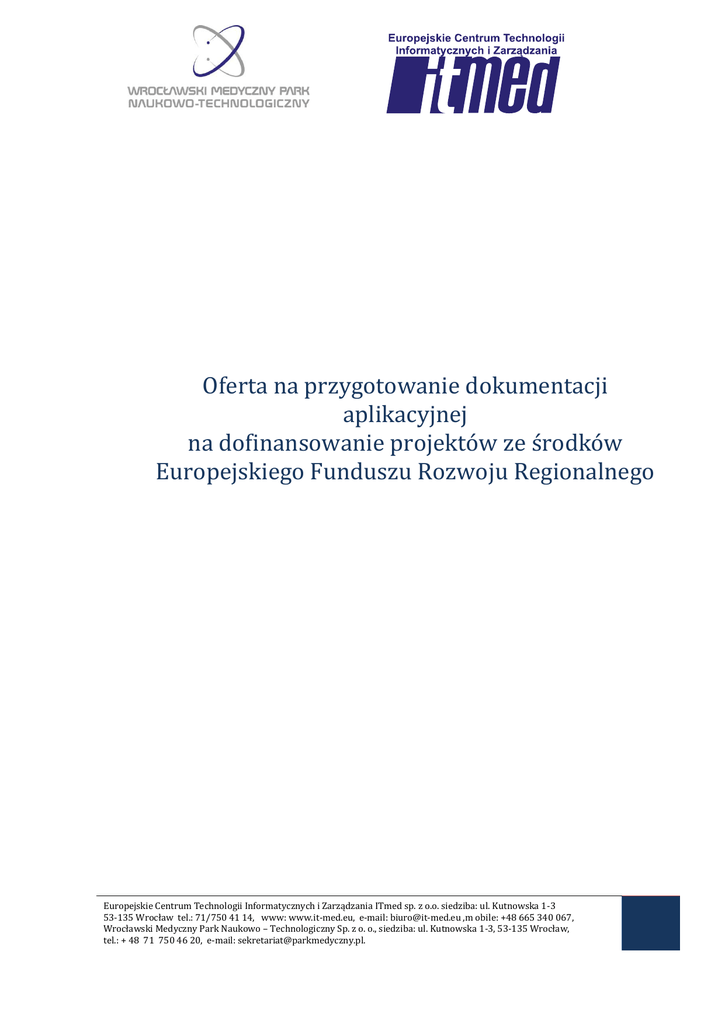 Oferta na przygotowanie dokumentacji aplikacyjnej na dofinansowanie projektów ze środków Europejskiego Funduszu Rozwoju Regionalnego Europejskie Centrum Technologii Informatycznych i Zarządzania ITmed sp. z o.o. siedziba: ul. Kutnowska 1-3 1 53-135 Wrocław tel.: 71/750 41 14, www: www.it-med.eu, e-mail: [email protected] ,m obile: +48 665 340 067, Wrocławski Medyczny Park Naukowo – Technologiczny Sp. z o. o., siedziba: ul. Kutnowska 1-3, 53-135 Wrocław, tel.: + 48 71 750 46 20, e-mail: [email protected]. Wrocław, dnia 06.11.2012 r. Szanowni Państwo, konsorcjum spółek Europejskie Centrum Technologii Informatycznych i Zarządzania ITmed Sp. z o.o. oraz Wrocławski Medyczny Park Naukowo-Technologiczny Sp. z o.o. ma przyjemność przedstawić Państwu ofertę dotyczącą przygotowania kompletnej dokumentacji aplikacyjnej na dofinansowanie projektów ze środków Europejskiego Funduszu Rozwoju Regionalnego w ramach Priorytet VIII Społeczeństwo Informacyjne - Zwiększenie Innowacyjności Gospodarki Działanie 8.1. Wsparcie działalności gospodarczej w dziedzinie gospodarki elektronicznej Programu Operacyjnego Innowacyjna Gospodarka na lata 2007-2013. Z wyrazami szacunku, Anna Ziętek-Fidecka/ Prezes Zarządu ITMED Sp. z o.o. Marek Girek/ Prezes Zarządu WMPNT Sp. z o.o. Data wydruku: 7 listopada 2012 2/25 Spis treści 1. Wstęp .................................................................................................................................................... 4 2. Informacje o konkursie w ramach Działania 8.1... ................................................................ 5 3. Zaproszenie do współpracy z konsorcjum spółek ITMED Sp. z o.o., WMPNT Sp.z o.o.6 4. Informacje cenowe .......................................................................................................................... 7 5. O ITMED Sp. z o.o., WMPNT Sp. z o.o. .......................................................................................... 8 6.Referencje ..........................................................................................................................................11 6.1. Referencje ITMED Sp. z o.o. ................................................................................................11 6.2. Referencje WMPNT Sp. z o.o. .............................................................................................18 Data wydruku: 7 listopada 2012 3/25 1. Wstęp W ramach priorytetu VIII wspierane są działania w zakresie tworzenia usług elektronicznych, tworzenia elektronicznej komunikacji między przedsiębiorstwami, jak również przeciwdziałania wykluczeniu cyfrowemu. Priorytet VIII jest realizowany w synergii z priorytetem VII, mającym na celu rozwój e-usług publicznych wspierających rozwój gospodarczy i zmniejszanie barier administracyjnych dla innowacyjnej działalności gospodarczej. Celem działania 8.1. PO IG jest stymulowanie rozwoju rynku usług świadczonych w formie elektronicznej (e-usług) poprzez wsparcie mikro- i małych przedsiębiorców. Dofinansowaniem objęte zostaną projekty polegające na świadczeniu e-usługi. Projekt może również obejmować wytworzenie produktów cyfrowych, koniecznych do świadczenia e-usługi. Data wydruku: 7 listopada 2012 4/25 2. Informacje o konkursie w ramach Działania 8.2. W ramach Działania 8.1 przewidziano dofinansowanie w dziedzinie gospodarki elektronicznej z przeznaczeniem na realizację projektów polegających na świadczeniu e-usługi, przy czym projekty te mogą obejmować wytworzenie produktów cyfrowych koniecznych do świadczenia e-usługi. Projekty mogą być objęte wsparciem przez okres nie dłuższy niż 24 miesiące. Wymaganym produktem projektu kwalifikowanego do wsparcia jest przygotowanie, wdrożenie i świadczenie co najmniej jednej nowej e-usługi. Termin naboru wniosków: 19 listopada 2012 r. do 14 grudnia 2012 r. O dofinansowanie w ramach Działania 8.1 mogą ubiegać się mikro przedsiębiorcy lub mali przedsiębiorcy posiadający siedzibę na terytorium Rzeczypospolitej Polskiej, a w przypadku przedsiębiorcy będącego osobą fizyczną – miejsce zamieszkania na terytorium Rzeczypospolitej Polskiej, którzy złożą wniosek o udzielenie wparcia: A) nie później niż przed upływem 1 roku od dnia: uzyskania wpisu przedsiębiorcy do Krajowego Rejestru Sądowego, licząc od dnia tego wpisu, albo rozpoczęcia działalności gospodarczej zgodnie z zaświadczeniem z Ewidencji Działalności Gospodarczej lub Centralnej Ewidencji i Informacji o Działalności Gospodarczej, licząc od dnia rozpoczęcia działalności gospodarczej, B) po upływie 1 roku i nie później niż przed upływem 2 lat od dnia: uzyskania wpisu przedsiębiorcy do Krajowego Rejestru Sądowego, licząc od dnia tego wpisu, albo rozpoczęcia działalności gospodarczej zgodnie z zaświadczeniem z Ewidencji Działalności Gospodarczej lub Centralnej Ewidencji i Informacji o Działalności Gospodarczej, licząc od dnia rozpoczęcia działalności gospodarczej, pod warunkiem, że siedziba, a w przypadku osoby fizycznej - miejsce zamieszkania, mikro przedsiębiorcy lub małego przedsiębiorcy, znajduje się na terenie jednego z następujących województw: Data wydruku: 7 listopada 2012 dolnośląskiego, łódzkiego, małopolskiego, mazowieckiego, opolskiego, 5/25 podkarpackiego, podlaskiego, pomorskiego, śląskiego, świętokrzyskiego, warmińsko- mazurskiego, zachodniopomorskiego. Dofinansowanie może zostać udzielone wnioskodawcy, który złożył nie więcej niż jeden wniosek o udzielenie wsparcia w ramach danego konkursu. Możliwość aplikowania nie dotyczy spółek kapitałowych w organizacji. Wielkość wsparcia zgodnego z zasadami pomocy de minimis może wynosić do 70 % wydatków kwalifikujących się do objęcia wsparciem. W przypadku mikro przedsiębiorcy lub małego przedsiębiorcy będącego osobą fizyczną, który w roku złożenia wniosku o udzielenie wsparcia ma nie