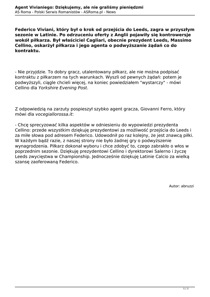 Agent Vivianiego: Dziękujemy, ale nie graliśmy pieniędzmi AS Roma - Polski Serwis Romanistów - ASRoma.pl - News Federico Viviani, który był o krok od przejścia do Leeds, zagra w przyszłym sezonie w Latinie. Po odrzuceniu oferty z Anglii pojawiły się kontrowersje wokół piłkarza. Był właściciel Cagliari, obecnie prezydent Leeds, Massimo Cellino, oskarżył piłkarza i jego agenta o podwyższanie żądań co do kontraktu. - Nie przyjdzie. To dobry gracz, utalentowany piłkarz, ale nie można podpisać kontraktu z piłkarzem na tych warunkach. Wyszli od pewnych żądań: potem je podwyższyli, ciągle chcieli więcej, na koniec powiedziałem "wystarczy" - mówi Cellino dla Yorkshire Evening Post. Z odpowiedzią na zarzuty pospieszył szybko agent gracza, Giovanni Ferro, który mówi dla vocegiallorossa.it: - Chcę sprecyzować kilka aspektów w odniesieniu do wypowiedzi prezydenta Cellino: przede wszystkim dziękuję prezydentowi za możliwość przejścia do Leeds i za miłe słowa pod adresem Federico. Udowodnił po raz kolejny, że jest znawcą piłki. W każdym bądź razie, z naszej strony nie było żadnej gry o podwyższenie wynagrodzenia. Piłkarz dokonał wyboru i chce zdobyć to, czego zabrakło o włos w poprzednim sezonie. Dziękuję prezydentowi Cellino i dyrektorowi Salerno i życzę Leeds zwycięstwa w Championship. Jednocześnie dziękuję Latinie Calcio za wielką szansę zaoferowaną Federico. Autor: abruzzi 1/1 Powered by TCPDF (www.tcpdf.org)