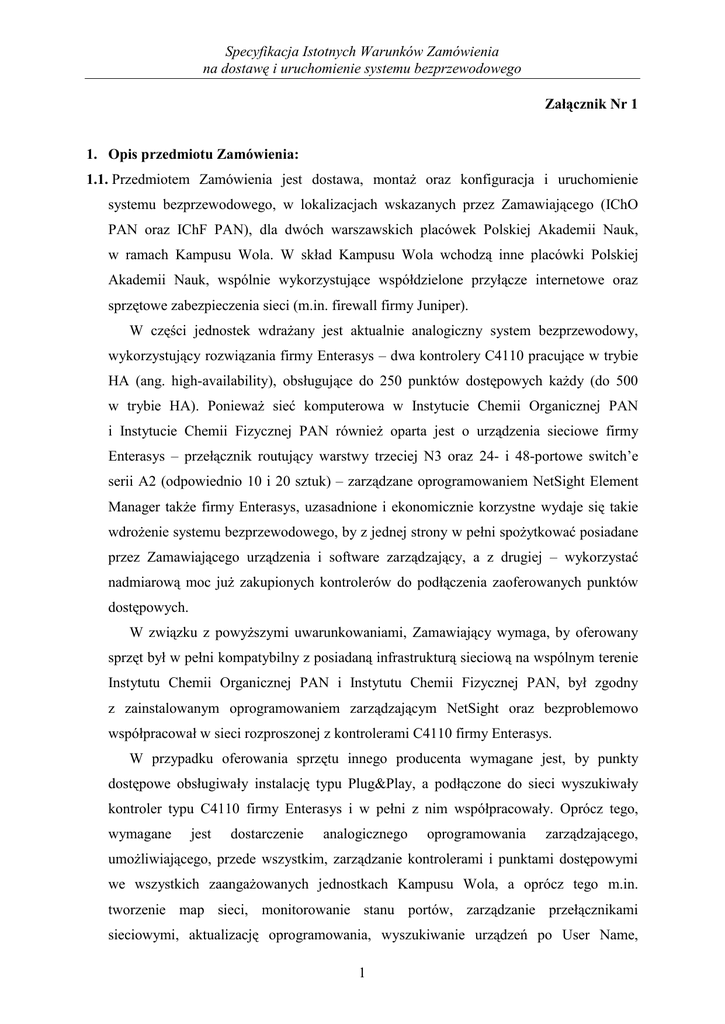 Specyfikacja Istotnych Warunków Zamówienia na dostawę i uruchomienie systemu bezprzewodowego Załącznik Nr 1 1. Opis przedmiotu Zamówienia: 1.1. Przedmiotem Zamówienia jest dostawa, montaż oraz konfiguracja i uruchomienie systemu bezprzewodowego, w lokalizacjach wskazanych przez Zamawiającego (IChO PAN oraz IChF PAN), dla dwóch warszawskich placówek Polskiej Akademii Nauk, w ramach Kampusu Wola. W skład Kampusu Wola wchodzą inne placówki Polskiej Akademii Nauk, wspólnie wykorzystujące współdzielone przyłącze internetowe oraz sprzętowe zabezpieczenia sieci (m.in. firewall firmy Juniper). W części jednostek wdrażany jest aktualnie analogiczny system bezprzewodowy, wykorzystujący rozwiązania firmy Enterasys – dwa kontrolery C4110 pracujące w trybie HA (ang. high-availability), obsługujące do 250 punktów dostępowych każdy (do 500 w trybie HA). Ponieważ sieć komputerowa w Instytucie Chemii Organicznej PAN i Instytucie Chemii Fizycznej PAN również oparta jest o urządzenia sieciowe firmy Enterasys – przełącznik routujący warstwy trzeciej N3 oraz 24- i 48-portowe switch’e serii A2 (odpowiednio 10 i 20 sztuk) – zarządzane oprogramowaniem NetSight Element Manager także firmy Enterasys, uzasadnione i ekonomicznie korzystne wydaje się takie wdrożenie systemu bezprzewodowego, by z jednej strony w pełni spożytkować posiadane przez Zamawiającego urządzenia i software zarządzający, a z drugiej – wykorzystać nadmiarową moc już zakupionych kontrolerów do podłączenia zaoferowanych punktów dostępowych. W związku z powyższymi uwarunkowaniami, Zamawiający wymaga, by oferowany sprzęt był w pełni kompatybilny z posiadaną infrastrukturą sieciową na wspólnym terenie Instytutu Chemii Organicznej PAN i Instytutu Chemii Fizycznej PAN, był zgodny z zainstalowanym oprogramowaniem zarządzającym NetSight oraz bezproblemowo współpracował w sieci rozproszonej z kontrolerami C4110 firmy Enterasys. W przypadku oferowania sprzętu innego producenta wymagane jest, by punkty dostępowe obsługiwały instalację typu Plug&Play, a podłączone do sieci wyszukiwały kontroler typu C4110 firmy Enterasys i w pełni z nim współpracowały. Oprócz tego, wymagane jest dostarczenie analogicznego oprogramowania zarządzającego, umożliwiającego, przede wszystkim, zarządzanie kontrolerami i punktami dostępowymi we wszystkich zaangażowanych jednostkach Kampusu Wola, a oprócz tego m.in. tworzenie map sieci, monitorowanie stanu portów, zarządzanie przełącznikami sieciowymi, aktualizację oprogramowania, wyszukiwanie urządzeń po User Name, 1 Specyfikacja Istotnych Warunków Zamówienia na dostawę i uruchomienie systemu bezprzewodowego adresach MAC, IP, Multicast oraz wykonywanie skryptów, zarządzanie ACL na przełącznikach i routerach, zarządzanie V-LAN-ami, i inne wynikające z posiadanej przez zamawiającego aplikacji Enterasys Netsight. Niezbędnym elementem oferowanego systemu bezprzewodowego musi być uruchomienie i skonfigurowanie serwera Radius w taki sposób, by poprzez odpowiednie uwierzytelnianie użytkowników wspierał on usługę EDUROAM (szczegóły projektu: http://www.eduroam.pl/). Zamawiający udostępni maszynę wirtualną odpowiednią do obsługi serwera Radius. W ofercie należy również uwzględnić szkolenie administratorów sieci IChO PAN i IChF PAN z obsługi takiego serwera (m.in. dodawanie i zarządzanie kontami oraz uprawnieniami użytkowników). Montaż dostarczonych punktów dostępowych będzie wymagał położenia tras kablowych o szacunkowej łącznej długości 1000 m.b. (skrętka UTP 5e wewnętrzna) oraz zainstalowania kanałów kablowych naściennych o łącznej długości ok. 350 m.b. 2. Szczegółowy opis zamówienia: Dostawca musi dostarczyć oprogramowanie i urządzenia systemu bezprzewodowego WLAN spełniające poniższe wymagania minimalne: a) Oferent dostarczy upgrade posiadanego przez Zamawiającego oprogramowania NetSight Element Manager 3.1 firmy Enterasys do najnowszej wersji wraz z rozszerzeniem o możliwość zarządzania sieciami WLAN dla min. 100 punktów dostępowych, pozwalający na uruchomienie zaawansowanych usług zarządzania siecią bezprzewodową, w tym: a. tworzenie i zarządzanie szablonami konfiguracji kontrolerów C4110 firmy Enterasys; b. detekcję obcych punktów dostępowych; c. wyświetlanie tzw. "Heat map" w trybie snapshot; d. usługi lokalizacyjne na bazie estymacji RSSI; lub dostarczy analogiczne oprogramowanie zapewniające podobną funkcjonalność, z uwzględnieniem wymogów opisanych w pkt. 1.1. b) Oferent dostarczy 13 punktów dostępowych typu Enterasys AP3610 do zastosowań wewnętrznych z zintegrowanymi antenami wewnętrznymi, obsługujących technologie łączności bezprzewodowej 802.11a (5 GHz) i 802.11b/g/n (2.4 GHz) wraz 2 Specyfikacja Istotnych Warunków Zamówienia na dostawę i uruchomienie systemu bezprzewodowego z licencjami, niezbędnymi do prawidłowej współpracy oferowanych punktów dostępowych z kontrolerami C4110 firmy Enterasys. c) Oferent dostarczy 14 punktów dostępowych typu Enterasys AP3620 do zastosowań wewnętrznych z antenami zewnętrznymi, obsługujących technologie łączności bezprzewodowej 802.11a (5 GHz) i 802.11b/g/n (2.4 GHz). Nie jest wymagane dostarczenie licencji niezbędnych do prawidłowej współpracy z kontrolerami C4110 firmy Enterasys, ponieważ kontroler, do którego zostaną przyłączone punkty dostępowe, posiada własne, niewykorzystane jeszcze licencje. Oferowane punkty dostępowe muszą: obsługiwać instalację typu Plug&Play; być zasilane poprzez kabel sygnałowy Ethernet zgodnie ze standardem IEEE 802.3af lub 802.3at, a także muszą być dostarczone wraz z zasilaczami 230V zasilającymi linię Ethernet ze switch’a do punktu dostępowego w standardzie IEEE 802.3af lub 802.3at (powerinjector) lub switch’ami zarządzalnymi posiadającymi min. 7 portów 1Gb/s, obsługującymi V-LAN-y oraz standard IEEE 802