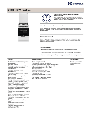 EKK75455KW Kuchnia Pełna kontrola nad pieczeniem z niewielką pomocą zegara Użyj tego zegara, aby ułatwić sobie pracę w kuchni. Wystarczy, że ustawisz czas pieczenia, aby piekarnik włączył i wyłączył się automatycznie. Łatwe do wyczyszczenia szklane drzwi Dzięki pomysłowej konstrukcji tej kuchenki można całkowicie wymontować wewnętrzną szybę z drzwi jej piekarnika. Znacząco ułatwia to jego dokładne wyczyszczenie. Stabilny dopływ ciepła Dzięki wygodnym rusztom masz pewność, że Twoje garnki i patelnie będą stabilne. Poza tym ruszty trzymają ciepło, więc potrawy dłużej będą miały odpowiednią temperaturę. Dodatkowe zalety: • Wielofunkcyjny piekarnik z równomiernym rozprowadzaniem ciepła • Dodatkowe miejsce na akcesoria, dokładnie tam, gdzie tego potrzebujesz • Zdejmowane drzwi piekarnika pozwalają zaoszczędzić czas na czyszczeniu Funkcje: Dane techniczne: Opis produktu: • Kuchnia z piekarnikiem elektrycznym i płytą gazową •Typ płyty: gazowa •Rodzaj pokrywy: malowana, stalowa •Pole lewe przednie: duży palnik , 3000W/102mm •Pole lewe tylne: mały palnik , 1000W/55mm •Pole prawe przednie: palnik średni , 2000W/71mm •Pole prawe tylne: średni palnik , 2000W/71mm •Typ piekarnika: elektryczny •Funkcje piekarnika: ogrzewanie dolne, nawiew + ogrzewanie górne, grill + ogrzewanie górne, grill + ogrzewanie górne + nawiew, oświetlenie, termoobieg + ogrzewanie dolne, termoobieg, ogrzewanie górne + dolne, ogrzewanie górne + dolne + nawiew powietrza •Sposób czyszczenia piekarnika: czarna emalia •Łatwe do czyszczenia drzwi piekarnika •Tylny wylot oparów z piekarnika •Pokrętło do włączania elektrycznj strefy grzejnej •Zabezpieczenie przeciwwypływowe gazu •Szuflada do przechowywania akcesoriów •Całkowita długość przewodu elektrycznego: 1,5 m • Klasa energetyczna : A •Pojemność [l] - główna komora : 54 •Wymiary (wys. x szer. x gł.) [mm] : 855x500x600 •Wysokość przy zamkniętej pokrywie : 880 •Maksymalna wysokość [mm] : 1440 •Typ płyty : gazowa •Typ piekarnika : elektryczny •Całkowity pobór mocy [W] : 3046 •Napięcie [V] : 230 •Wymagany bezpiecznik [A] : 2x16 •Kolor : biel •Kod produktu (PNC) : 943 004 879 •Kod EAN : 7332543466368 Kuchnia z piekarnikiem elektrycznym i płytą gazową.