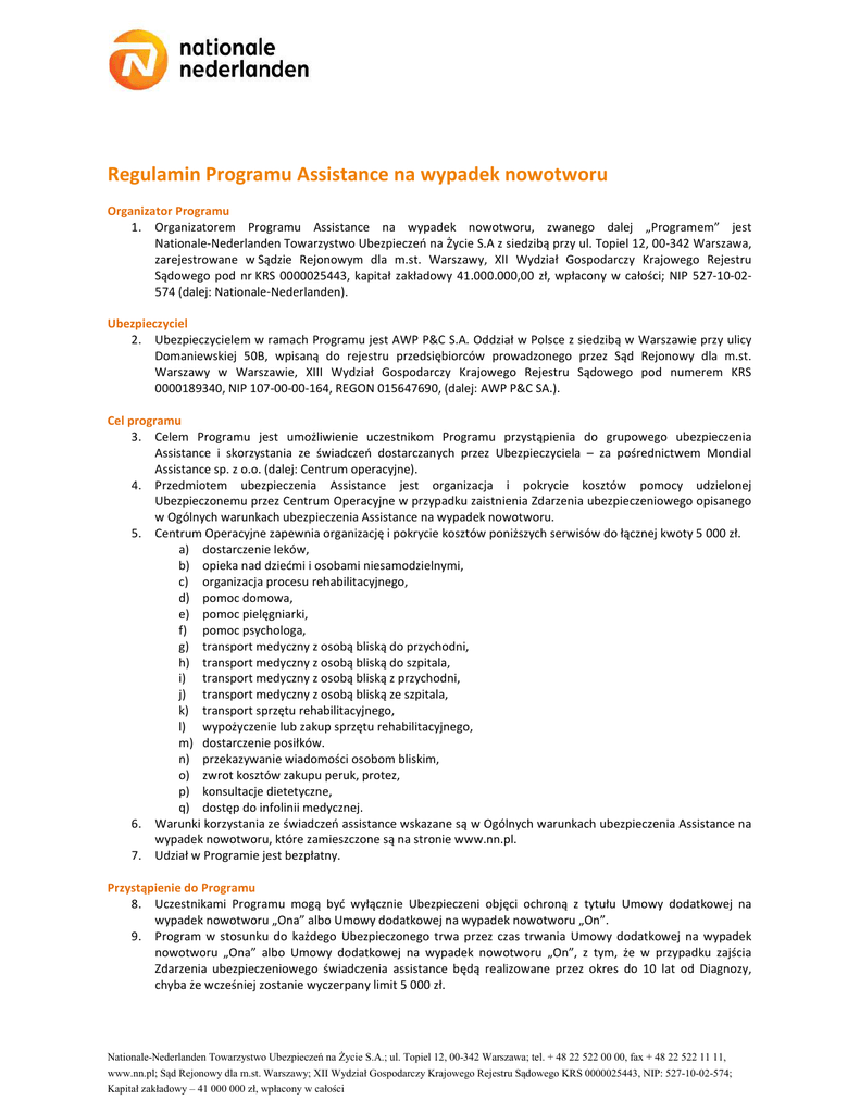 Regulamin Programu Assistance na wypadek nowotworu Organizator Programu 1. Organizatorem Programu Assistance na wypadek nowotworu, zwanego dalej „Programem” jest Nationale-Nederlanden Towarzystwo Ubezpieczeń na Życie S.A z siedzibą przy ul. Topiel 12, 00-342 Warszawa, zarejestrowane w Sądzie Rejonowym dla m.st. Warszawy, XII Wydział Gospodarczy Krajowego Rejestru Sądowego pod nr KRS 0000025443, kapitał zakładowy 41.000.000,00 zł, wpłacony w całości; NIP 527-10-02574 (dalej: Nationale-Nederlanden). Ubezpieczyciel 2. Ubezpieczycielem w ramach Programu jest AWP P&C S.A. Oddział w Polsce z siedzibą w Warszawie przy ulicy Domaniewskiej 50B, wpisaną do rejestru przedsiębiorców prowadzonego przez Sąd Rejonowy dla m.st. Warszawy w Warszawie, XIII Wydział Gospodarczy Krajowego Rejestru Sądowego pod numerem KRS 0000189340, NIP 107-00-00-164, REGON 015647690, (dalej: AWP P&C SA.). Cel programu 3. Celem Programu jest umożliwienie uczestnikom Programu przystąpienia do grupowego ubezpieczenia Assistance i skorzystania ze świadczeń dostarczanych przez Ubezpieczyciela – za pośrednictwem Mondial Assistance sp. z o.o. (dalej: Centrum operacyjne). 4. Przedmiotem ubezpieczenia Assistance jest organizacja i pokrycie kosztów pomocy udzielonej Ubezpieczonemu przez Centrum Operacyjne w przypadku zaistnienia Zdarzenia ubezpieczeniowego opisanego w Ogólnych warunkach ubezpieczenia Assistance na wypadek nowotworu. 5. Centrum Operacyjne zapewnia organizację i pokrycie kosztów poniższych serwisów do łącznej kwoty 5 000 zł. a) dostarczenie leków, b) opieka nad dziećmi i osobami niesamodzielnymi, c) organizacja procesu rehabilitacyjnego, d) pomoc domowa, e) pomoc pielęgniarki, f) pomoc psychologa, g) transport medyczny z osobą bliską do przychodni, h) transport medyczny z osobą bliską do szpitala, i) transport medyczny z osobą bliską z przychodni, j) transport medyczny z osobą bliską ze szpitala, k) transport sprzętu rehabilitacyjnego, l) wypożyczenie lub zakup sprzętu rehabilitacyjnego, m) dostarczenie posiłków. n) przekazywanie wiadomości osobom bliskim, o) zwrot kosztów zakupu peruk, protez, p) konsultacje dietetyczne, q) dostęp do infolinii medycznej. 6. Warunki korzystania ze świadczeń assistance wskazane są w Ogólnych warunkach ubezpieczenia Assistance na wypadek nowotworu, które zamieszczone są na stronie www.nn.pl. 7. Udział w Programie jest bezpłatny. Przystąpienie do Programu 8. Uczestnikami Programu mogą być wyłącznie Ubezpieczeni objęci ochroną z tytułu Umowy dodatkowej na wypadek nowotworu „Ona” albo Umowy dodatkowej na wypadek nowotworu „On”. 9. Program w stosunku do każdego Ubezpieczonego trwa przez czas trwania Umowy dodatkowej na wypadek nowotworu „Ona” albo Umowy dodatkowej na wypadek nowotworu „On”, z tym, że w przypadku zajścia Zdarzenia ubezpieczeniowego świadczenia assistance będą realizowane przez okres do 10 lat od Diagnozy, chyba że wcześniej zostanie wyczerpany limit 5 000 zł. Nationale-Nederlanden Towarzystwo Ubezpieczeń na Życie S.A.; ul. Topiel 12, 00-342 Warszawa; tel. + 48 22 522 00 00, fax + 48 22 522 11 11, www.nn.pl; Sąd Rejonowy dla m.st. Warszawy; XII Wydział Gospodarczy Krajowego Rejestru Sądowego KRS 0000025443, NIP: 527-10-02-574; Kapitał zakładowy – 41 000 000 zł, wpłacony w całości 10. Przystąpienie do Programu jest równoznaczne z przystąpieniem do grupowego ubezpieczenia Assistance na wypadek nowotworu i następuje poprzez złożenie pisemnej deklaracji przystąpienia do Programu na wniosku o ubezpieczenie. 11. Warunkiem uczestnictwa w Programie jest złożenie oświadczenia obejmującego zgodę na przetwarzanie danych osobowych przez Nationale-Nederlanden Towarzystwo Ubezpieczeń na Życie Spółka Akcyjna oraz AWP P&C SA. Oddział w Polsce w celach związanych z udzielaną ochroną ubezpieczeniową. Wyrażenie powyższej zgody jest dobrowolne, ale niezbędne do dokonania zgłoszenia do ubezpieczenia i realizacji świadczeń z tytułu ubezpieczenia Assistance na wypadek nowotworu. 12. Przystąpienie do Programu będzie oznaczało, że Uczestnik zapoznał się z postanowieniami niniejszego Regulaminu oraz Ogólnymi warunkami ubezpieczenia Assistance na wypadek nowotworu i zaakceptował je. 13. Uczestnik Programu zostanie objęty ochroną assistance z dniem rozpoczęcia odpowiedzialności NationaleNederlanden z tytułu Umowy dodatkowej na wypadek nowotworu „Ona” albo Umowy dodatkowej na wypadek nowotworu „On”. Wygaśnięcie prawa do świadczeń assistance: 14. Prawo do świadczeń assistance w stosunku do danego uczestnika Programu wygasa: a) z chwilą wyczerpania limitu 5 000 zł; b) z dniem zakończenia Programu; c) z dniem rozwiązania lub wygaśnięcia umowy grupowego ubezpieczenia Assistance zawartej pomiędzy Nationale-Nederlanden Towarzystwo Ubezpieczeń na Życie Spółka Akcyjna i AWP P&C SA. Oddział w Polsce. 15. W przypadku wygaśnięcia prawa Uczestnika do korzystania ze świadczeń assistance uczestnik z przyczyn wskazanych w pkt 14 c) Uczestnik zostanie poinformowany w formie pisemnej. Postanowienia końcowe 16. Niniejszy Regulamin wchodzi w życie 15 września 2016 r. 17. Organizator zastrzega sobie prawo do zmiany treści niniejszego Regulaminu, przedłużenia czasu obowiązywania Programu oraz do odwołania Programu bez podania przyczyn. 18. Informacja o wszelkich zmianach Regulaminu mających wpływ na prawa Uczestników Programu, o wygaśnięciu Programu oraz o zmianie Ogólnych warunków ubezpieczenia Assistance na wypadek nowotworu zostanie przesłana uczestnikom Programu oraz zostanie umieszczona na stronie www.nn.pl. 19. Wszelkie roszczenia związane z realizacją świadczeń assistance w ramach ubezpieczenia, o którym mowa w pkt 4 i 5 Uczestnik programu zobowiązany jest zgłaszać bezpośrednio do AWP P&C SA. Oddział w Polsce ul. Domaniewska 50B w Warszawie, nr tel. 022 563 11 05. Dane osobowe 20. Dane osobowe uzyskane od Uczest
